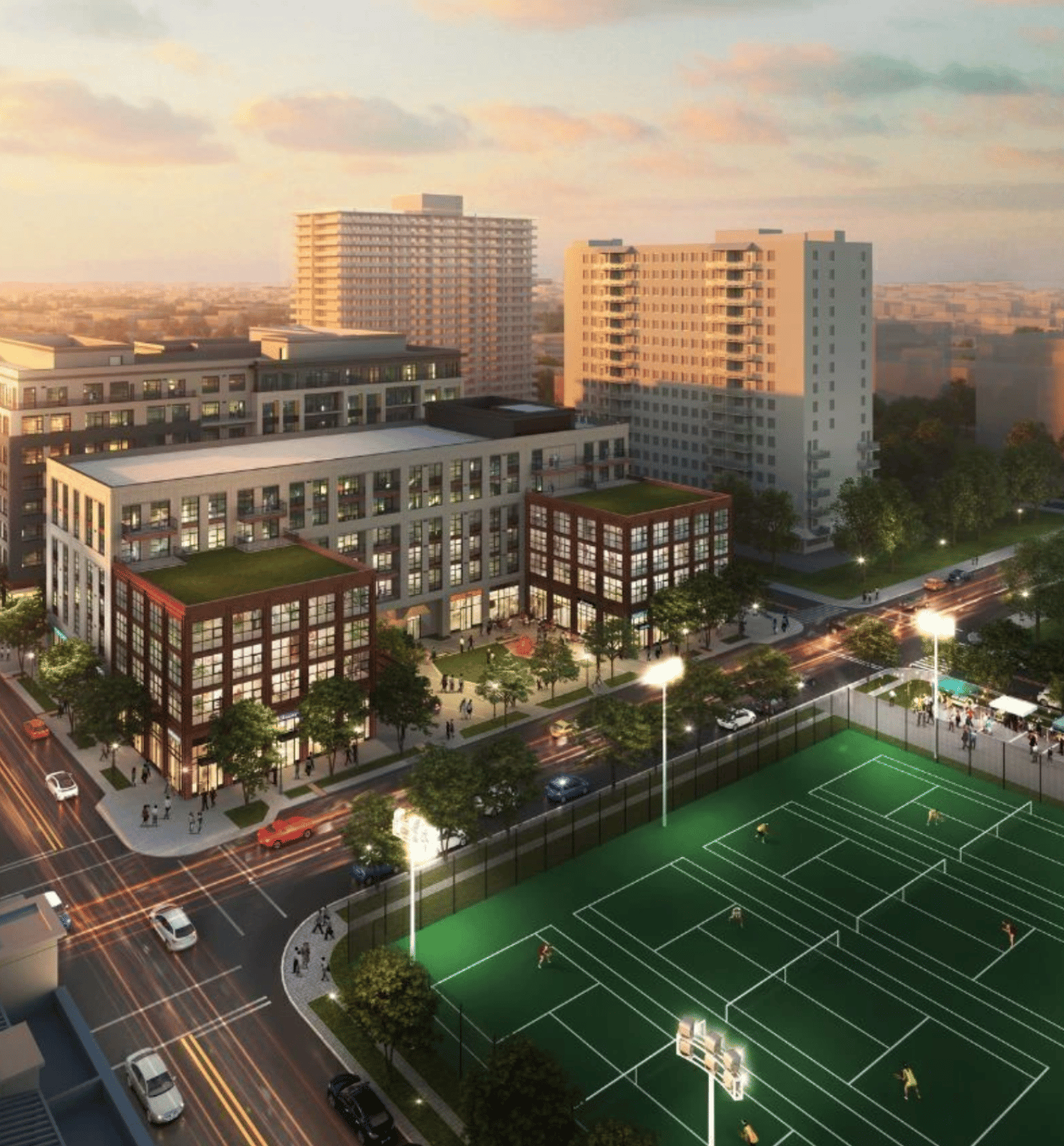 Encompassing an entire city block, the Montgomery Center redevelopment will bring a mix of residential, retail, and arts spaces to Old Town North. The project includes 327 residential units, 22 affordable housing units, 25,263 square feet of retail, and 13,321 square feet of arts and cultural space. Two publicly accessible plazas and upgraded streetscapes will enhance walkability, while sustainable features such as a 3,000-square-foot solar roof and LEED Silver certification underline the city’s commitment to green design. Construction is expected to begin next year.