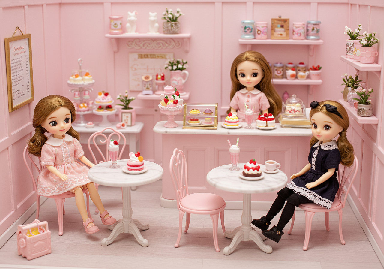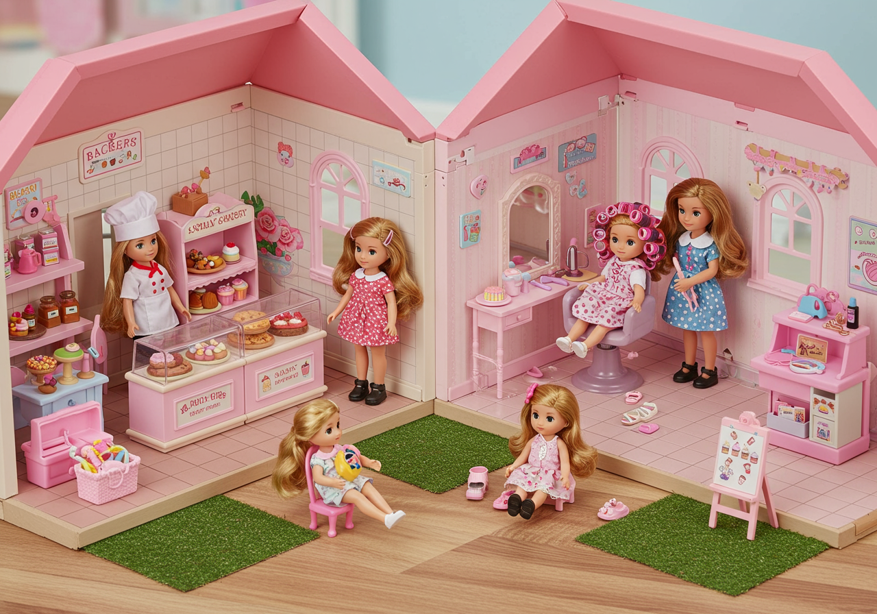 In the realm of childhood play, the dollhouse became our canvas for imagination to run wild. With miniature furniture and tiny accessories, we meticulously arranged rooms and imagined ourselves living in the cozy spaces we created. Last summer, I returned to that world, when I had the pleasure of spending a weekend with my aunt and mother on Lake Michigan. My aunt tasked us with an important project: to build an entire American Girl doll town! Yes, you read that right! The aim was to create a playroom for my aunt's little nieces when they came to visit. Each doll career and establishment had its own dedicated area – a post office, bowling alley, ski store, country-music hall, 1950s-style diner, movie theater, church, flower shop, and two sweet shops, just to name a few. We took great pride in our design – pasting wallpaper, laying faux-flooring, and meticulously taping down all the little accessories that complemented each set.