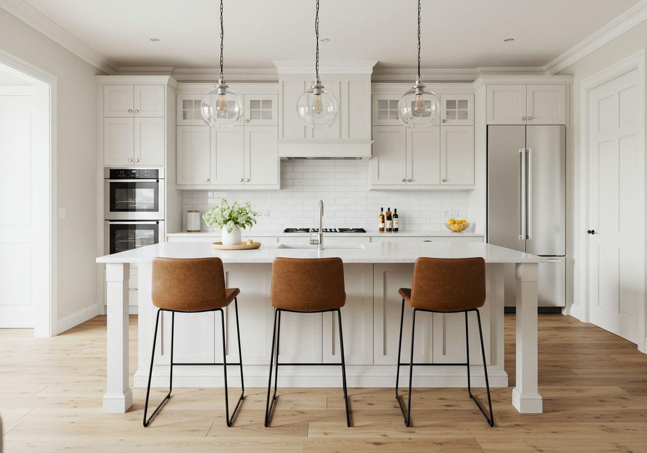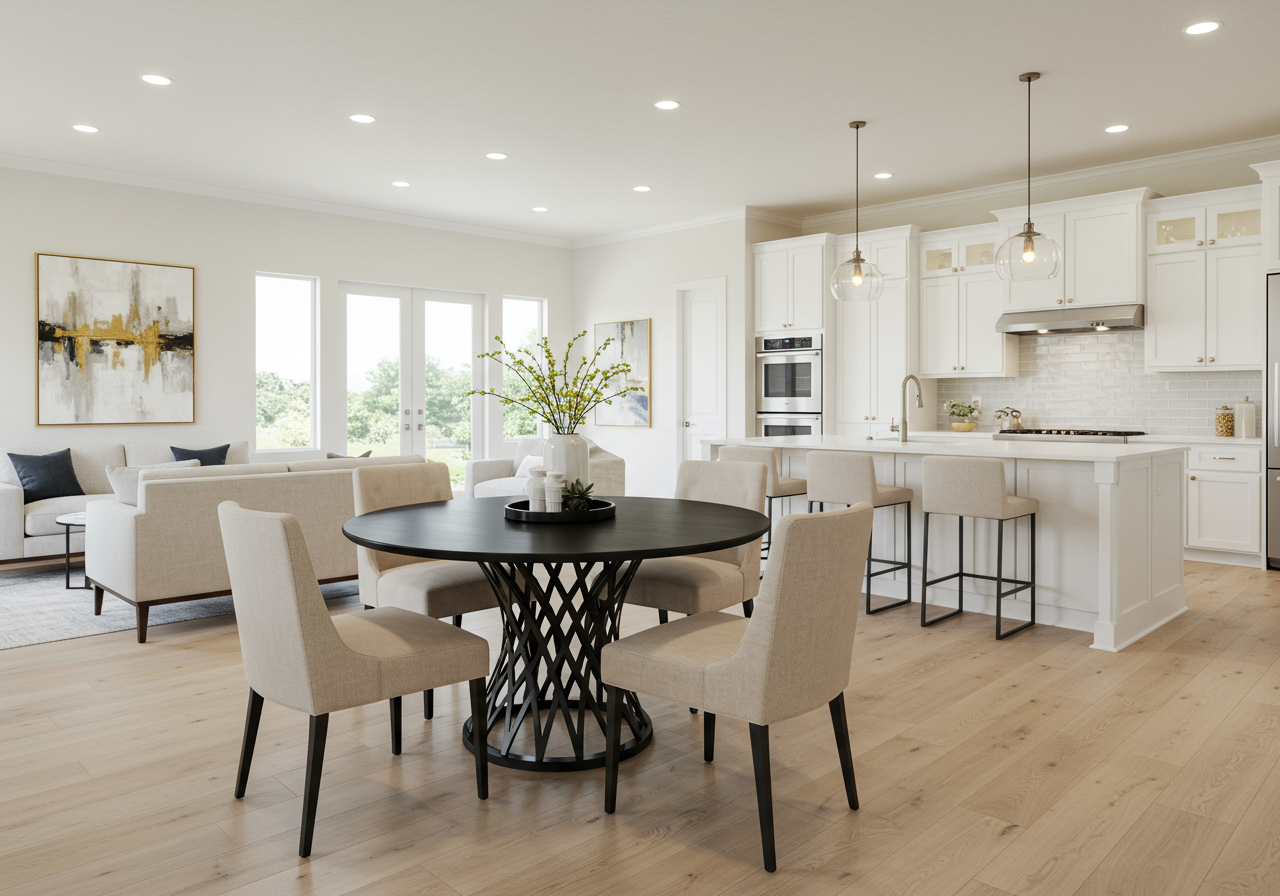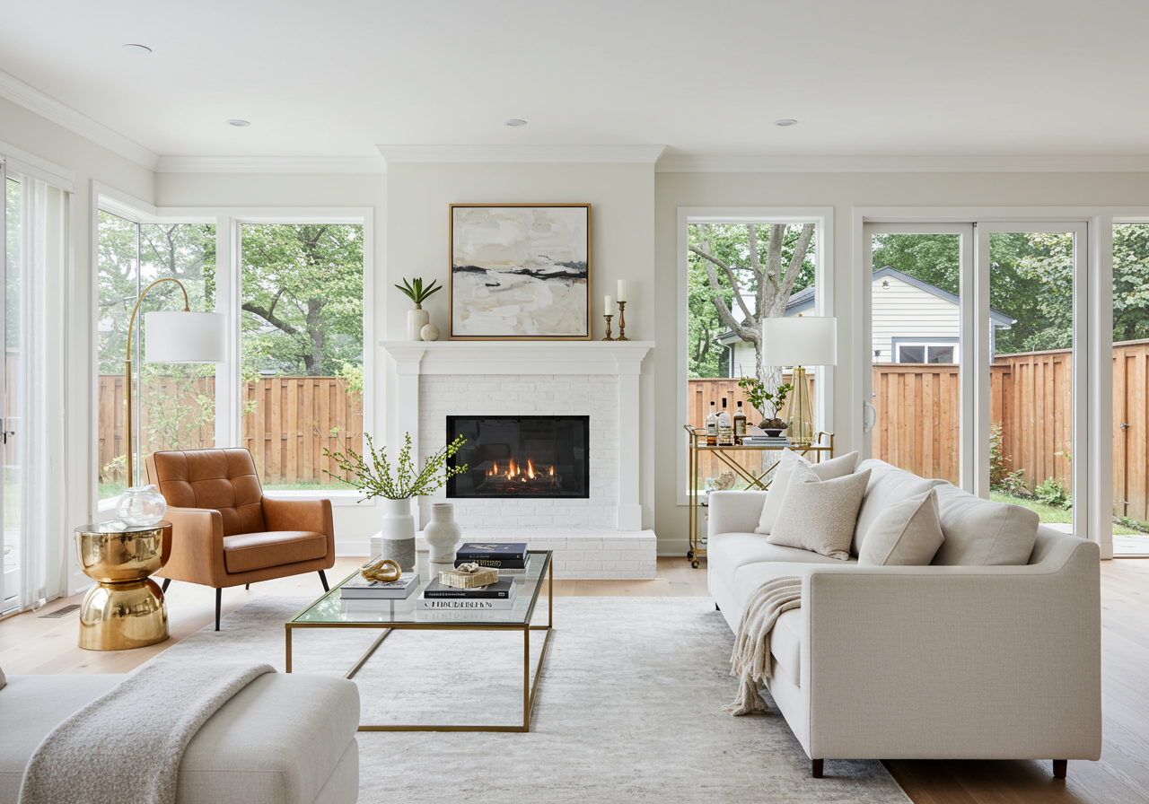 The open concept main level features a white kitchen, quartz countertops, high-end cabinetry, and Bosch appliances with island and peninsula seating. Find gorgeous four-inch white oak hardwood floors and bright natural light from its large windows throughout!