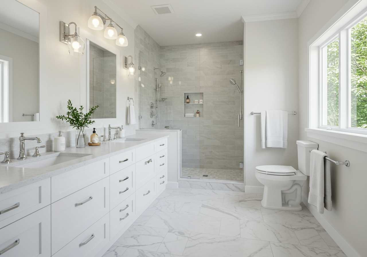 The upper-level primary bedroom includes a walk-in closet, two reach-in closets, an ensuite bathroom with dual sinks, a private toilet room, a luxury marble shower with a rain shower head, and a frameless glass shower door. The upper level also hosts two additional bedrooms, each with an ensuite bath and a laundry and linen closet in the skylighted hallway.