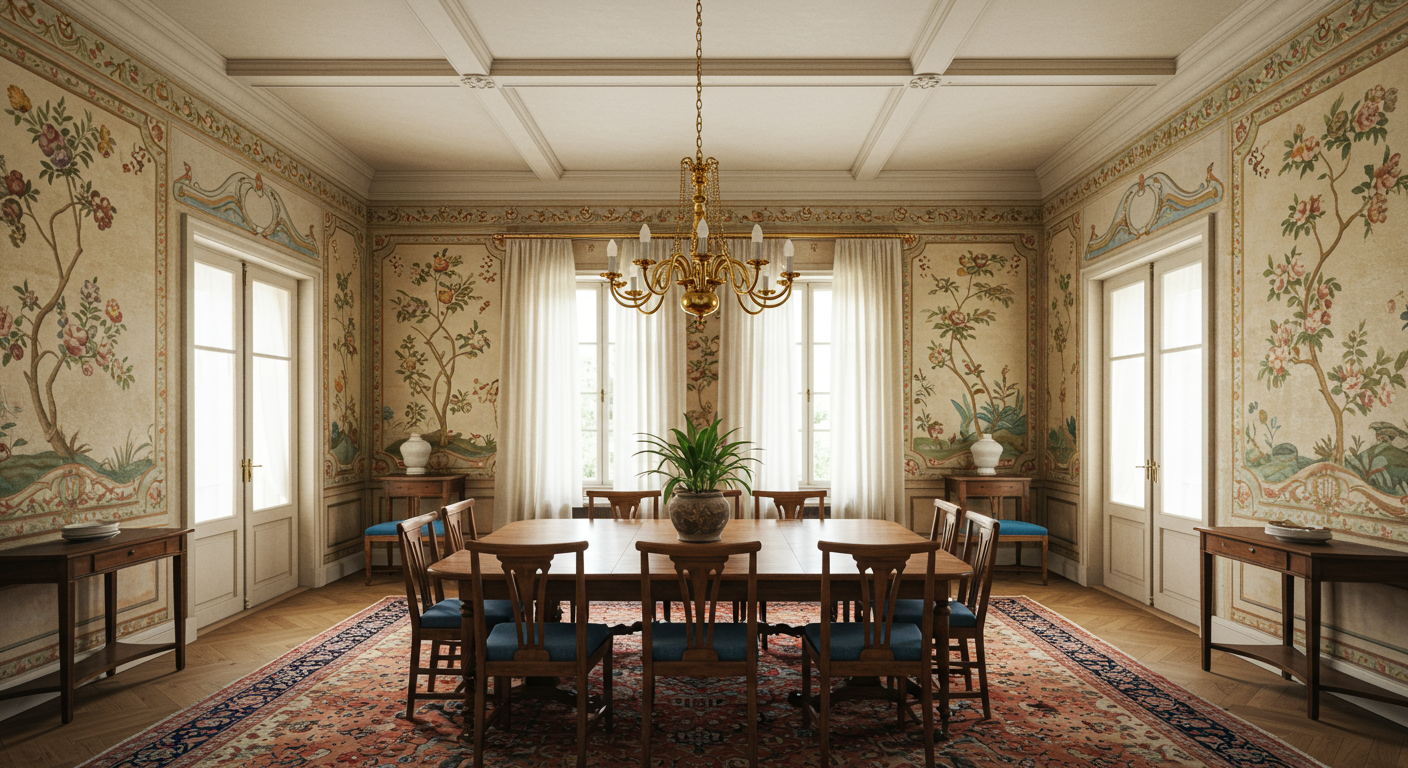 The east wing of Stratford House boasts a gracious dining room adorned with exquisite hand-painted wallpaper from Gracie Studio, featuring a stunning botanical design on a silver leaf background. French doors open to a patio, offering flexibility for hosting both intimate dinner parties and grand gatherings. This wing also includes a second octagonal sitting room with a fireplace, designed to capture the morning sun and provide the perfect setting for sipping coffee while watching the sunrise over the Potomac.