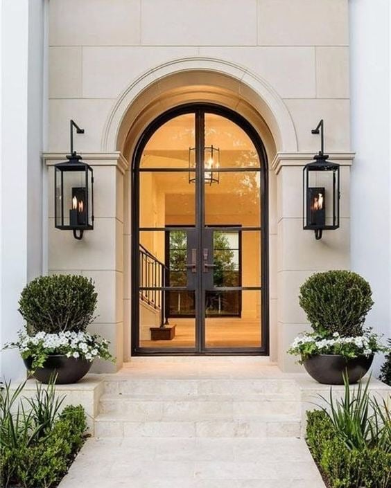 Glass front doors don’t rely on color to make a statement, and that’s exactly their appeal. Designers often associate glass doors with openness, transparency, and a strong connection between indoors and out. They invite natural light into the entryway and offer an immediate sense of warmth and visibility. From fully glazed modern designs to traditional doors with divided-light panels, glass front doors can feel welcoming without being overly revealing. Frosted, leaded, or textured glass options allow homeowners to balance privacy with brightness, making the style adaptable across architectural periods. Ultimately, a glass front door signals confidence and intention. It suggests a home that values light, clarity, and thoughtful design—and one that isn’t afraid to let a little sunshine in. Expert takeaway: Open, luminous, and effortlessly inviting.
