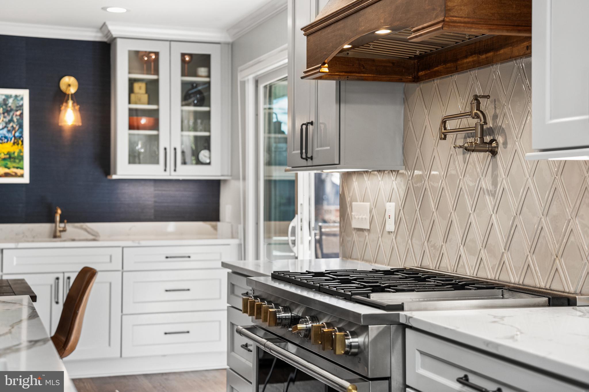 The sellers worked closely with Deluna Designs and Reico Kitchens to design an eat-in kitchen that blends warmth and character with modern functionality. GE Monogram appliances including a 48 inch gas range and 42 inch refrigerator. A custom wood hood, 10 foot island, pot filler, 2 sinks, beverage fridge and separate ice maker are a few additional highlights. An original exposed brick wall, dramatic skylight, and a cozy wood-burning fireplace create a space that feels both elevated and welcoming. The entire main level showcases hardwood floors, recessed lighting, while the dining room opens to a sliding glass door to the Trex deck, seamlessly connecting indoor living with the backyard oasis beyond.
