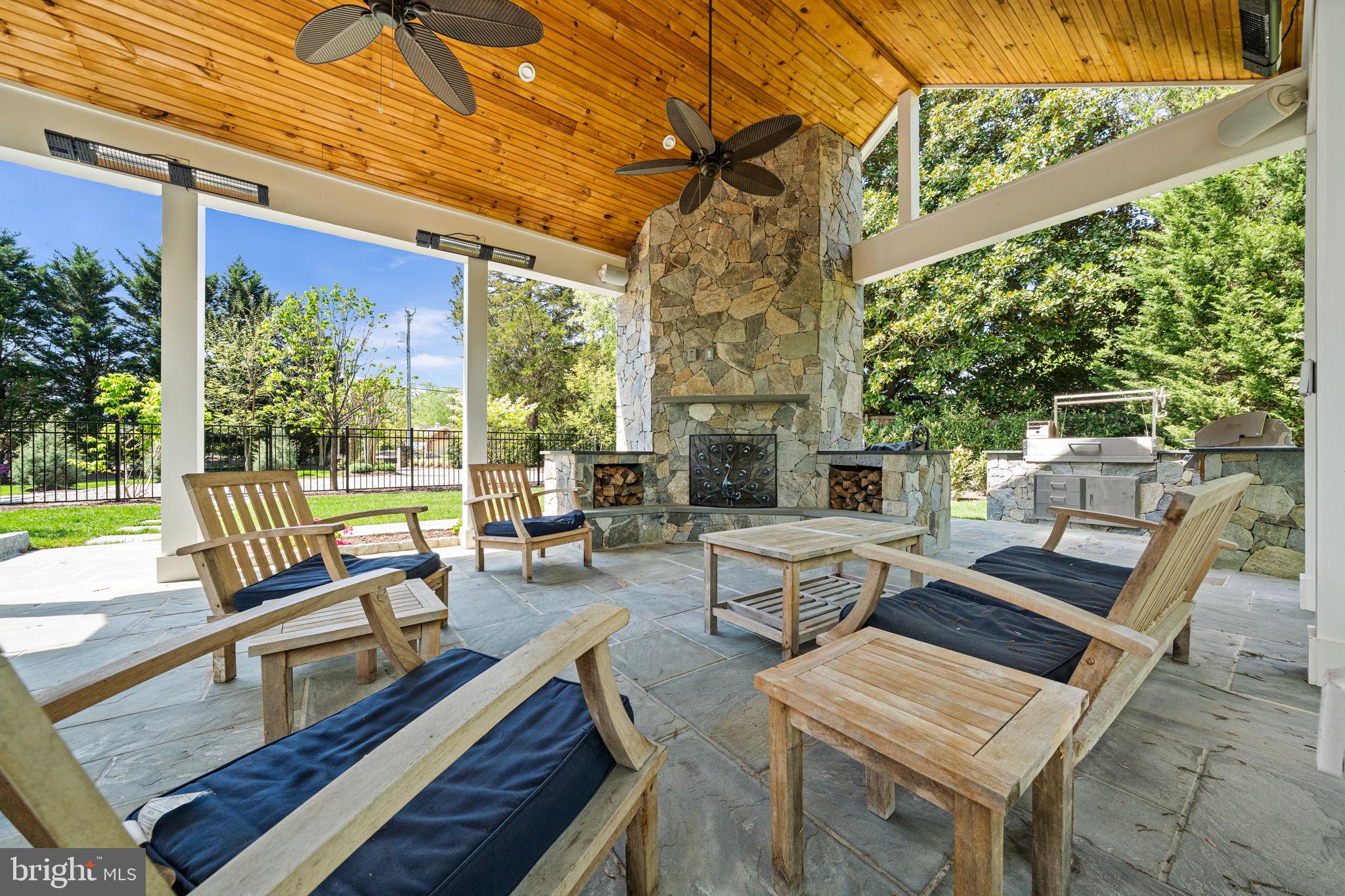 Mature gardens, layered stonework, and manicured grounds frame a resort-style, heated saltwater pool, fully refreshed with new gunite and equipment in 2023. This inviting centerpiece is complemented by an extraordinary outdoor pavilion that rivals a premier entertainment venue. Designed for year-round use, the pavilion features dual built-in grills--including a natural gas Bull BBQ with infrared burner and a Santa Maria Argentine charcoal grill--along with a fireplace, integrated storage, infrared heaters, ceiling fans, and outdoor speakers, making it ideal for both intimate evenings and large-scale gatherings.