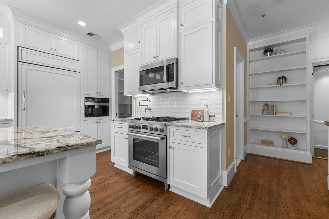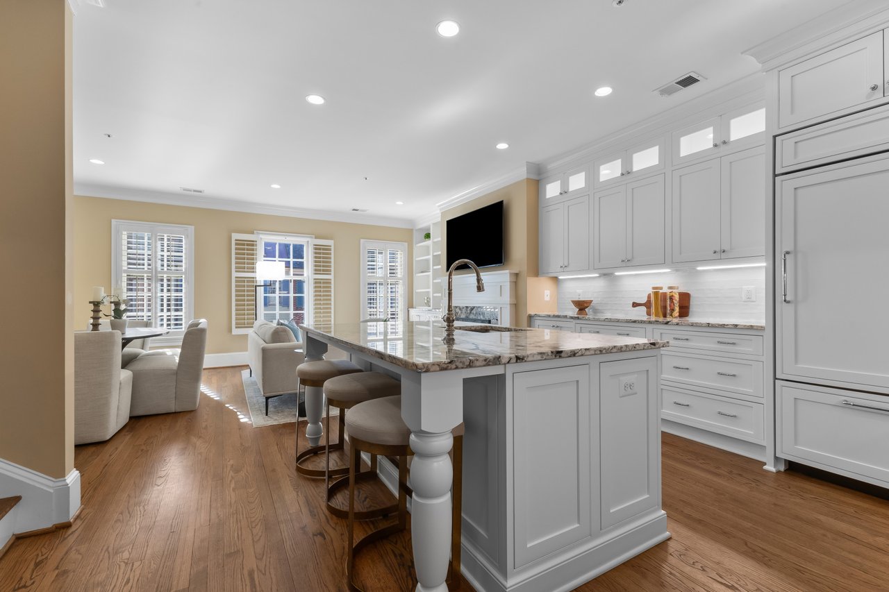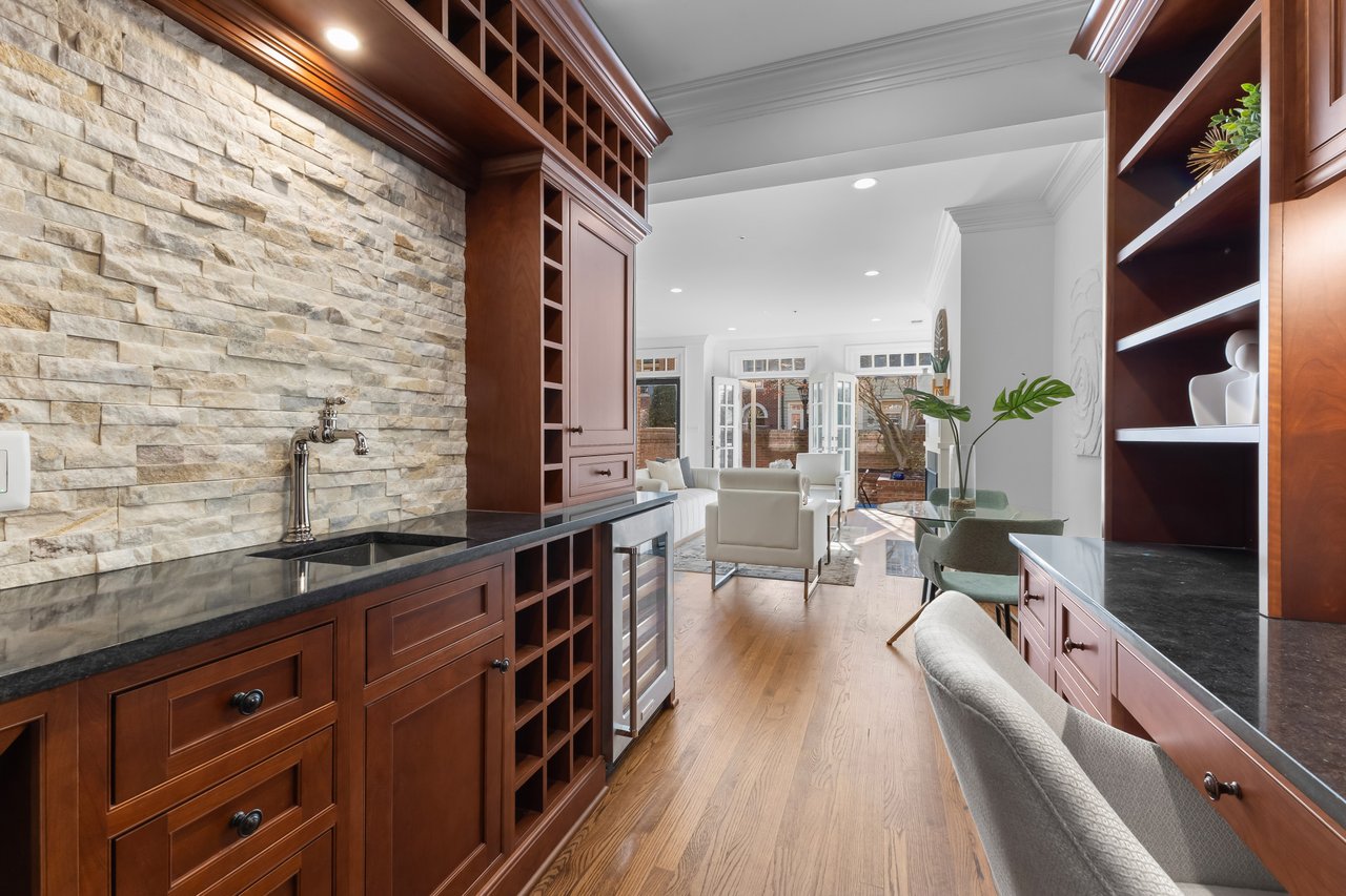 The home features three bedrooms, two full baths and two half baths, and three gas fireplaces. A recent, comprehensive renovation includes a fully reimagined chef’s kitchen with a large center island, generous walk-in pantry, custom inset cabinetry, and finely crafted millwork. Premium appliances include a Sub-Zero refrigerator, Wolf range, and Bosch dishwasher, and a Miele built-in coffee/espresso maker. Baths have been thoughtfully updated, and the redesigned lower level now offers a wine center and an integrated work-from-home space.