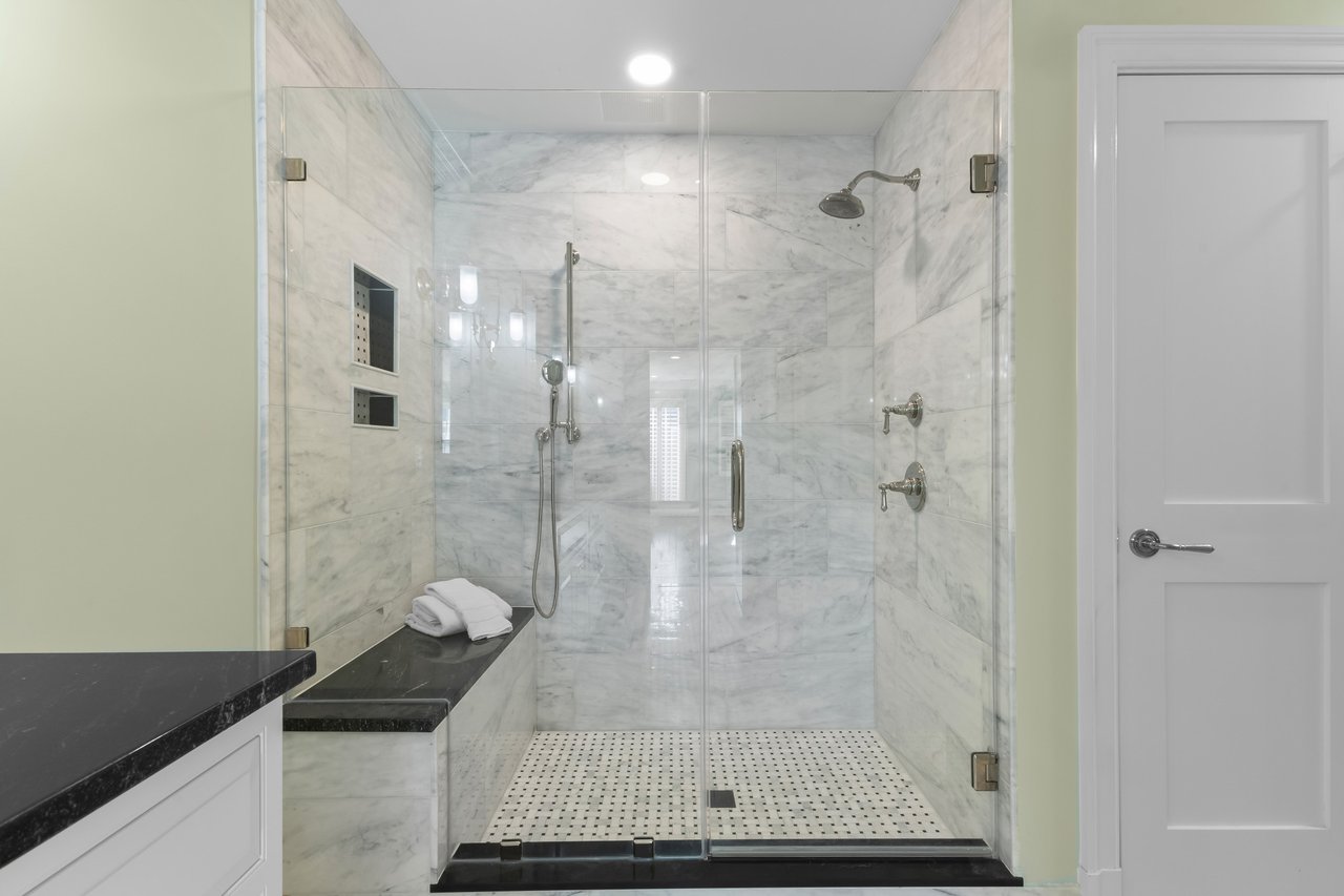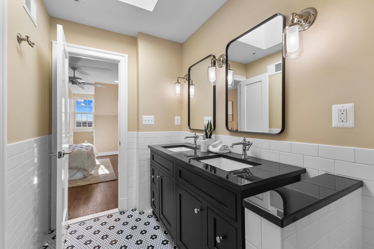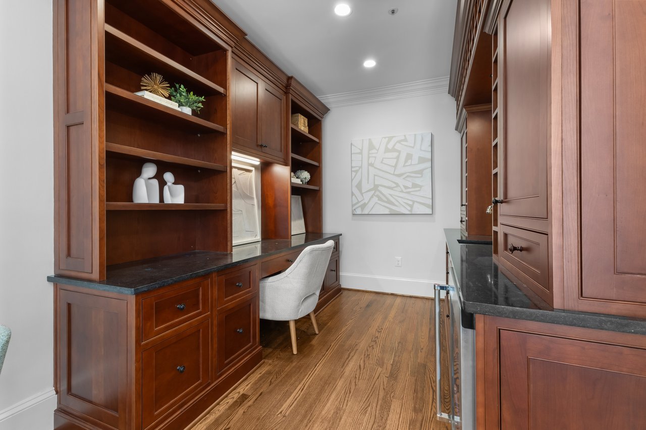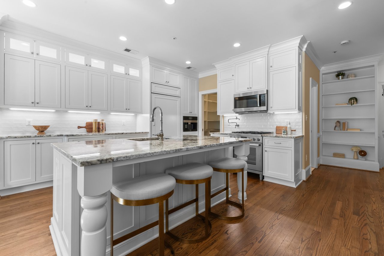 The home features three bedrooms, two full baths and two half baths, and three gas fireplaces. A recent, comprehensive renovation includes a fully reimagined chef’s kitchen with a large center island, generous walk-in pantry, custom inset cabinetry, and finely crafted millwork. Premium appliances include a Sub-Zero refrigerator, Wolf range, and Bosch dishwasher, and a Miele built-in coffee/espresso maker. Baths have been thoughtfully updated, and the redesigned lower level now offers a wine center and an integrated work-from-home space.