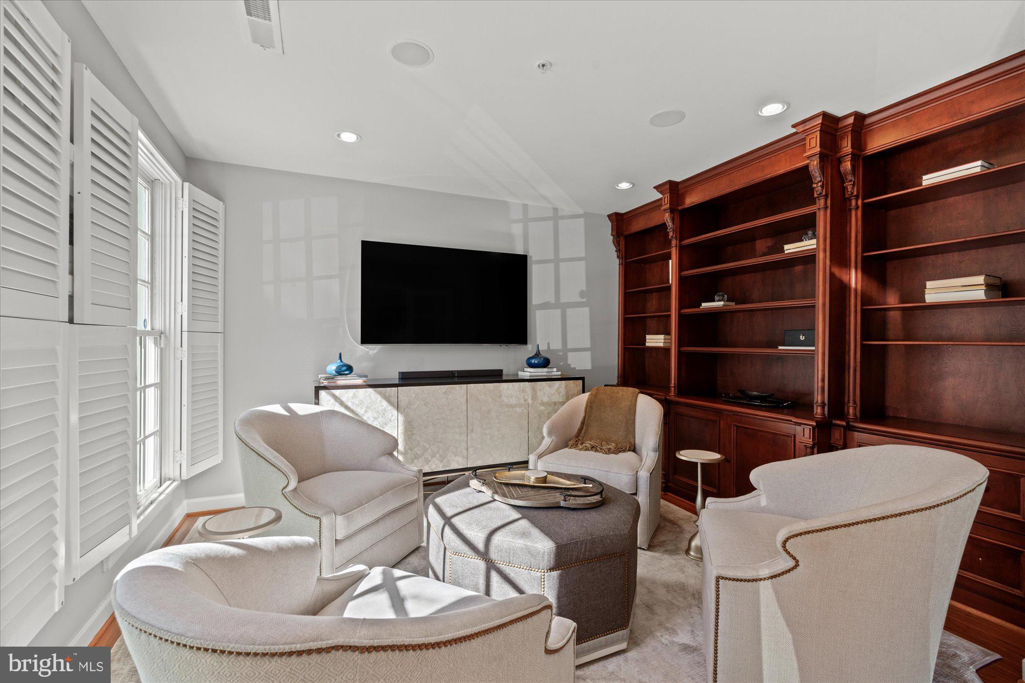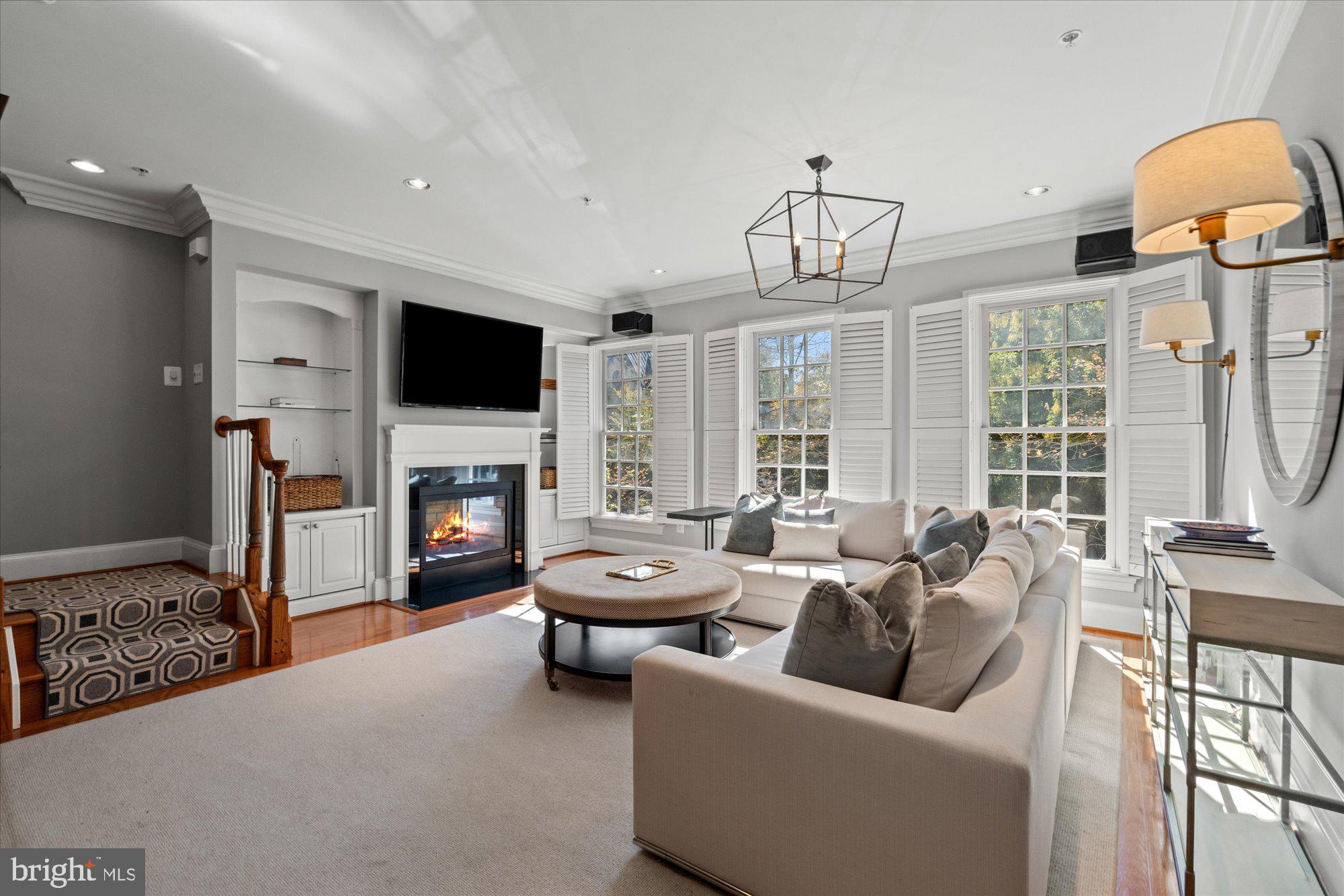 The southeast-facing home welcomes you with a bright foyer and a main-level office featuring built-in bookshelves and glass doors, setting the tone for the residence's elegant design. Upstairs, an airy family room with large windows and a gas fireplace framed by built-in bookshelves offers a warm, inviting space, complemented by designer wallpaper and stylish designer lighting. The spacious dining area effortlessly accommodates holiday gatherings, while the adjacent chef's kitchen is a true centerpiece, boasting stainless steel appliances, a center island, and a sun-drenched breakfast nook--perfect for morning coffee or casual meals.