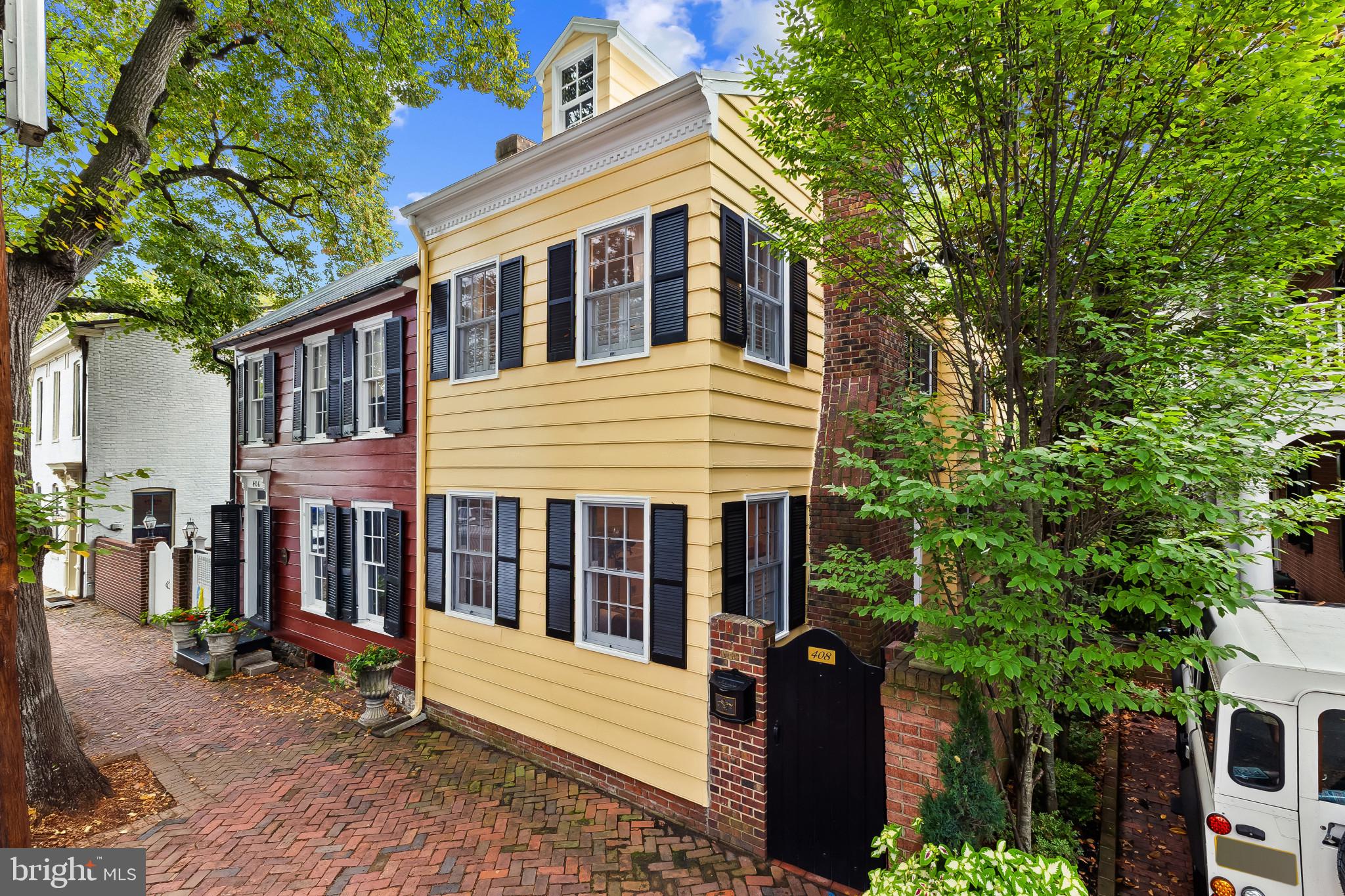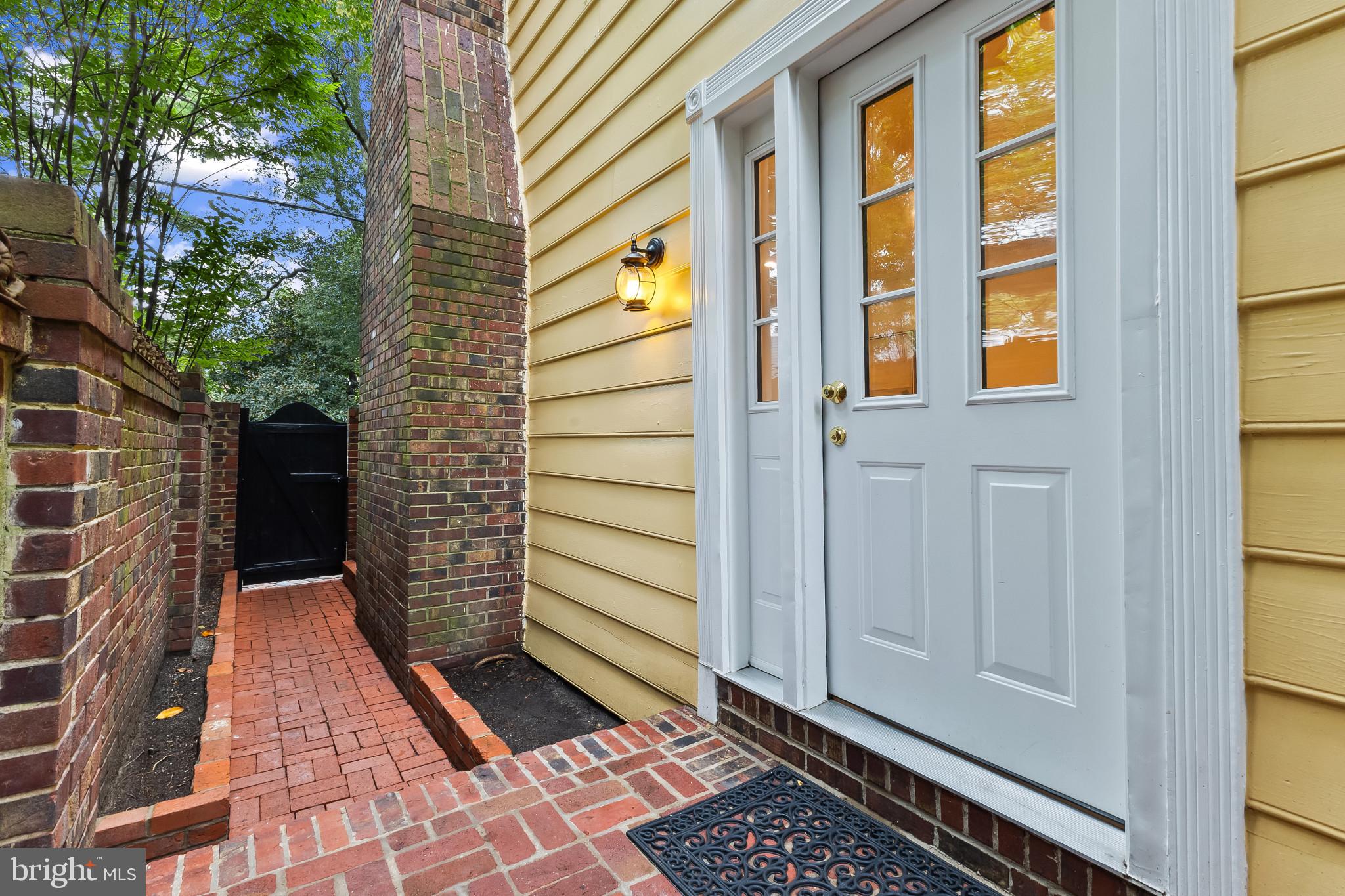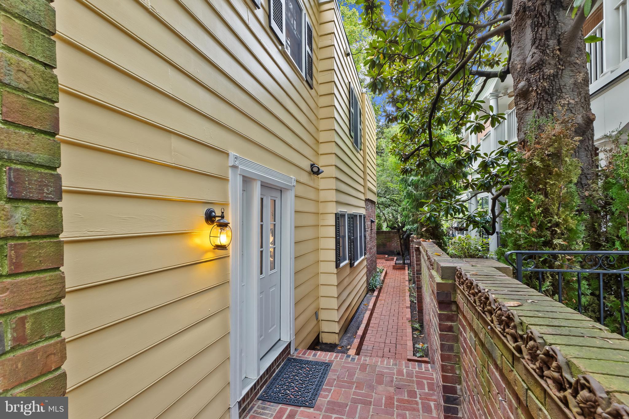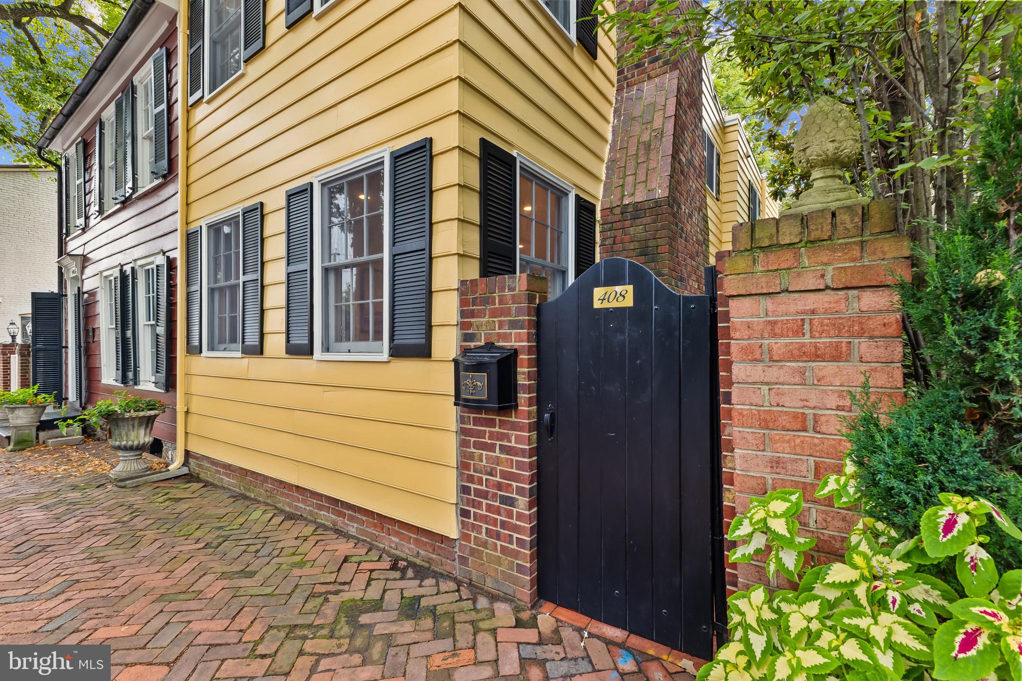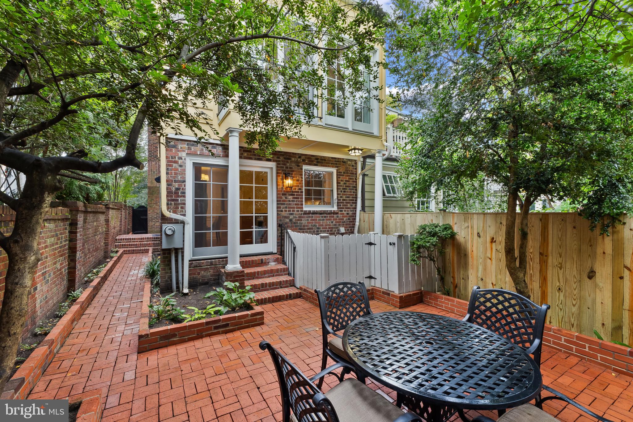 A semi-detached property on a tree-lined street in highly coveted SE quadrant of Historic Old Town. A private gated entrance welcomes you to a brick terrace and lovely outdoor space with mature trees. This historic 1850s home exudes charm at every turn, original wide-pine flooring, hand-carved fireplace mantel, 2 large bedrooms both with ensuite bathrooms, classic dental moldings, and a deep patio with lush garden. A side entrance allows for an expansive living room with high ceilings and great windows and light. Beautifully updated kitchen features eat-in peninsula, quartz counters, designer backsplash tile, and a custom built-in pantry. A rare half bath and a deep laundry closet on the main level. An upstairs master suite expansion with French Doors overlooks the brick patio canopied by mature trees. Enjoy gorgeous tree-filled views from every window. Walk out the door and be immersed in all that Old Town has to offer., restaurants, shops and the waterfront are waiting to be discovered! Since purchasing the owner has replaced 5 Andersen French Doors, added a custom built-in pantry in the kitchen, built out a custom closet system in the primary bedroom, painted the interior and exterior top to bottom, replaced GE Washer and Dryer, resealed metal roof, added a new wood patio fence.