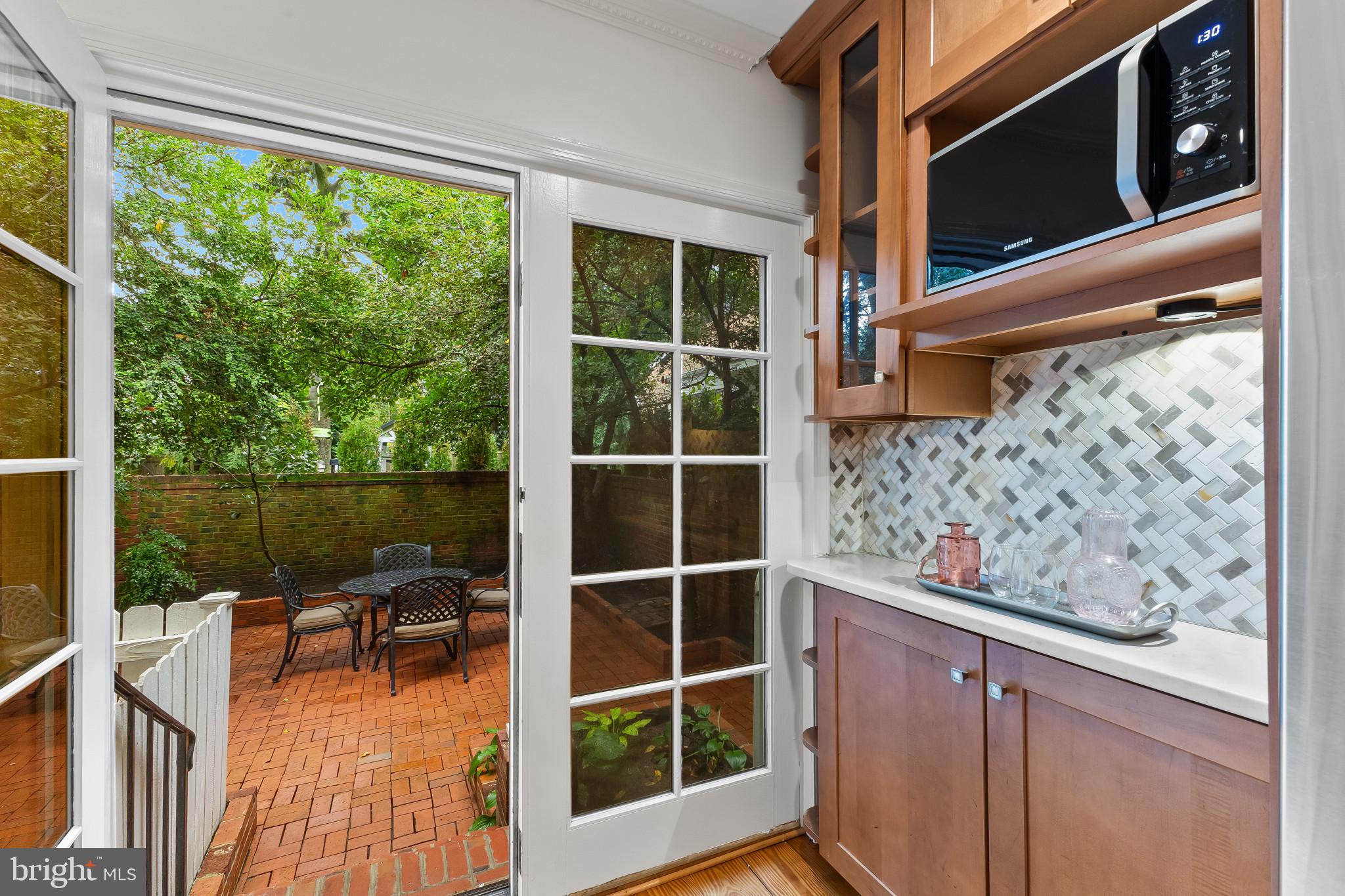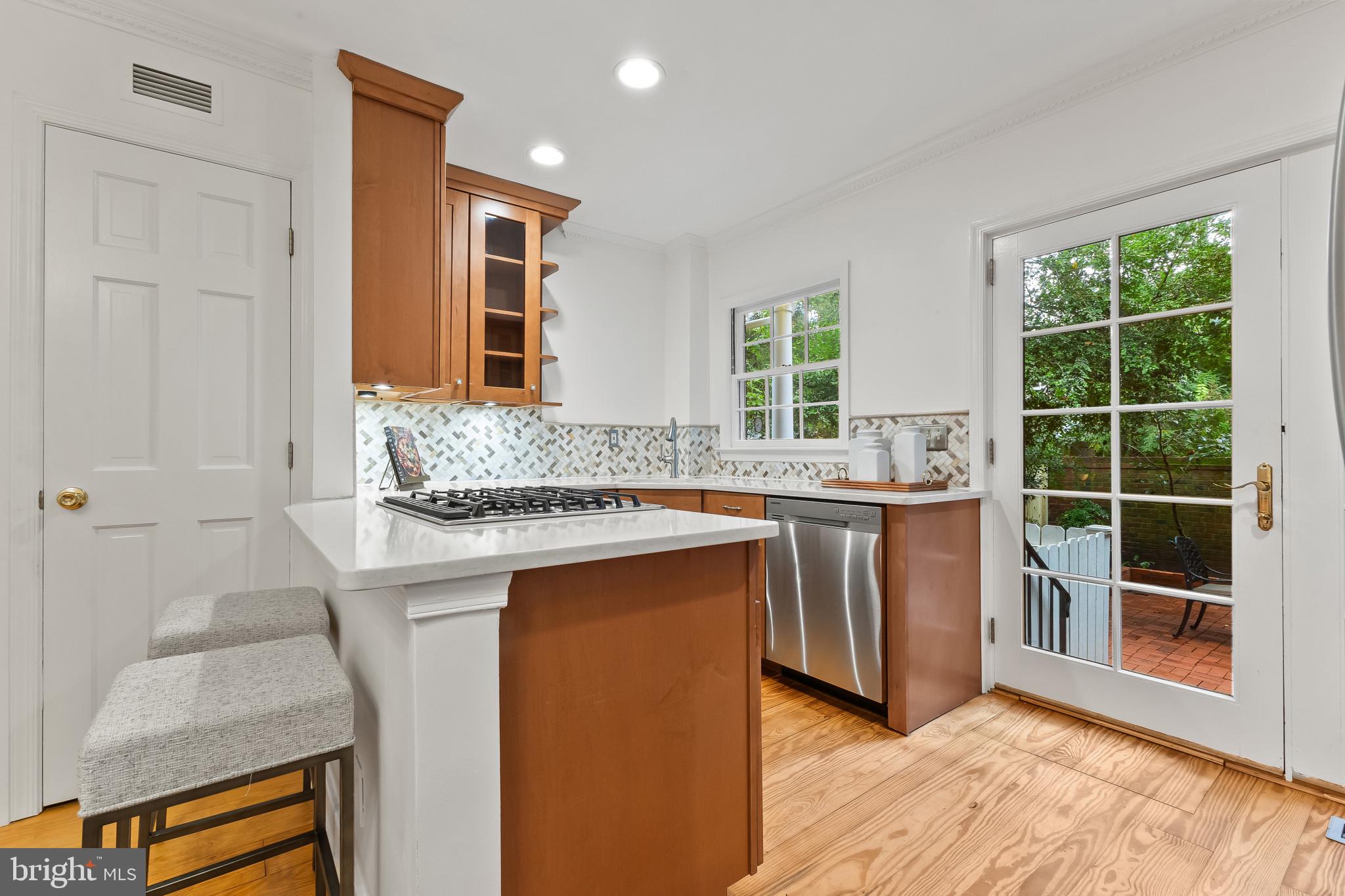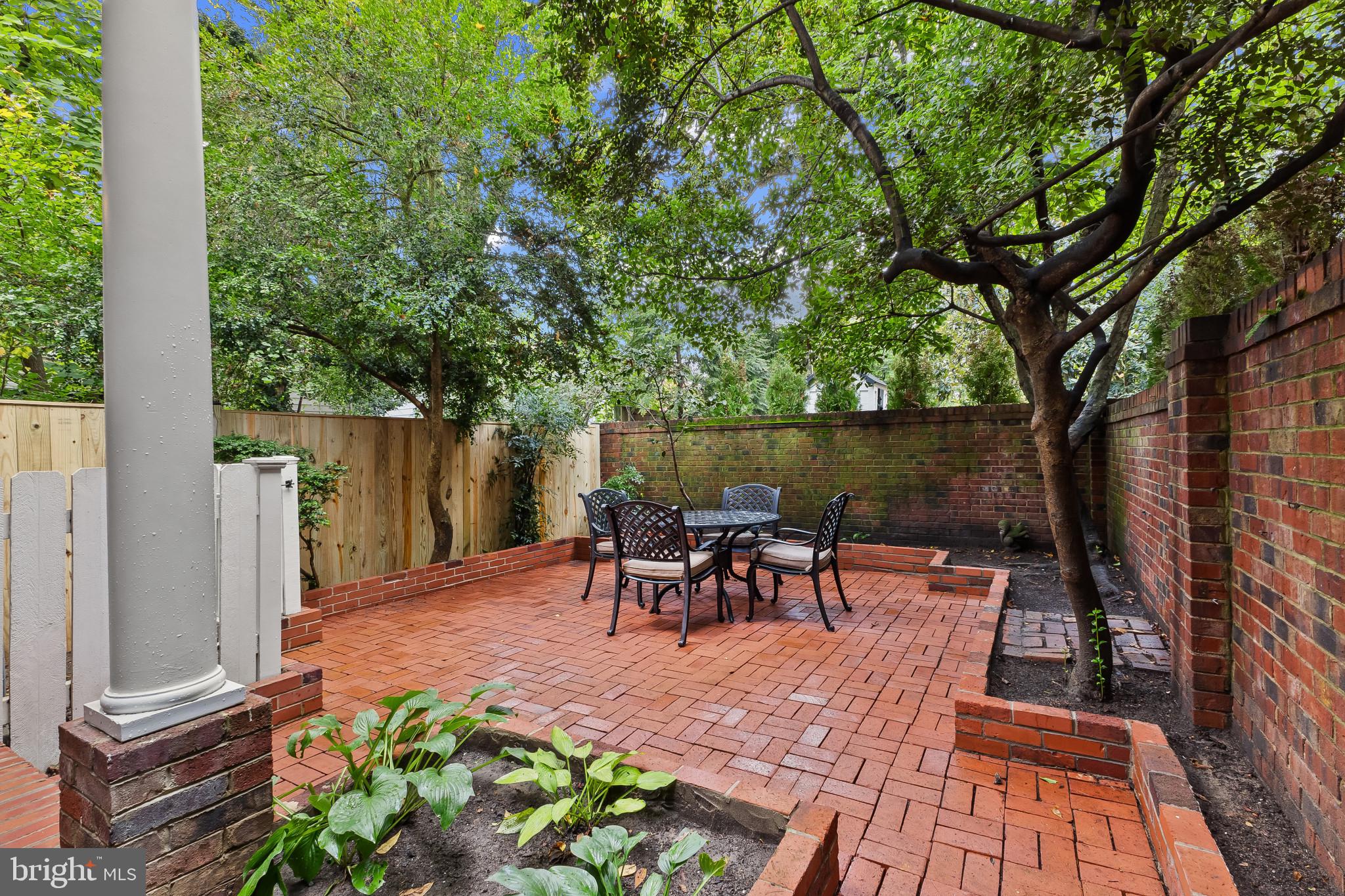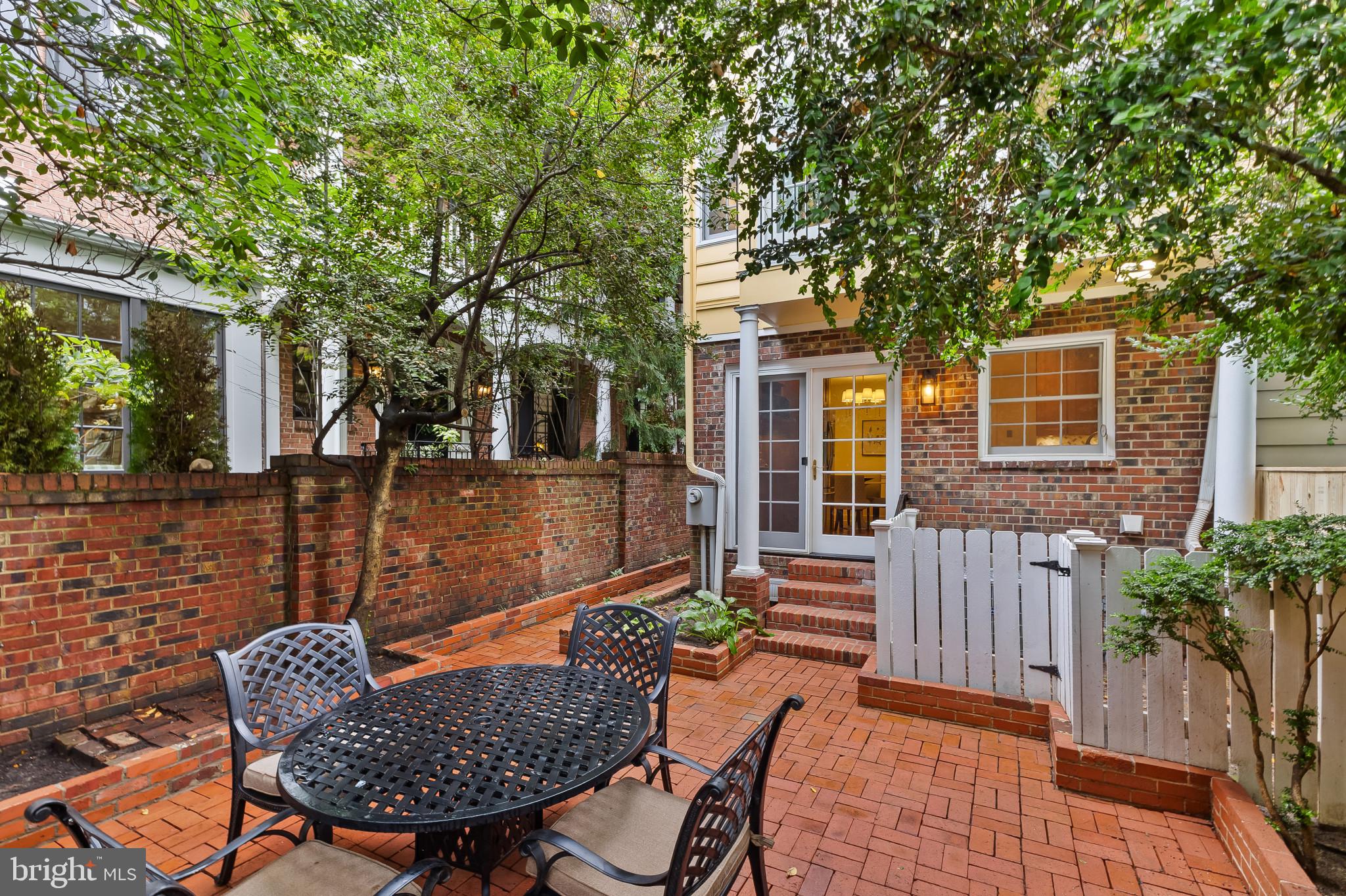 A semi-detached property on a tree-lined street in highly coveted SE quadrant of Historic Old Town. A private gated entrance welcomes you to a brick terrace and lovely outdoor space with mature trees. This historic 1850s home exudes charm at every turn, original wide-pine flooring, hand-carved fireplace mantel, 2 large bedrooms both with ensuite bathrooms, classic dental moldings, and a deep patio with lush garden. A side entrance allows for an expansive living room with high ceilings and great windows and light. Beautifully updated kitchen features eat-in peninsula, quartz counters, designer backsplash tile, and a custom built-in pantry. A rare half bath and a deep laundry closet on the main level. An upstairs master suite expansion with French Doors overlooks the brick patio canopied by mature trees. Enjoy gorgeous tree-filled views from every window. Walk out the door and be immersed in all that Old Town has to offer., restaurants, shops and the waterfront are waiting to be discovered! Since purchasing the owner has replaced 5 Andersen French Doors, added a custom built-in pantry in the kitchen, built out a custom closet system in the primary bedroom, painted the interior and exterior top to bottom, replaced GE Washer and Dryer, resealed metal roof, added a new wood patio fence.