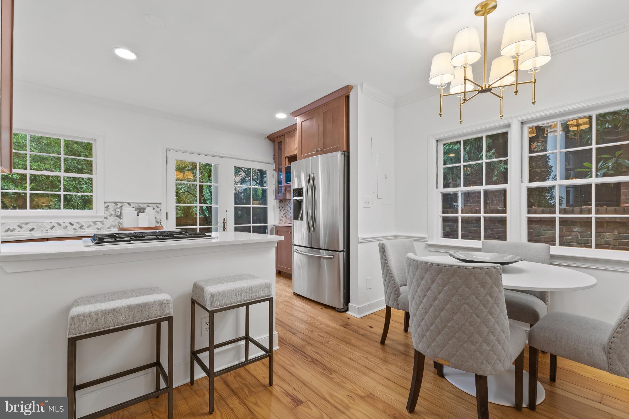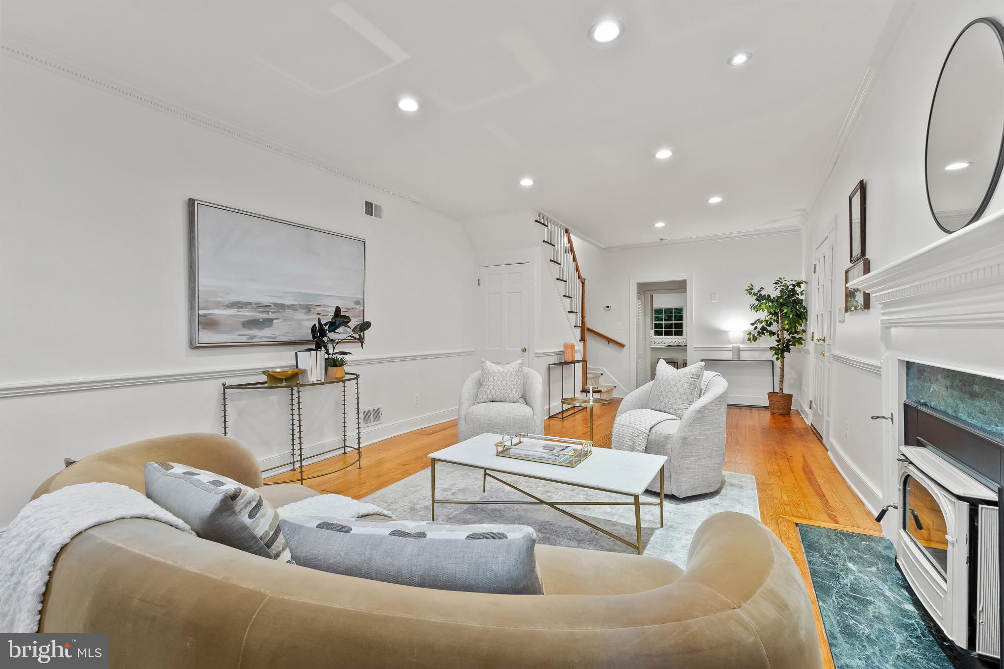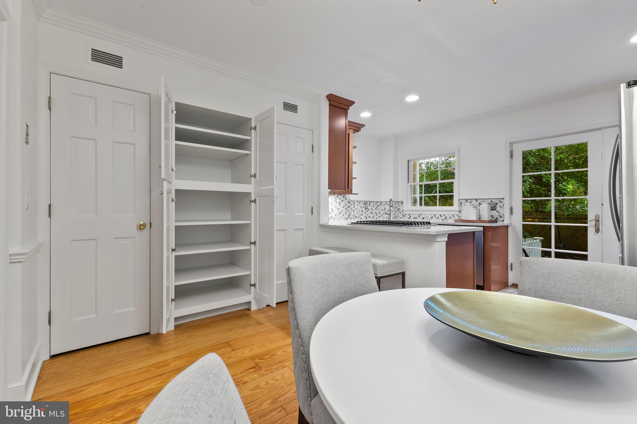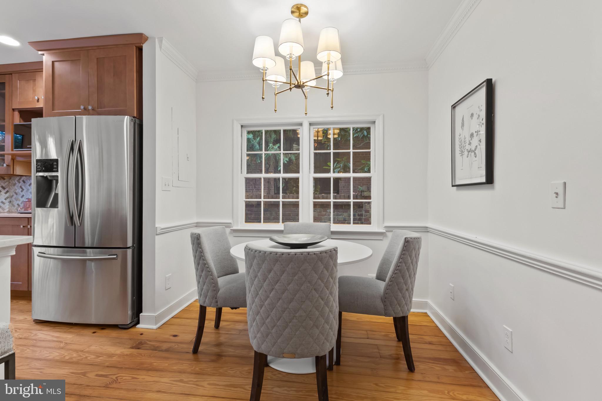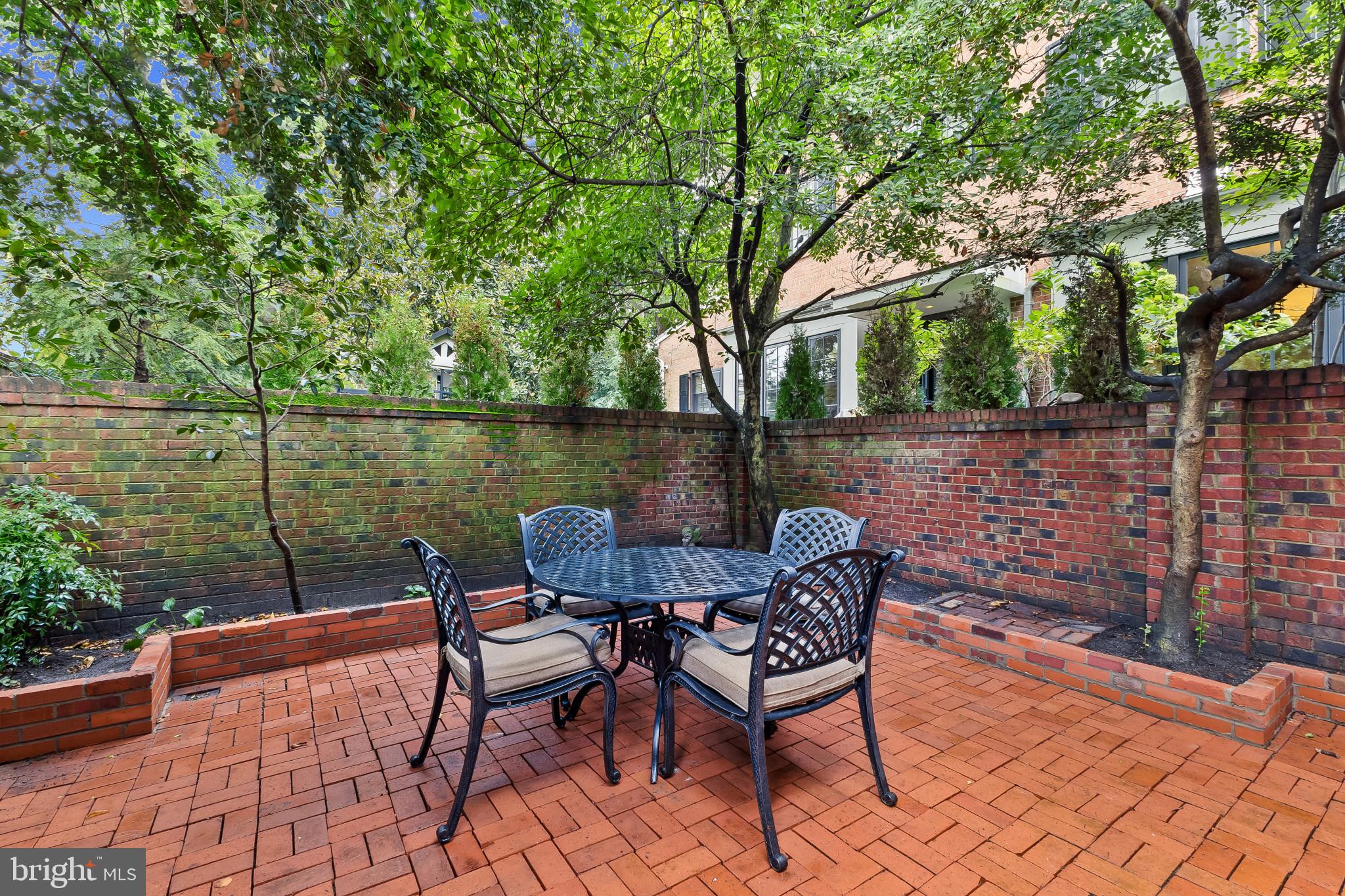 A semi-detached property on a tree-lined street in highly coveted SE quadrant of Historic Old Town. A private gated entrance welcomes you to a brick terrace and lovely outdoor space with mature trees. This historic 1850s home exudes charm at every turn, original wide-pine flooring, hand-carved fireplace mantel, 2 large bedrooms both with ensuite bathrooms, classic dental moldings, and a deep patio with lush garden. A side entrance allows for an expansive living room with high ceilings and great windows and light. Beautifully updated kitchen features eat-in peninsula, quartz counters, designer backsplash tile, and a custom built-in pantry. A rare half bath and a deep laundry closet on the main level. An upstairs master suite expansion with French Doors overlooks the brick patio canopied by mature trees. Enjoy gorgeous tree-filled views from every window. Walk out the door and be immersed in all that Old Town has to offer., restaurants, shops and the waterfront are waiting to be discovered! Since purchasing the owner has replaced 5 Andersen French Doors, added a custom built-in pantry in the kitchen, built out a custom closet system in the primary bedroom, painted the interior and exterior top to bottom, replaced GE Washer and Dryer, resealed metal roof, added a new wood patio fence.