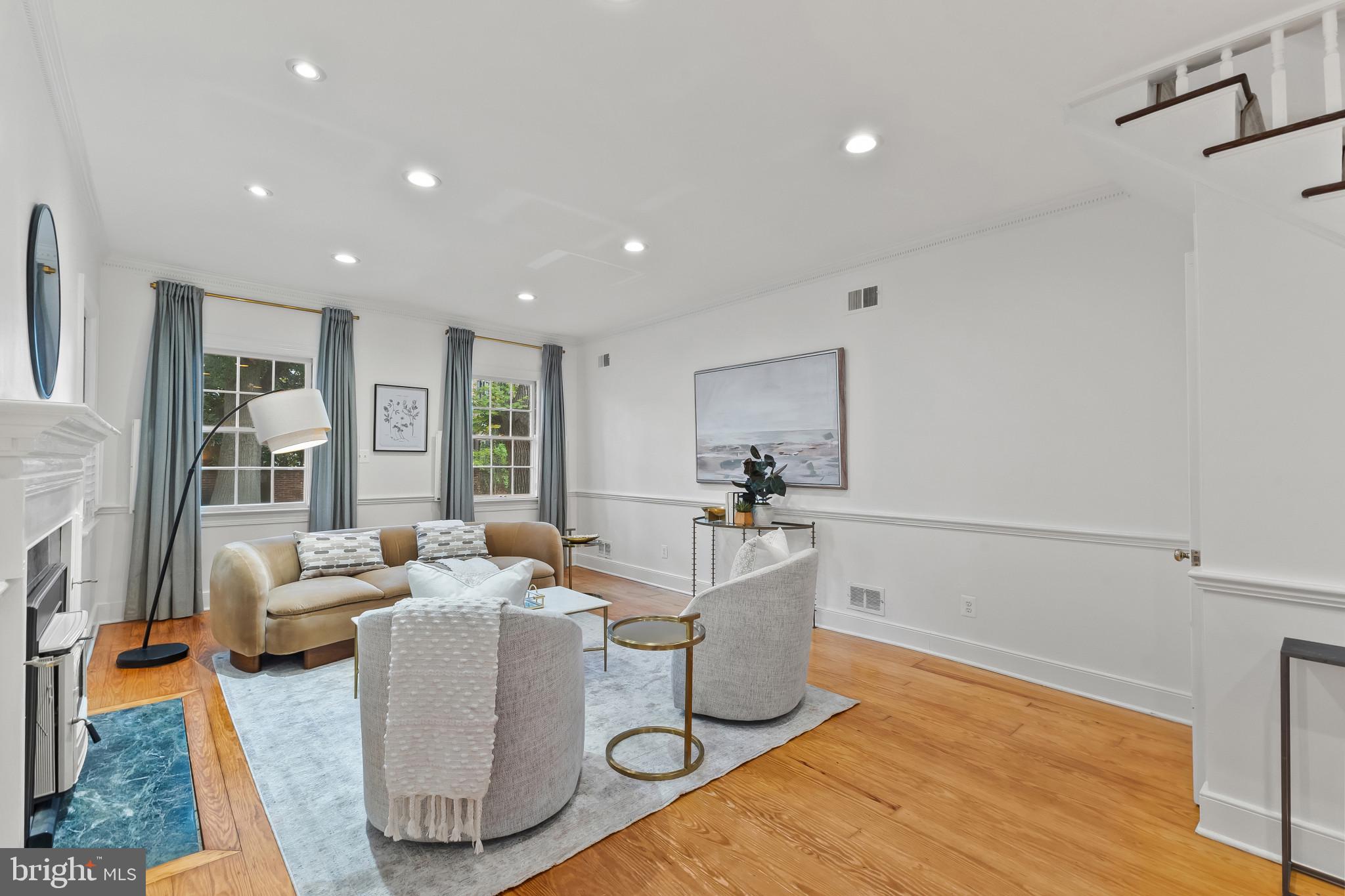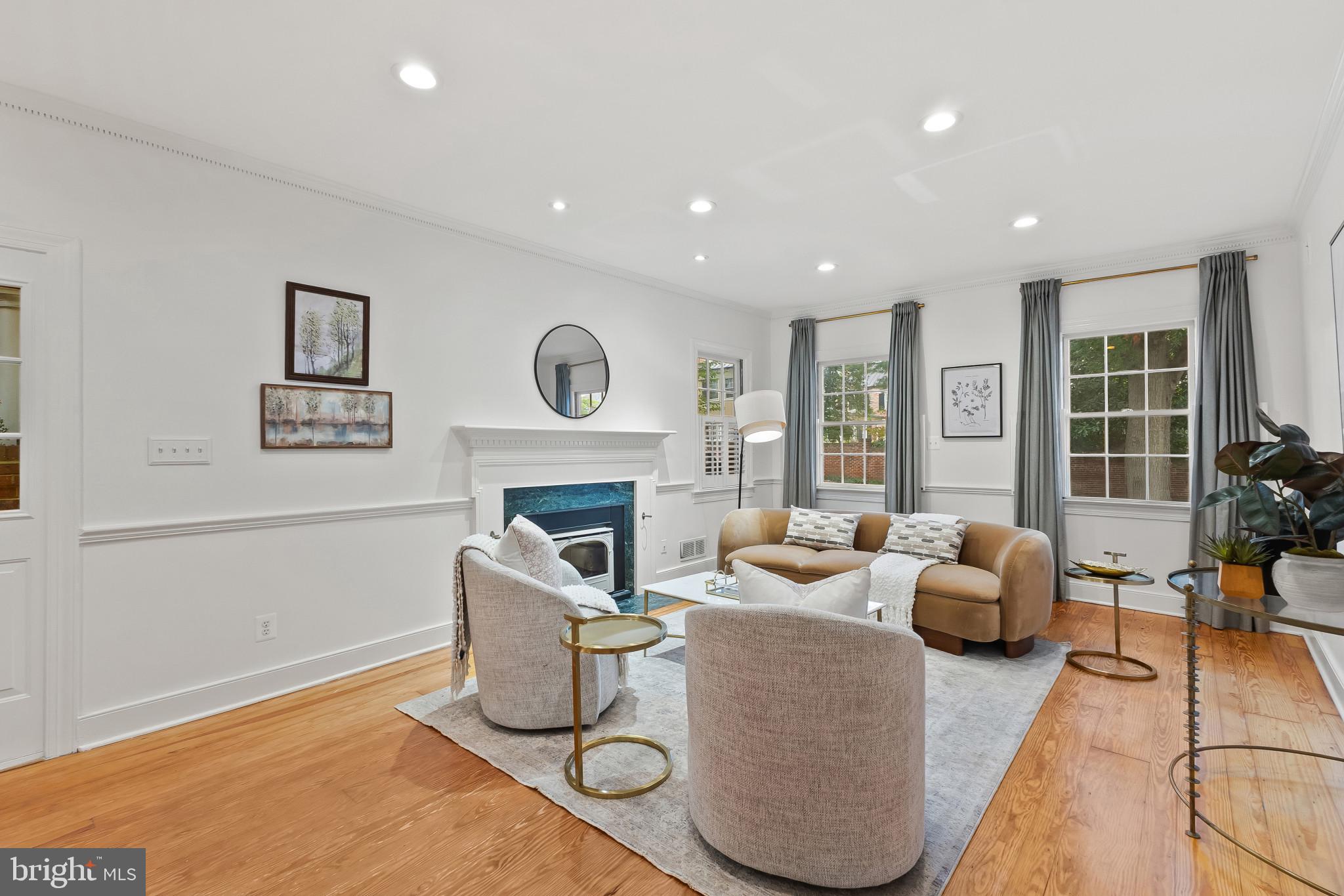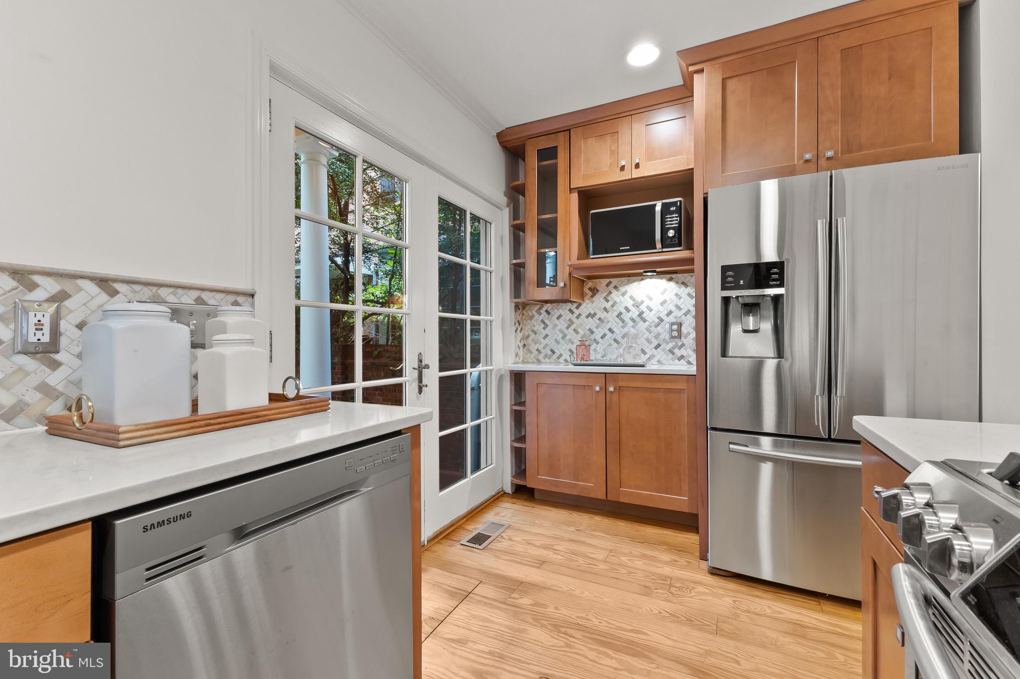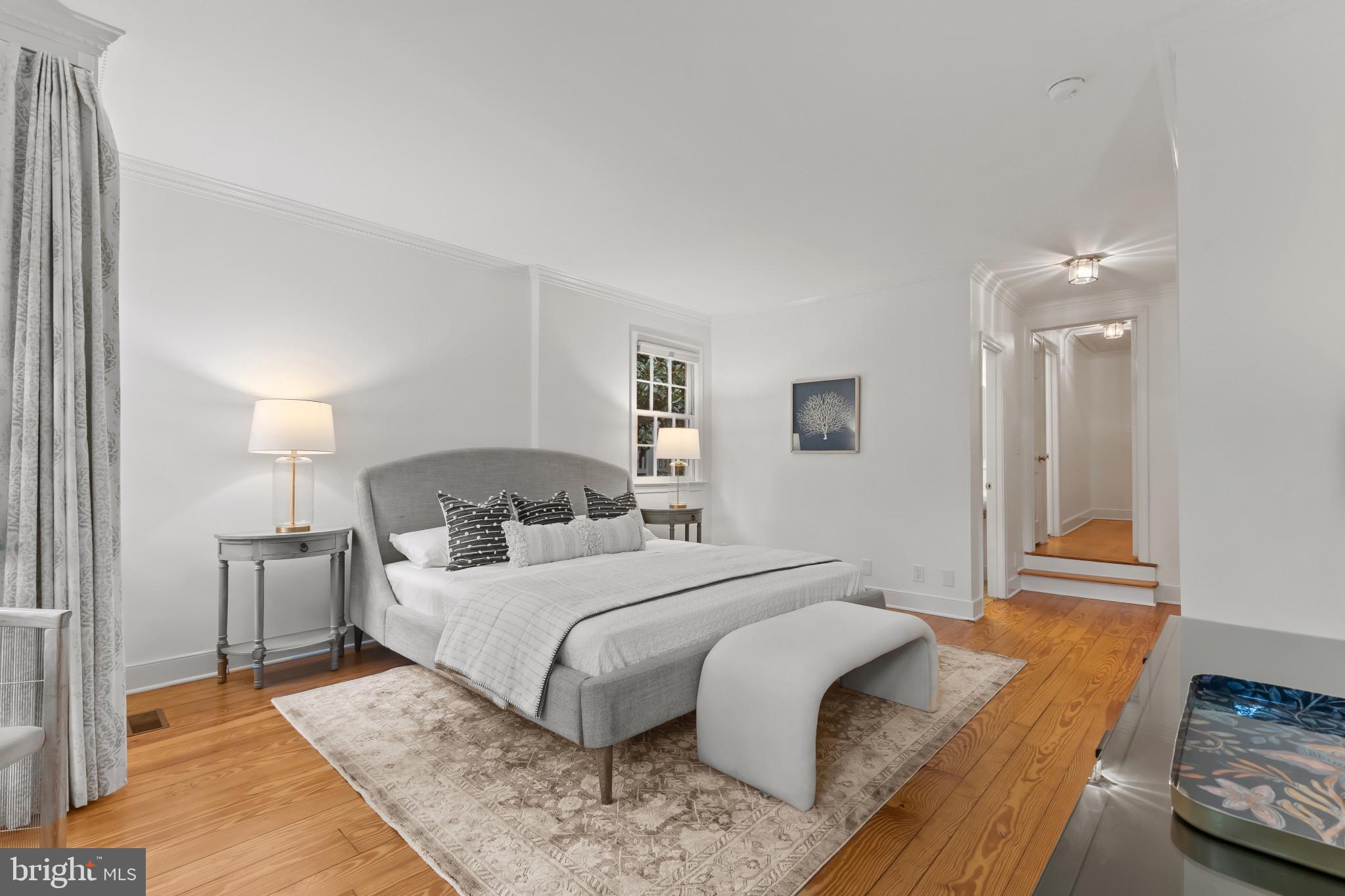 A semi-detached property on a tree-lined street in highly coveted SE quadrant of Historic Old Town. A private gated entrance welcomes you to a brick terrace and lovely outdoor space with mature trees. This historic 1850s home exudes charm at every turn, original wide-pine flooring, hand-carved fireplace mantel, 2 large bedrooms both with ensuite bathrooms, classic dental moldings, and a deep patio with lush garden. A side entrance allows for an expansive living room with high ceilings and great windows and light. Beautifully updated kitchen features eat-in peninsula, quartz counters, designer backsplash tile, and a custom built-in pantry. A rare half bath and a deep laundry closet on the main level. An upstairs master suite expansion with French Doors overlooks the brick patio canopied by mature trees. Enjoy gorgeous tree-filled views from every window. Walk out the door and be immersed in all that Old Town has to offer., restaurants, shops and the waterfront are waiting to be discovered! Since purchasing the owner has replaced 5 Andersen French Doors, added a custom built-in pantry in the kitchen, built out a custom closet system in the primary bedroom, painted the interior and exterior top to bottom, replaced GE Washer and Dryer, resealed metal roof, added a new wood patio fence.