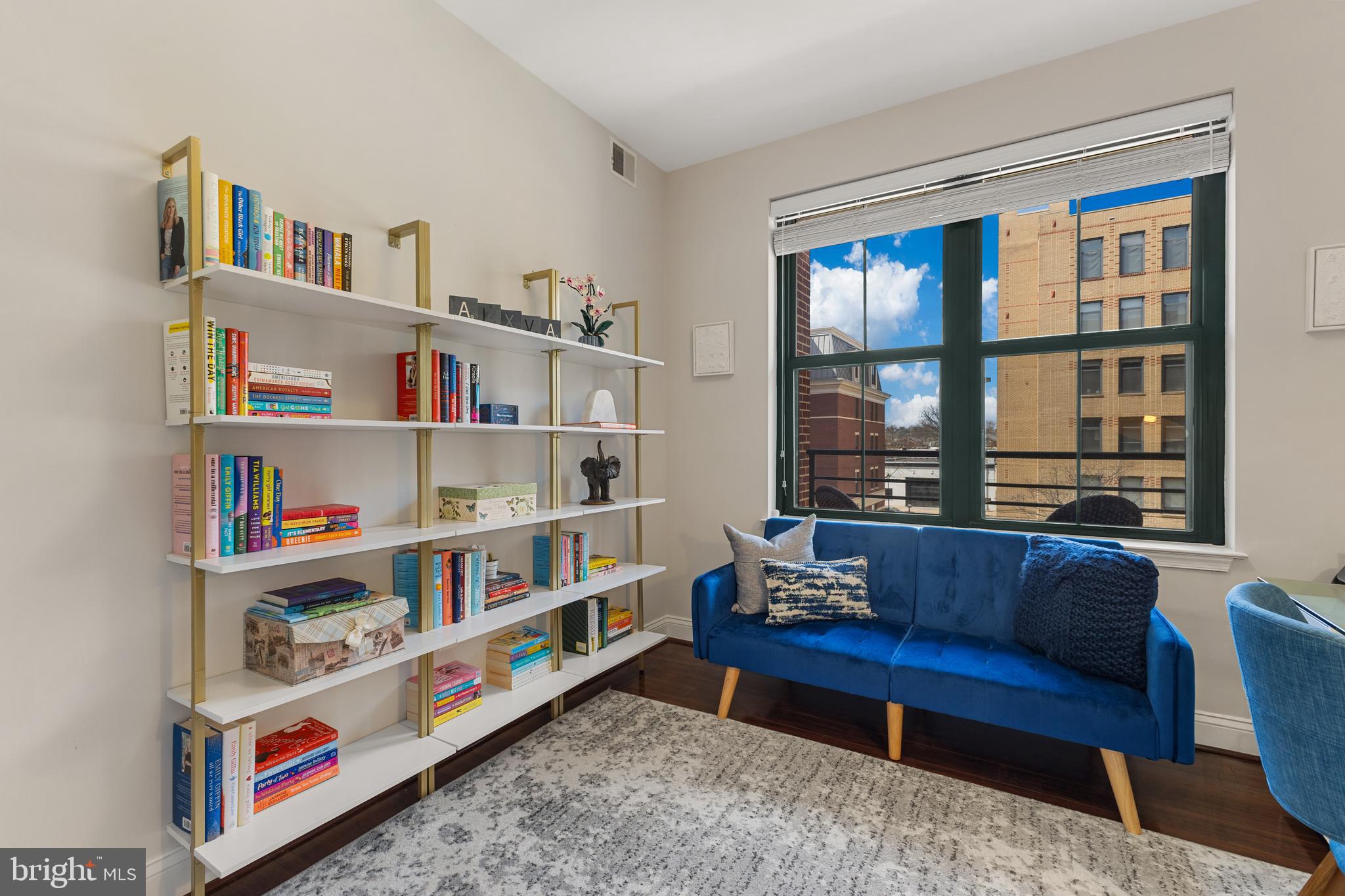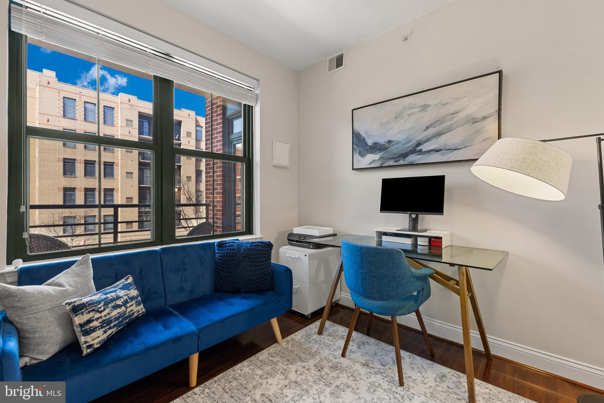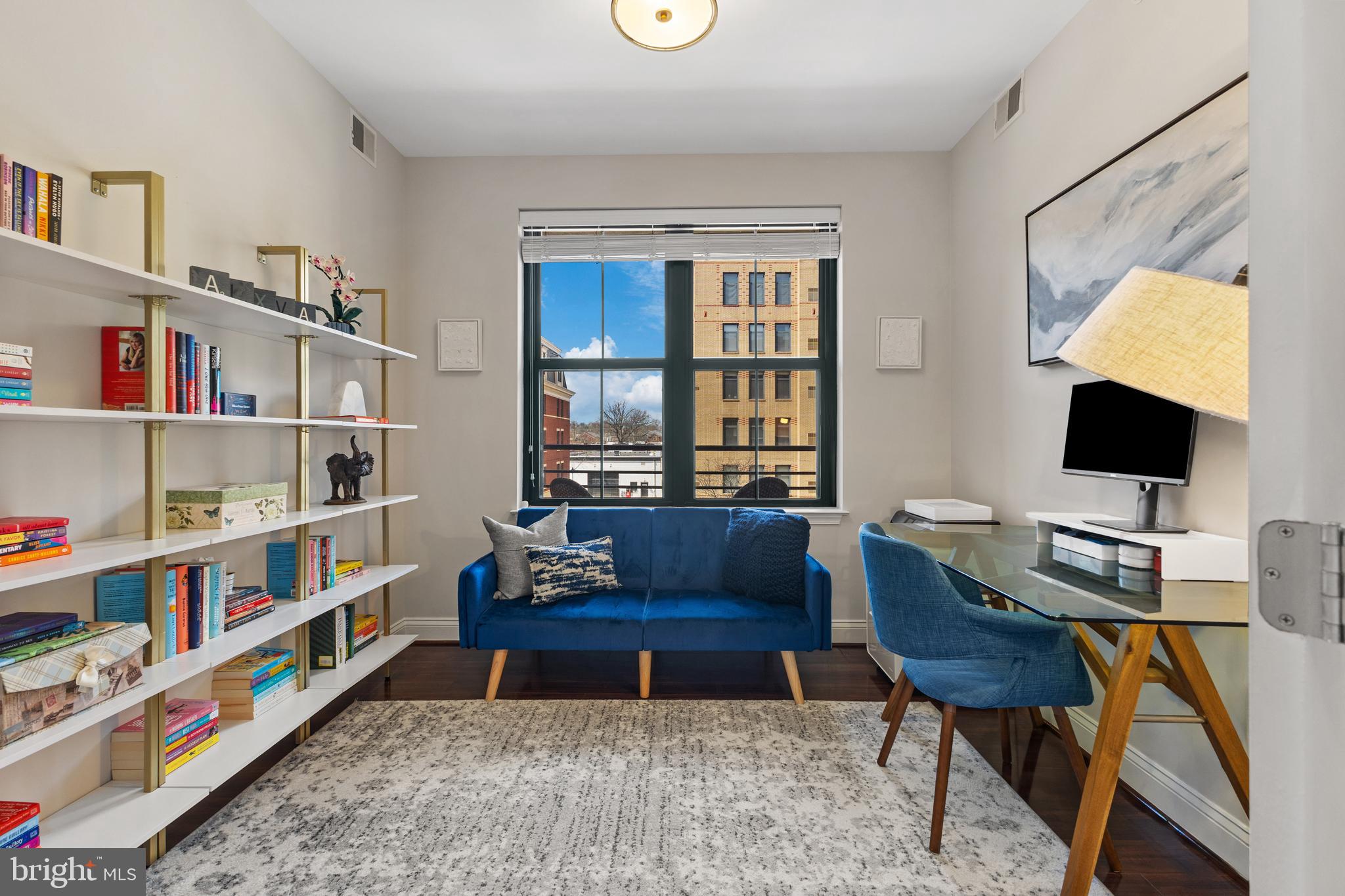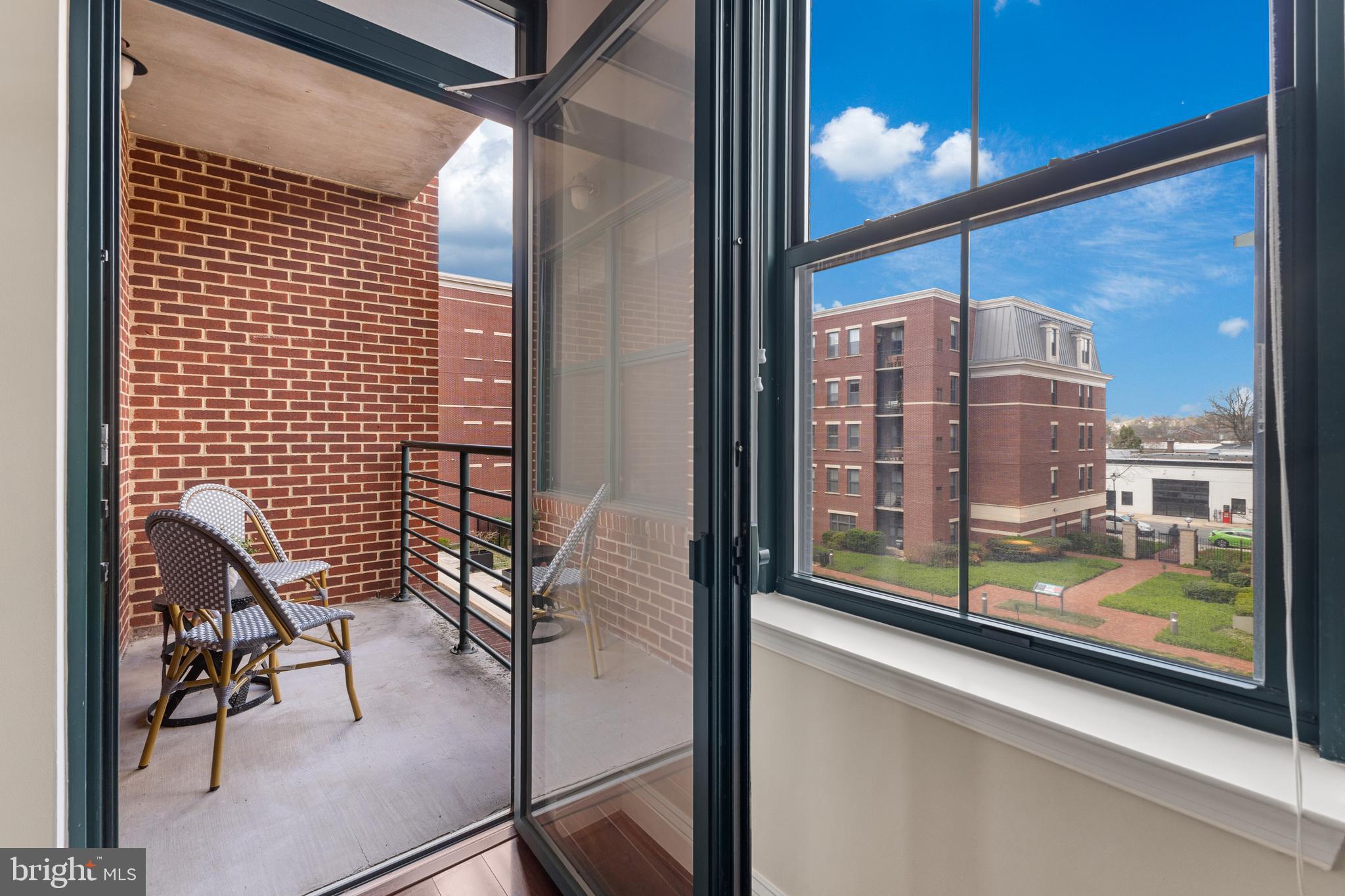 Incredible opportunity to own a rare one bedroom + den at The Henry in North Old Town!! This bright and modern condo features beautiful hardwood flooring throughout, oversized windows, stainless steel appliances + granite counters, spacious bathroom, built-out walk-in closet, and in-unit laundry. The open-concept kitchen overlooks the living and dining areas, leading to a private balcony with peaceful interior views of The Henry courtyard and green space. Natural light fills both the bedroom and versatile den, which can easily serve as a home office, guest space, or even a second bedroom. This unique condo is an end unit and thus offers two walls with windows for more natural light! Closet for storage as you enter the condo + additional storage cabinet in bathroom. Washer/Dryer replaced in 2023. The Henry offers an array of top-tier amenities, including a residents' lounge with a movie room, pool table, kitchen, and library. Enjoy the state of the art fitness center, gated courtyard, two rooftop terraces, secure assigned parking and storage unit, and a concierge at the front desk for added convenience and security. The Henry offers city living at its very best - located just blocks from many beloved local shops and restaurants, Trader Joe's and Harris Teeter grocery stores, and easy commuting from the Braddock Road Metro into DC. Less than one block to Starbucks, Bastille Brasserie & Bar, Studio Barre and community park or stroll to the Potomac River, King Street, Oronoco Bay Park and more!! Less than 4 miles to National Airport!