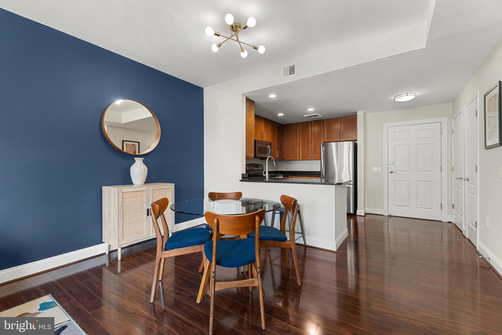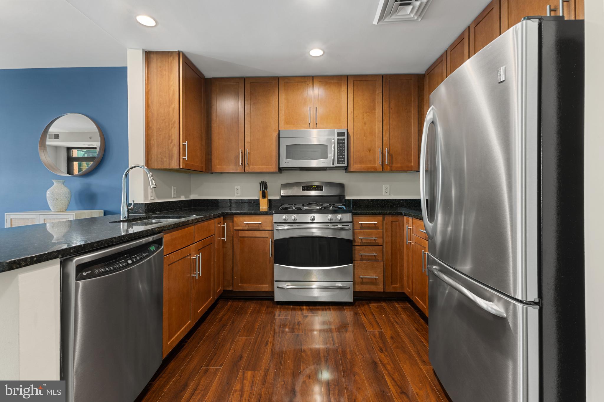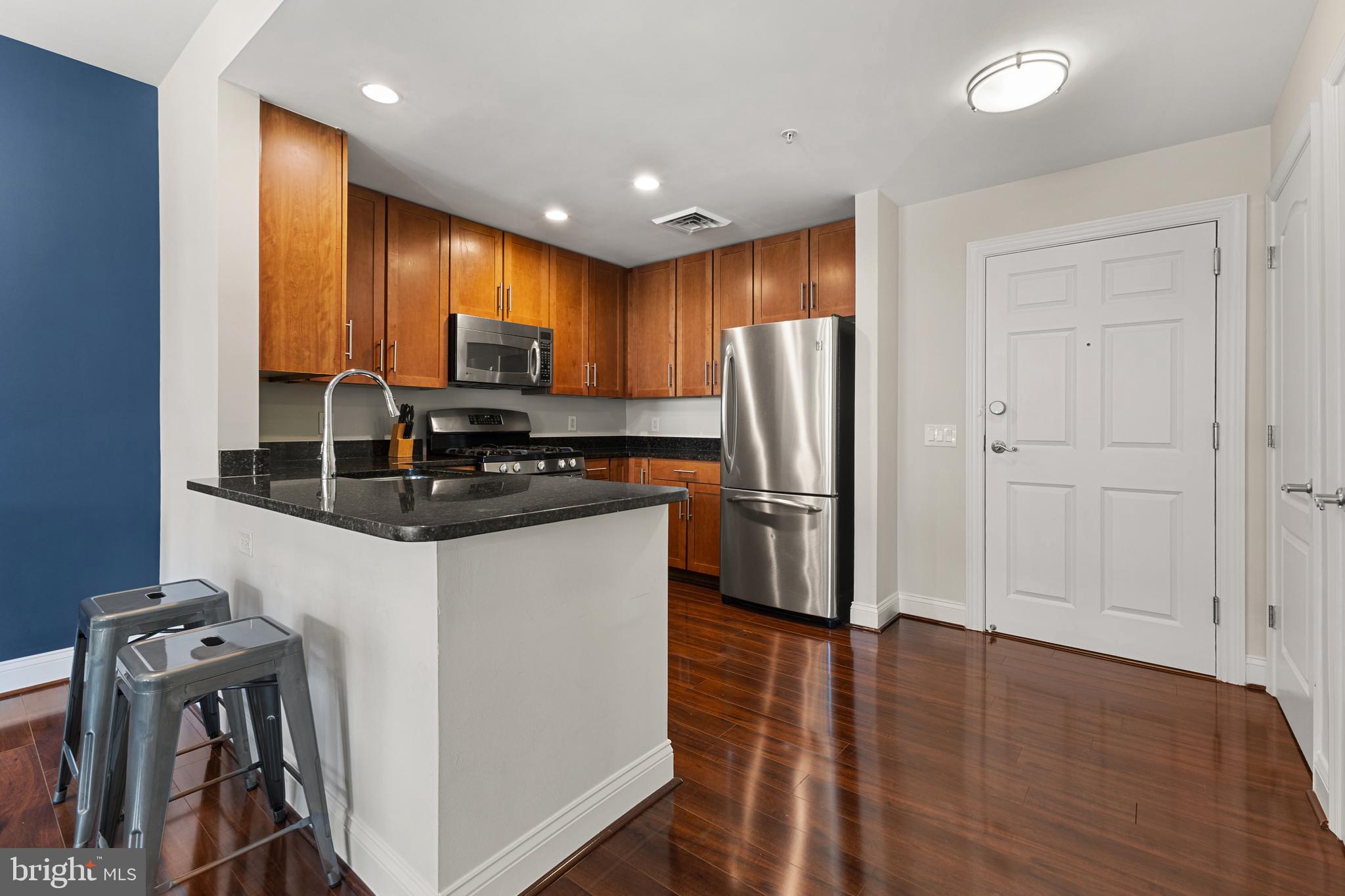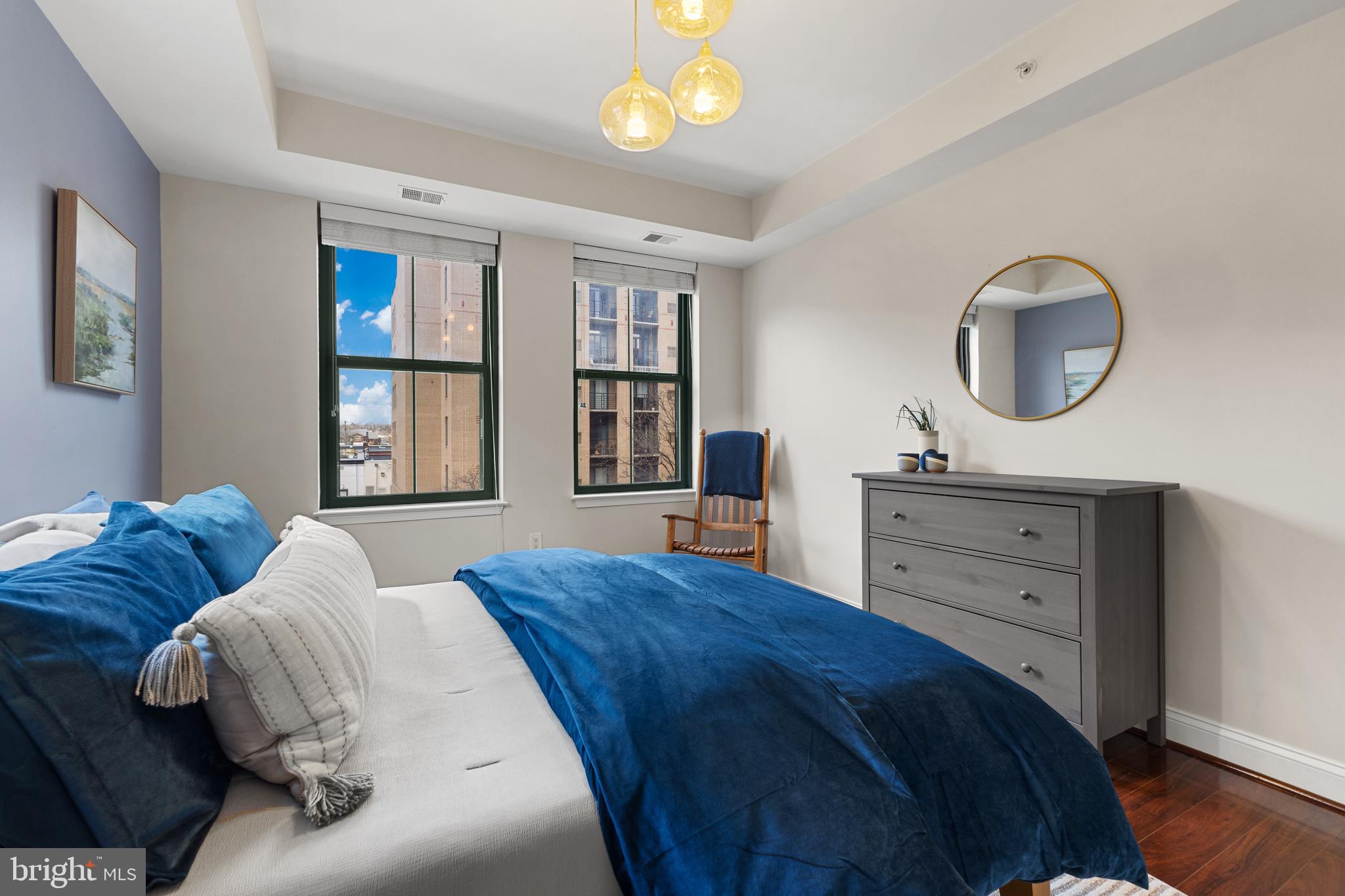 Incredible opportunity to own a rare one bedroom + den at The Henry in North Old Town!! This bright and modern condo features beautiful hardwood flooring throughout, oversized windows, stainless steel appliances + granite counters, spacious bathroom, built-out walk-in closet, and in-unit laundry. The open-concept kitchen overlooks the living and dining areas, leading to a private balcony with peaceful interior views of The Henry courtyard and green space. Natural light fills both the bedroom and versatile den, which can easily serve as a home office, guest space, or even a second bedroom. This unique condo is an end unit and thus offers two walls with windows for more natural light! Closet for storage as you enter the condo + additional storage cabinet in bathroom. Washer/Dryer replaced in 2023. The Henry offers an array of top-tier amenities, including a residents' lounge with a movie room, pool table, kitchen, and library. Enjoy the state of the art fitness center, gated courtyard, two rooftop terraces, secure assigned parking and storage unit, and a concierge at the front desk for added convenience and security. The Henry offers city living at its very best - located just blocks from many beloved local shops and restaurants, Trader Joe's and Harris Teeter grocery stores, and easy commuting from the Braddock Road Metro into DC. Less than one block to Starbucks, Bastille Brasserie & Bar, Studio Barre and community park or stroll to the Potomac River, King Street, Oronoco Bay Park and more!! Less than 4 miles to National Airport!