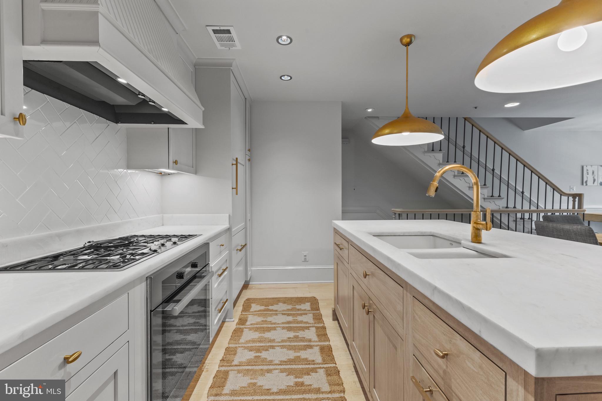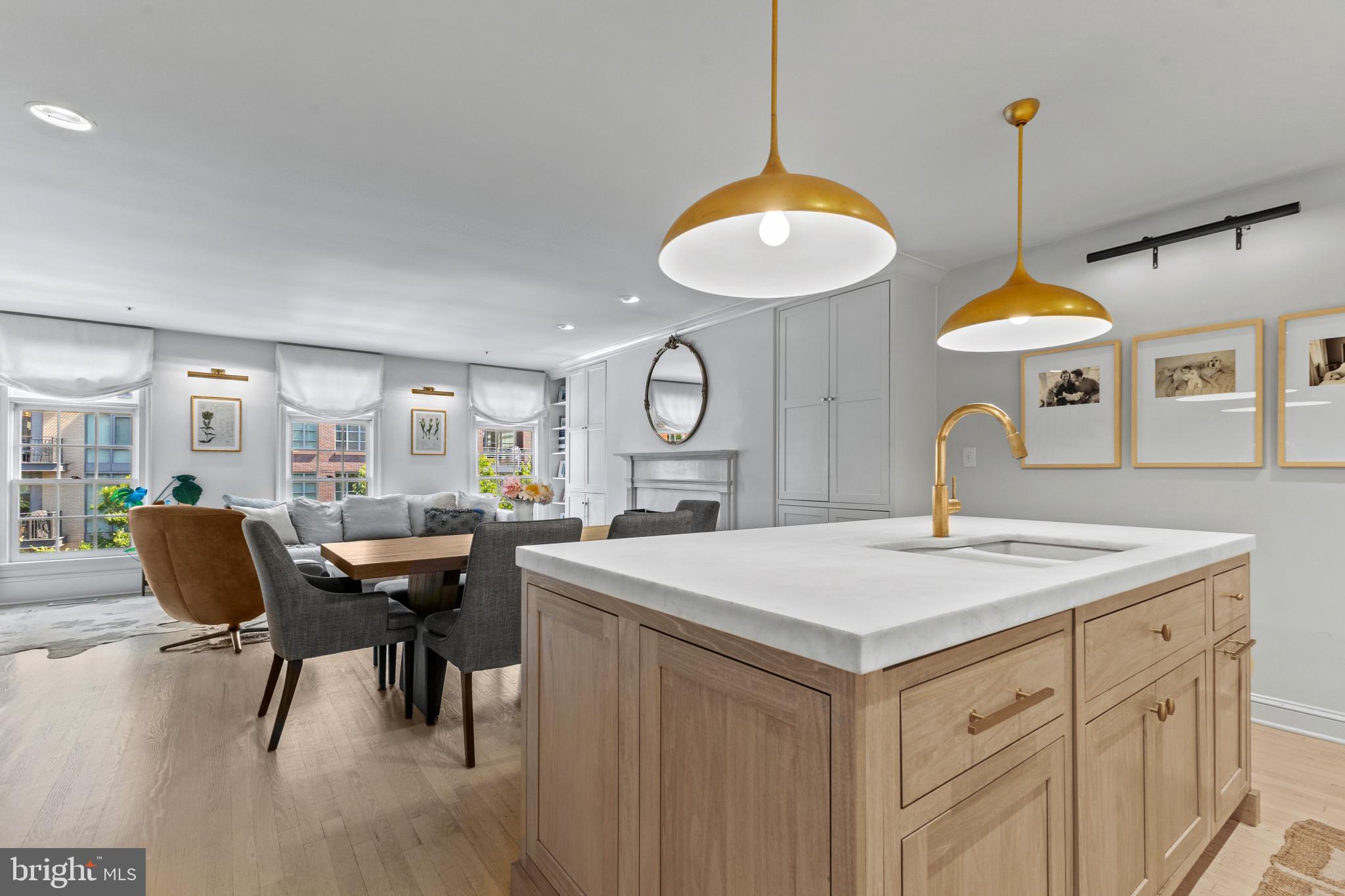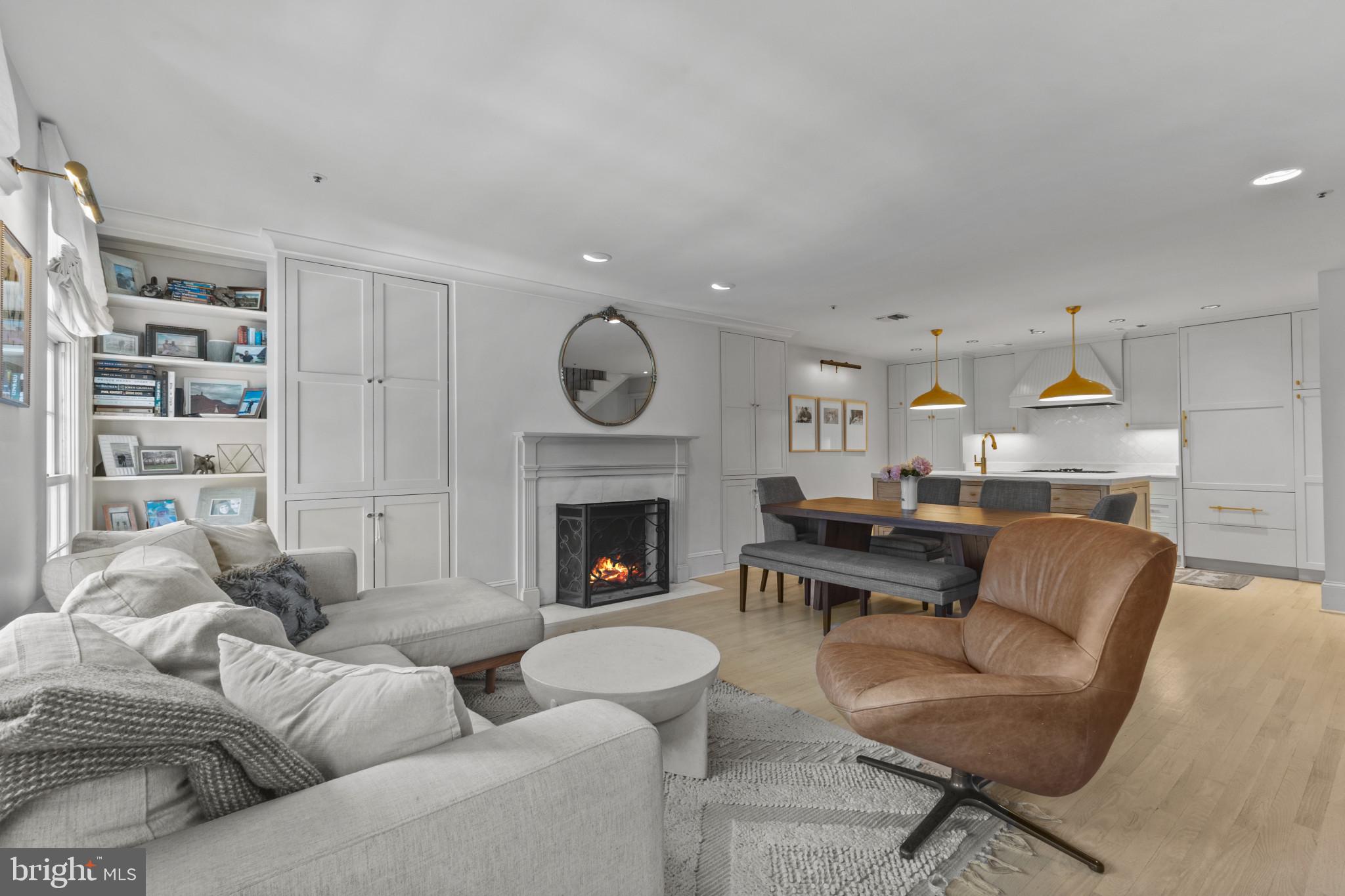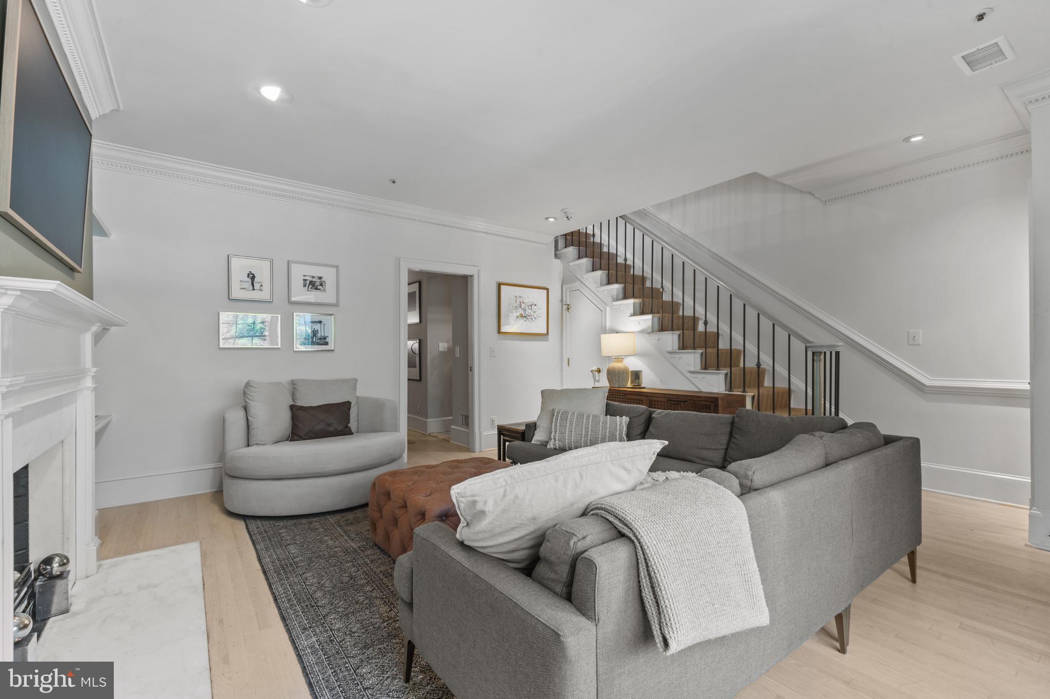 The chef's kitchen has custom inset cabinets, center island, designer hardware and custom pull out cabinets plus top-of-the-line Miele appliances. A large dining room and living room are adjacent with large windows and a fireplace. A well appointment powder room serves this level.