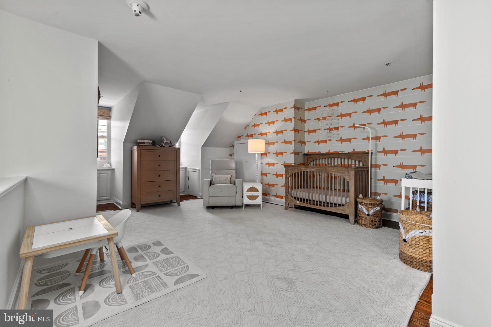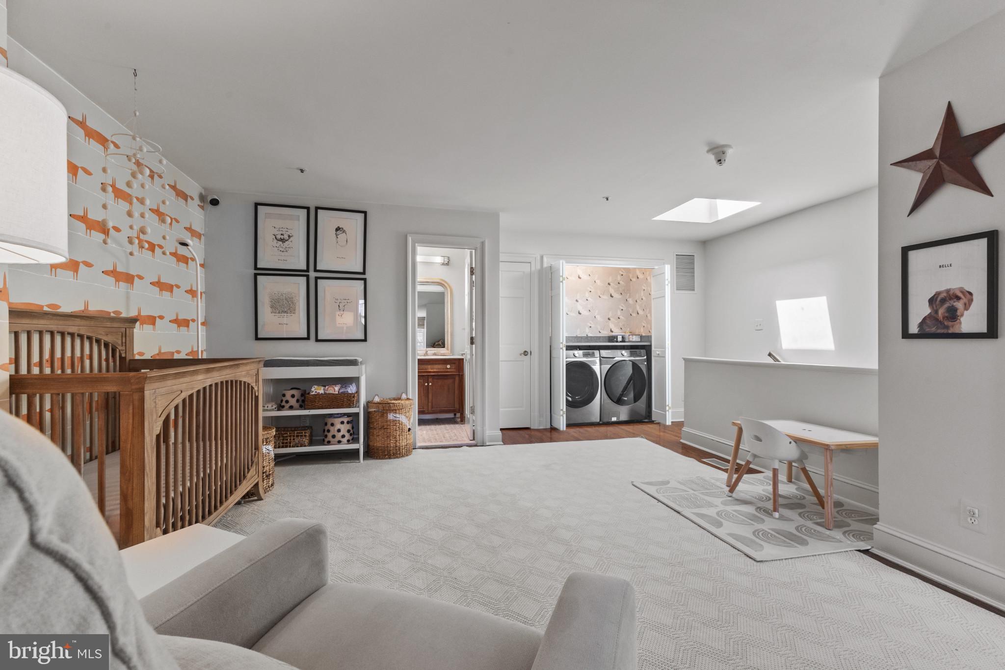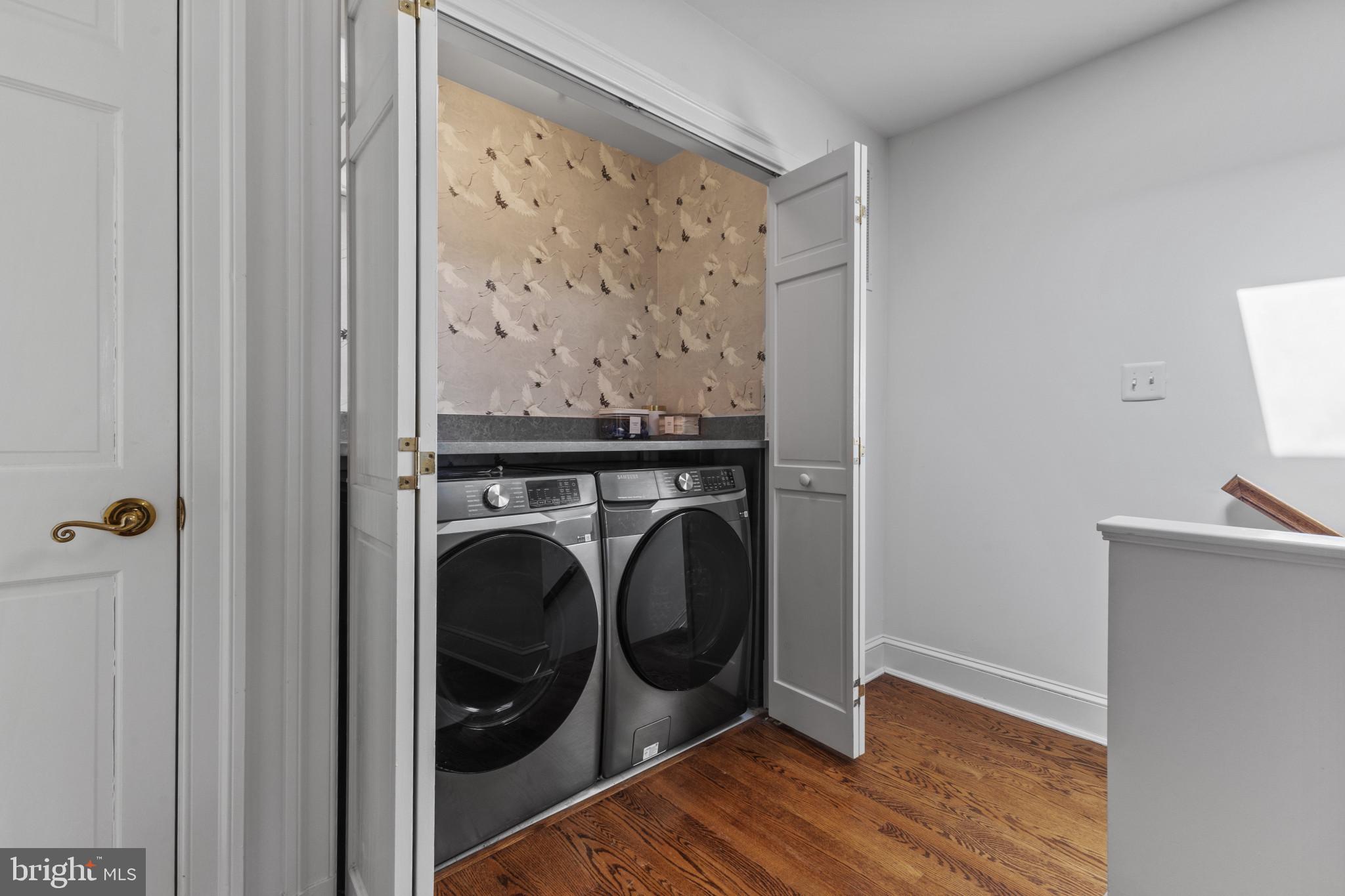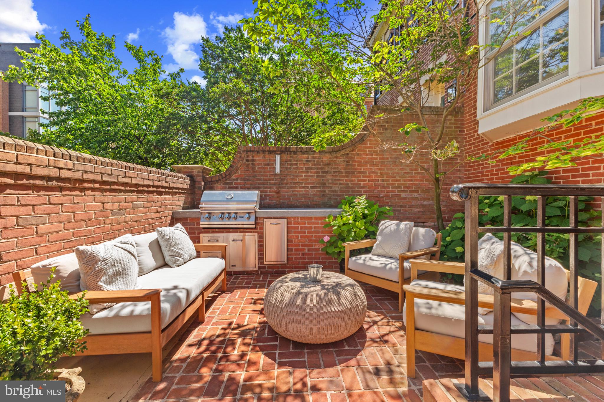 The chef's kitchen has custom inset cabinets, center island, designer hardware and custom pull out cabinets plus top-of-the-line Miele appliances. A large dining room and living room are adjacent with large windows and a fireplace. A well appointment powder room serves this level.