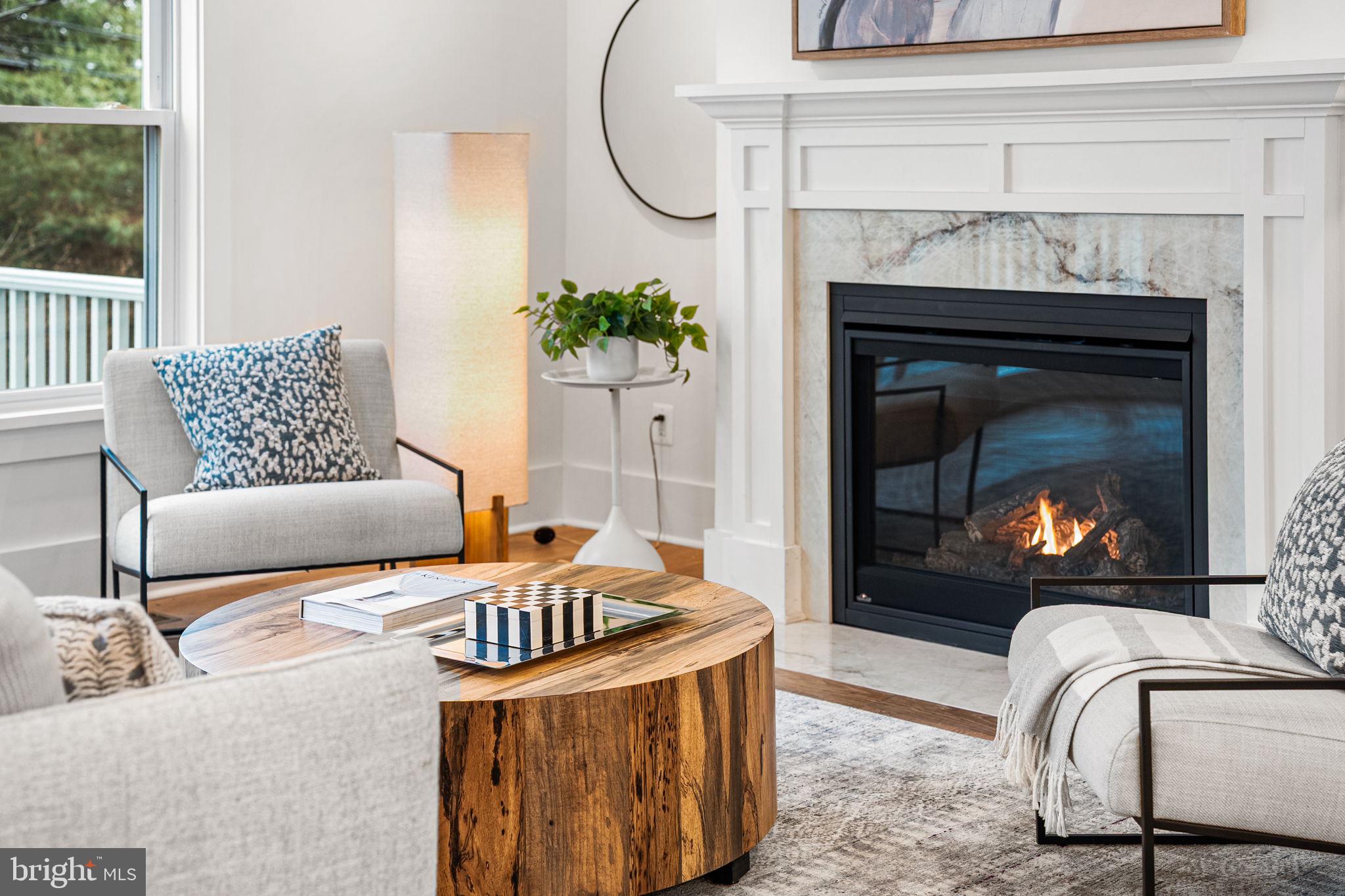 The main level is made for both everyday living and effortless entertaining. A Napoleon gas fireplace with marble surround anchors the living room, while an oversized sliding door opens seamlessly to a Trex deck, an ideal setting for al fresco dining or morning coffee. The chef's kitchen is exceptionally appointed, featuring a six-burner Bosch range, custom wood hood, quartz countertops, marble subway tile backsplash, and a suite of premium appliances including a KitchenAid dishwasher and LG French door refrigerator. A charming Dutch door connects the home to the yard and patio beyond.
