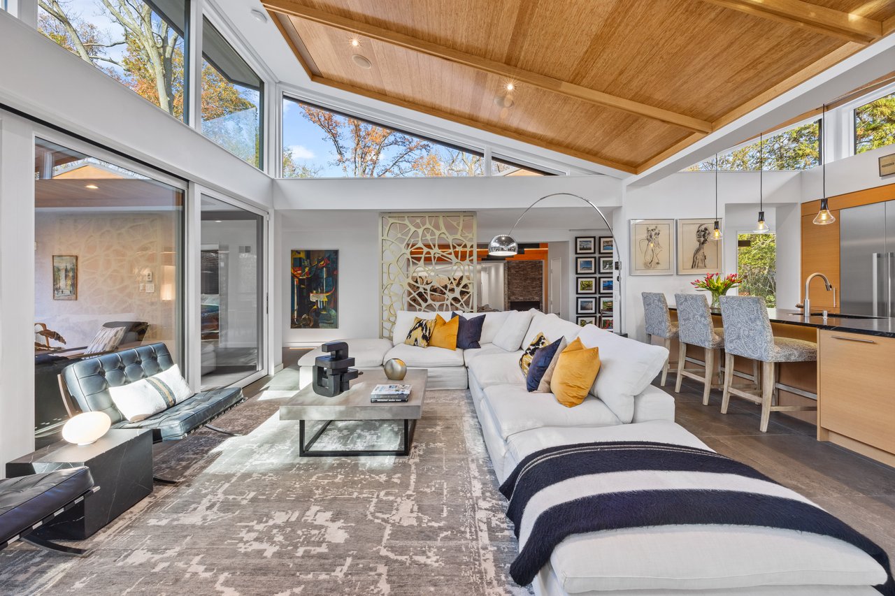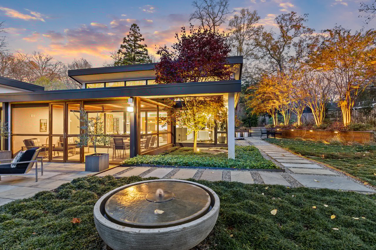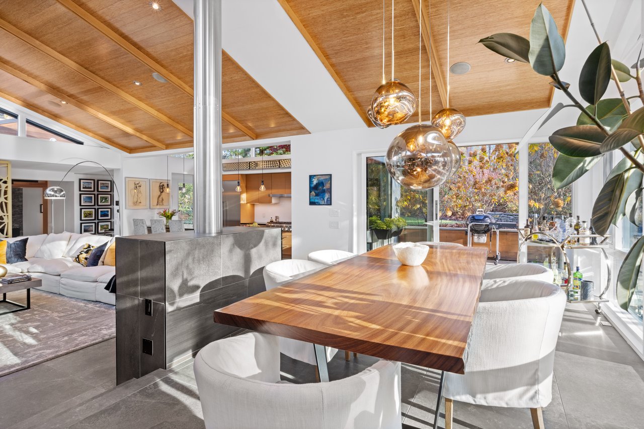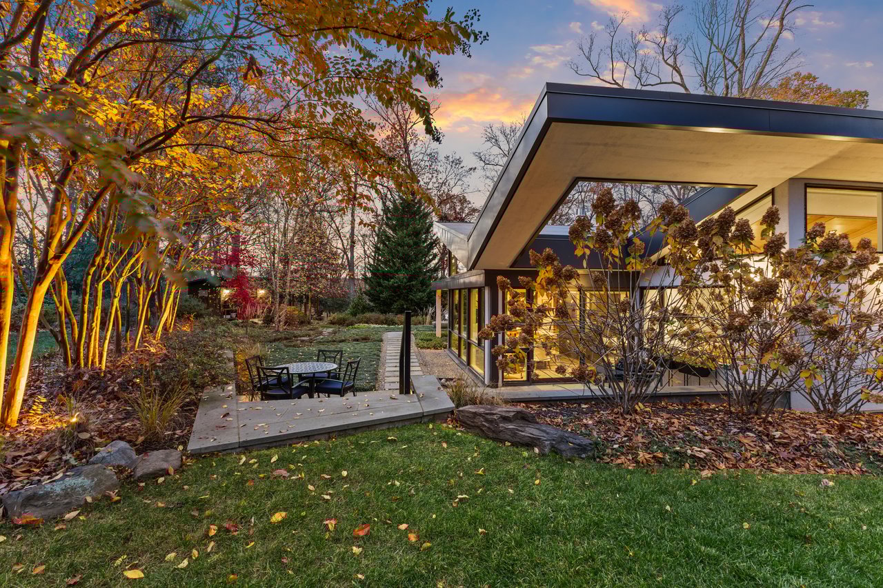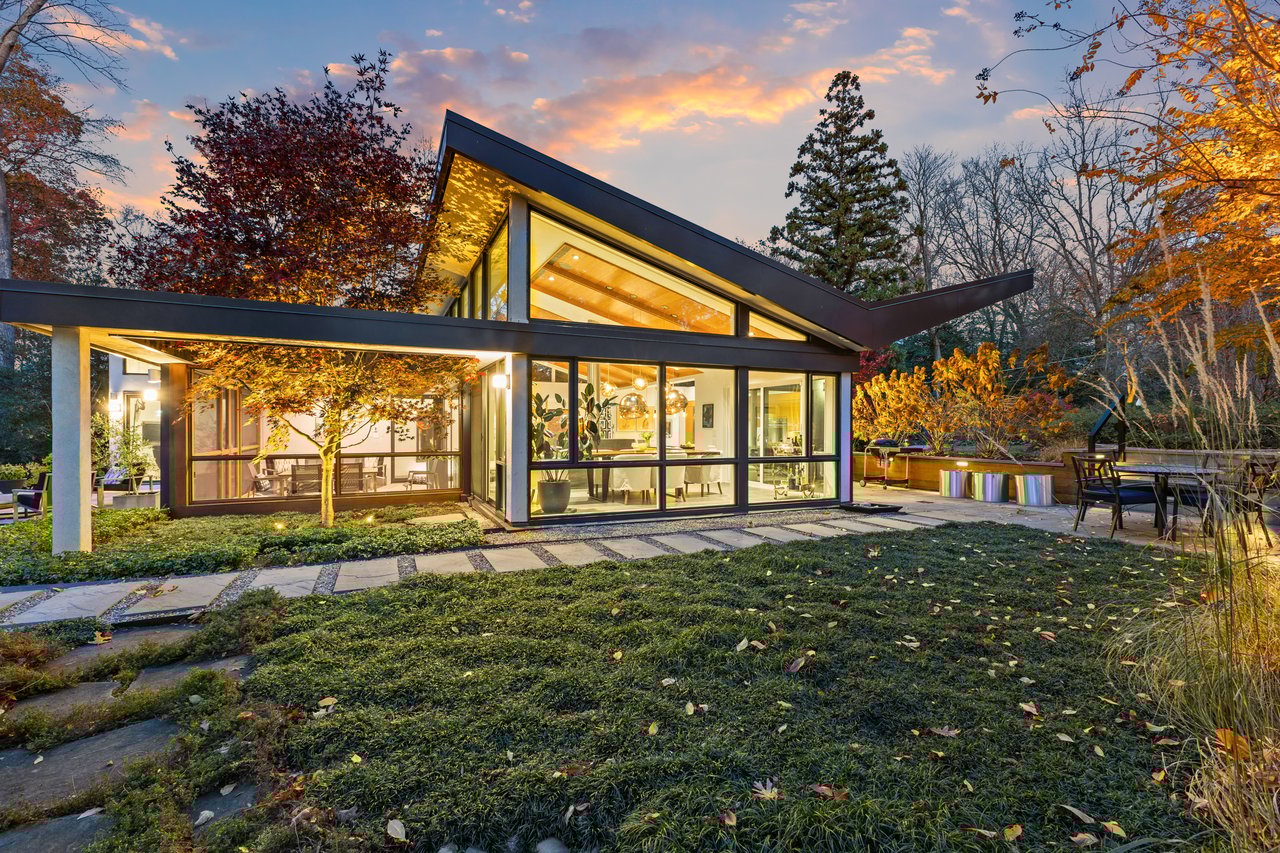 Winner of the Home and Design Grand Award for Curb Appeal in 2024, this secluded mid-century modern home is like no other. Designed by award winning architect Ben Ames, this home is defined by its striking dual butterfly roofs, walls of floor to ceiling glass and seamless integration with nature. Built to commercial standards with metal frame, concrete slab, commercial grade windows and sliding doors by LaCANTINA Systems. Every line, every material and every texture has a purpose and a reason that connects the home with its surrounding environment. It’s perfectly sited on a wooded 0.82-acre lot offering a private retreat that harmonizes effortless luxury with timeless elegance. Mature trees and professionally designed gardens frame this serene sanctuary, complete with meandering pathways, cedar-clad retaining walls, and glowing landscape lighting.