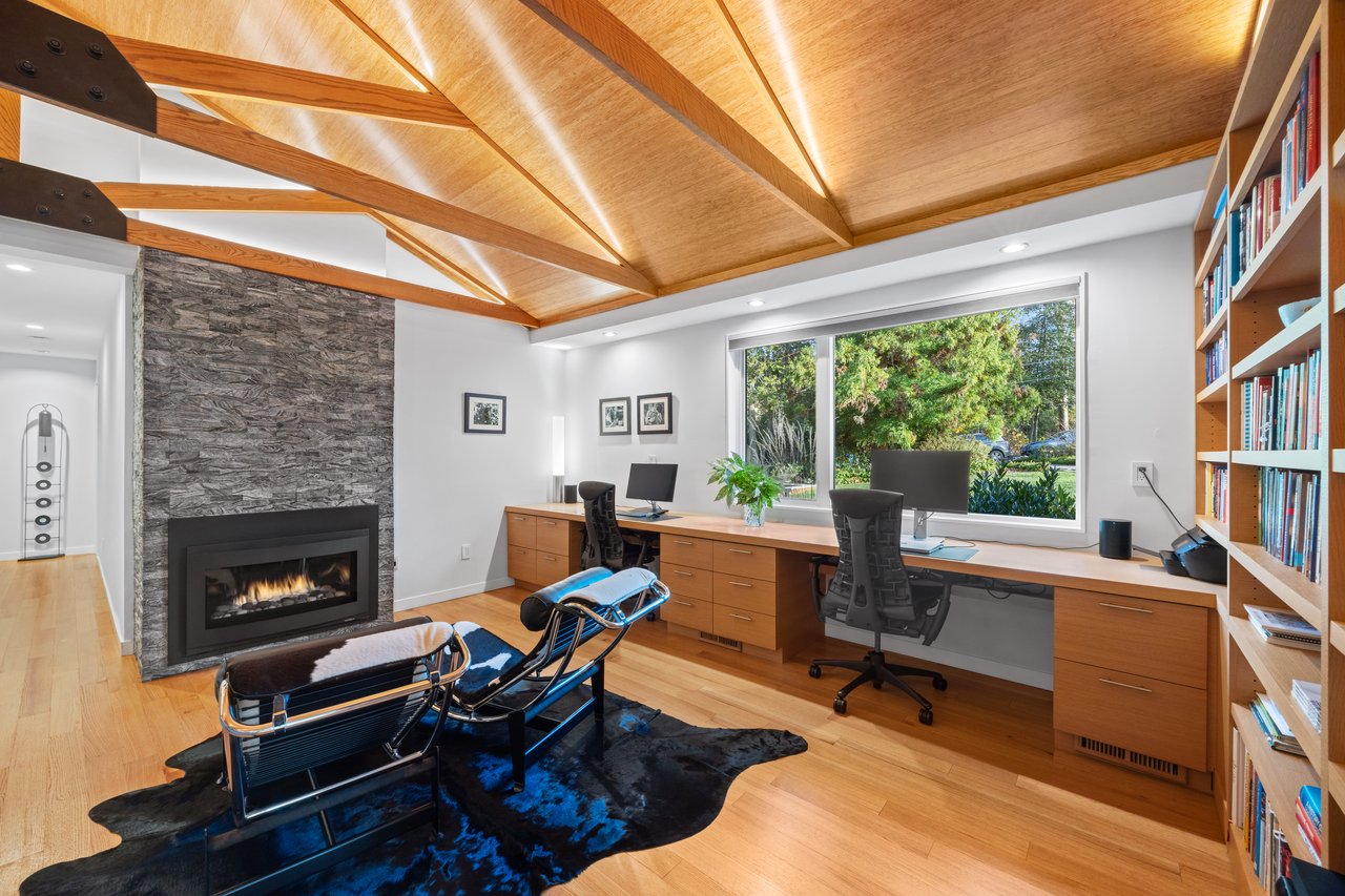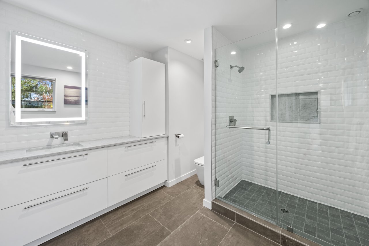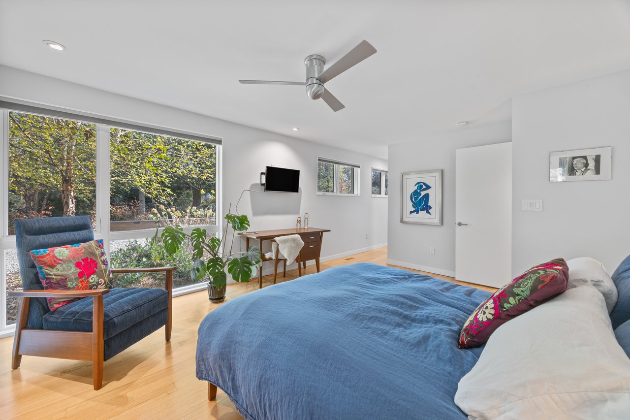 Inside, over 3,800 square feet of bespoke living space invites you to discover impeccable craftsmanship and understated opulence. Italian porcelain floors with hydronic heat run through the main living, kitchen and dining areas, which are crowned by bamboo ceilings and a sleek linear gas fireplace. The chef’s kitchen is an entertainer’s dream, outfitted with Thermador appliances, two deep sinks, custom cabinetry, and dramatic Black Soapstone waterfall counters.