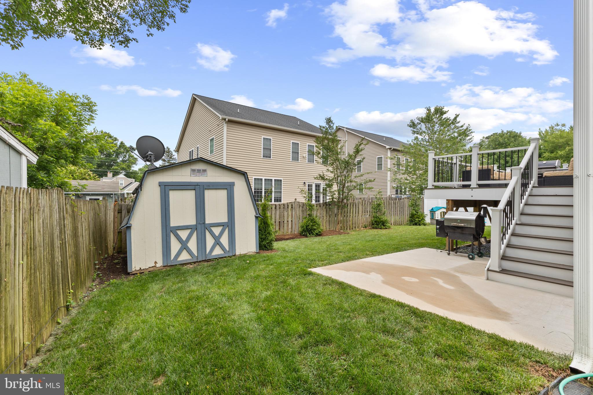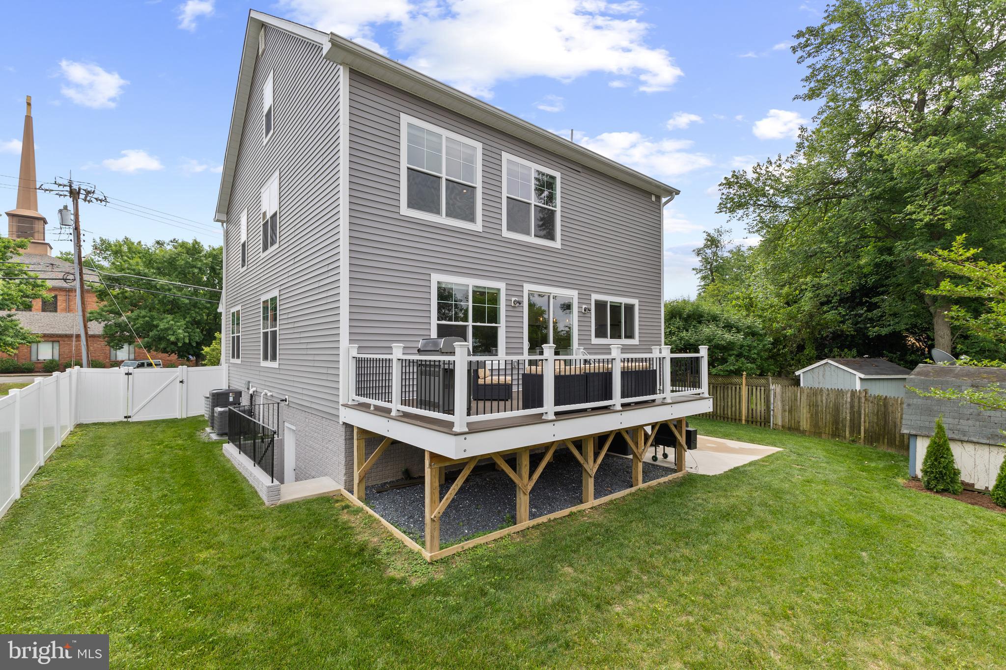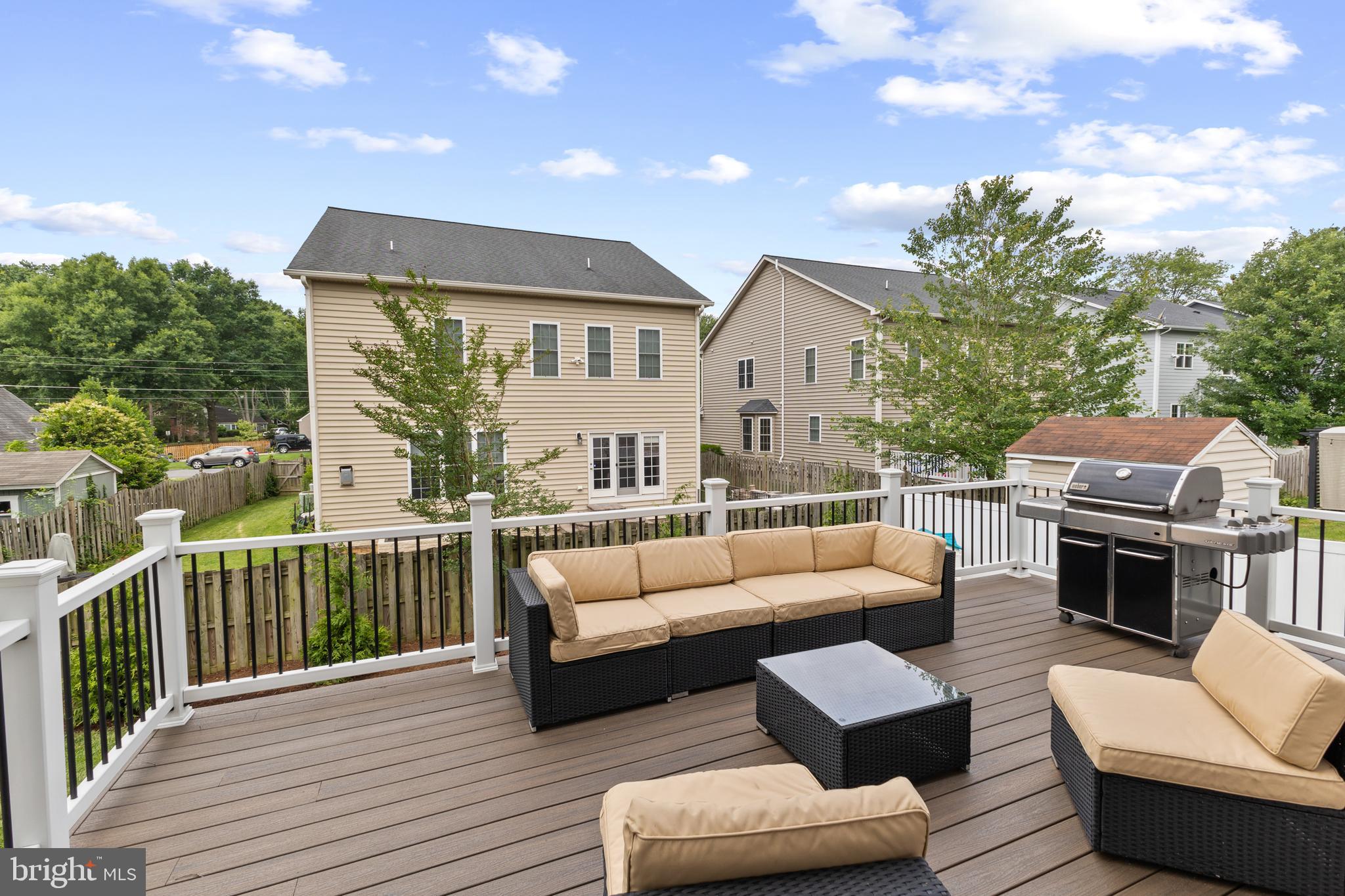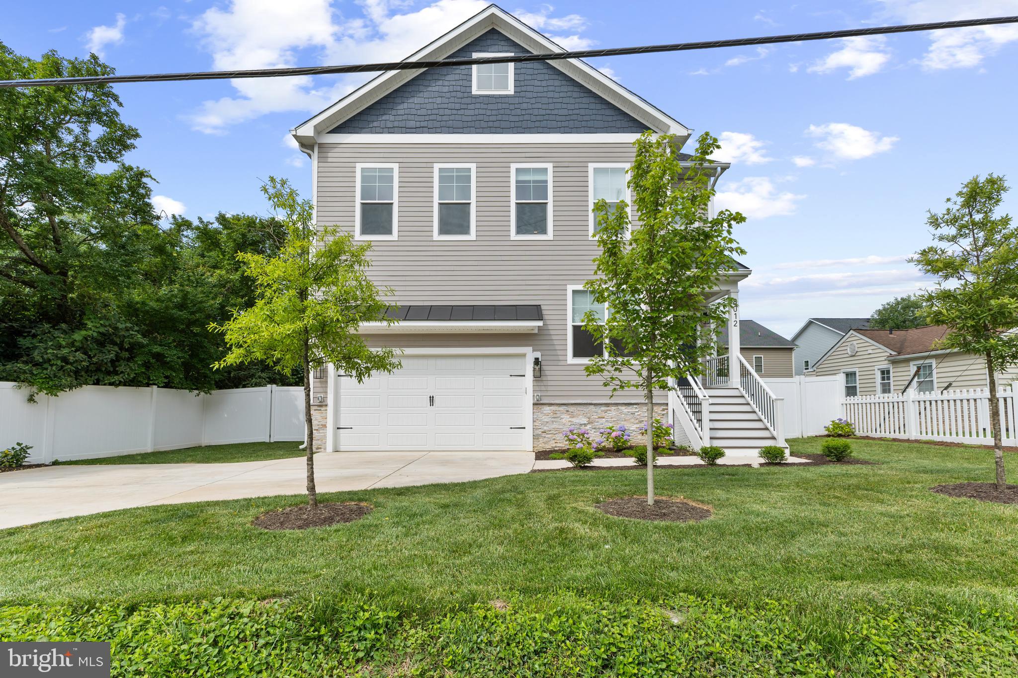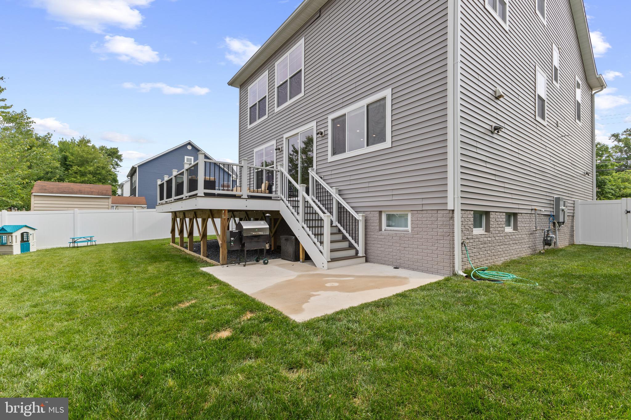 Exterior Features include a poured concrete driveway, fully fenced backyard, expansive trex deck and welcoming front porch, concrete patio, hardie and vinyl siding, stacked stone front, landscaped yard, double pane jeld wen windows.
