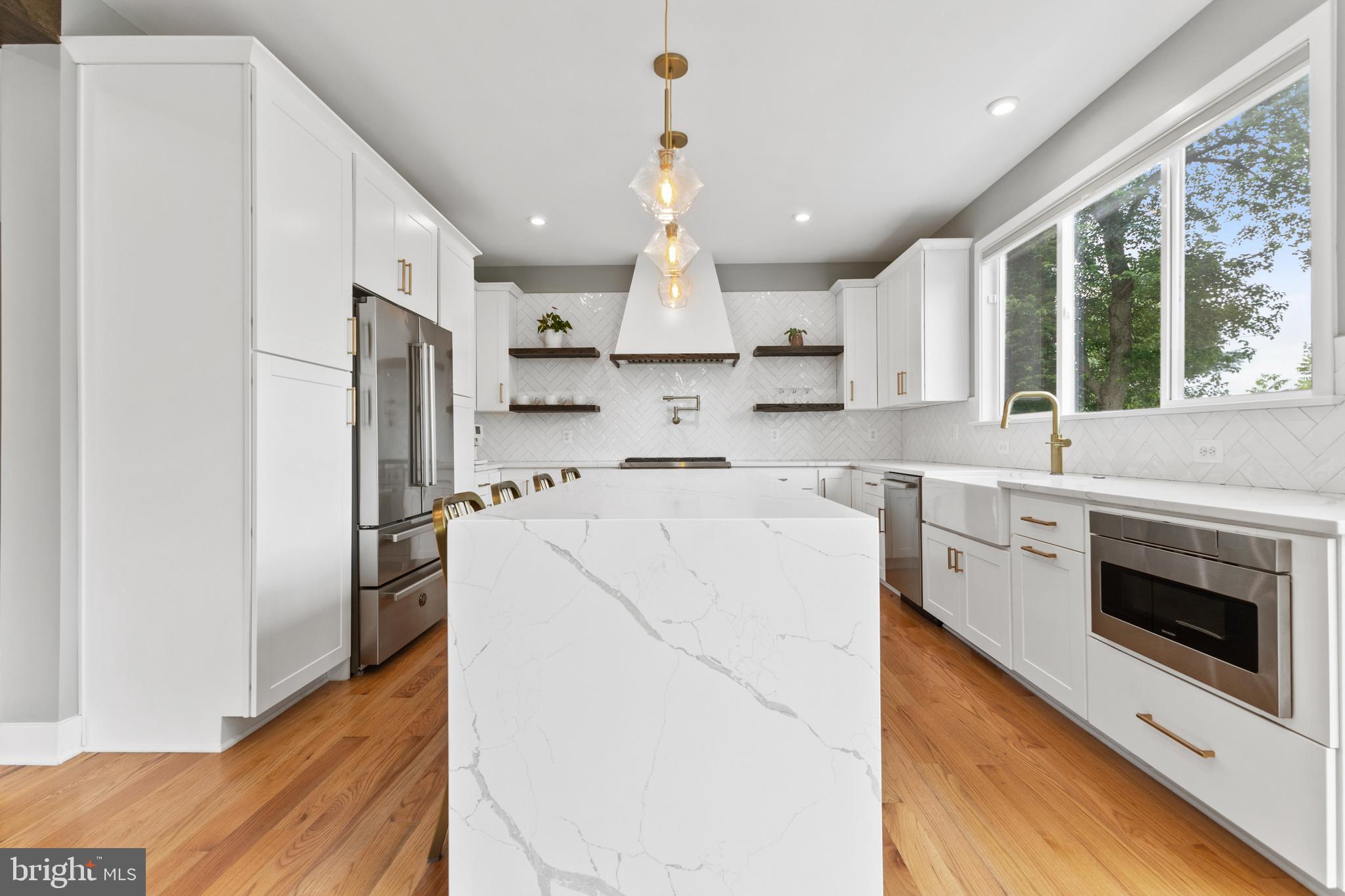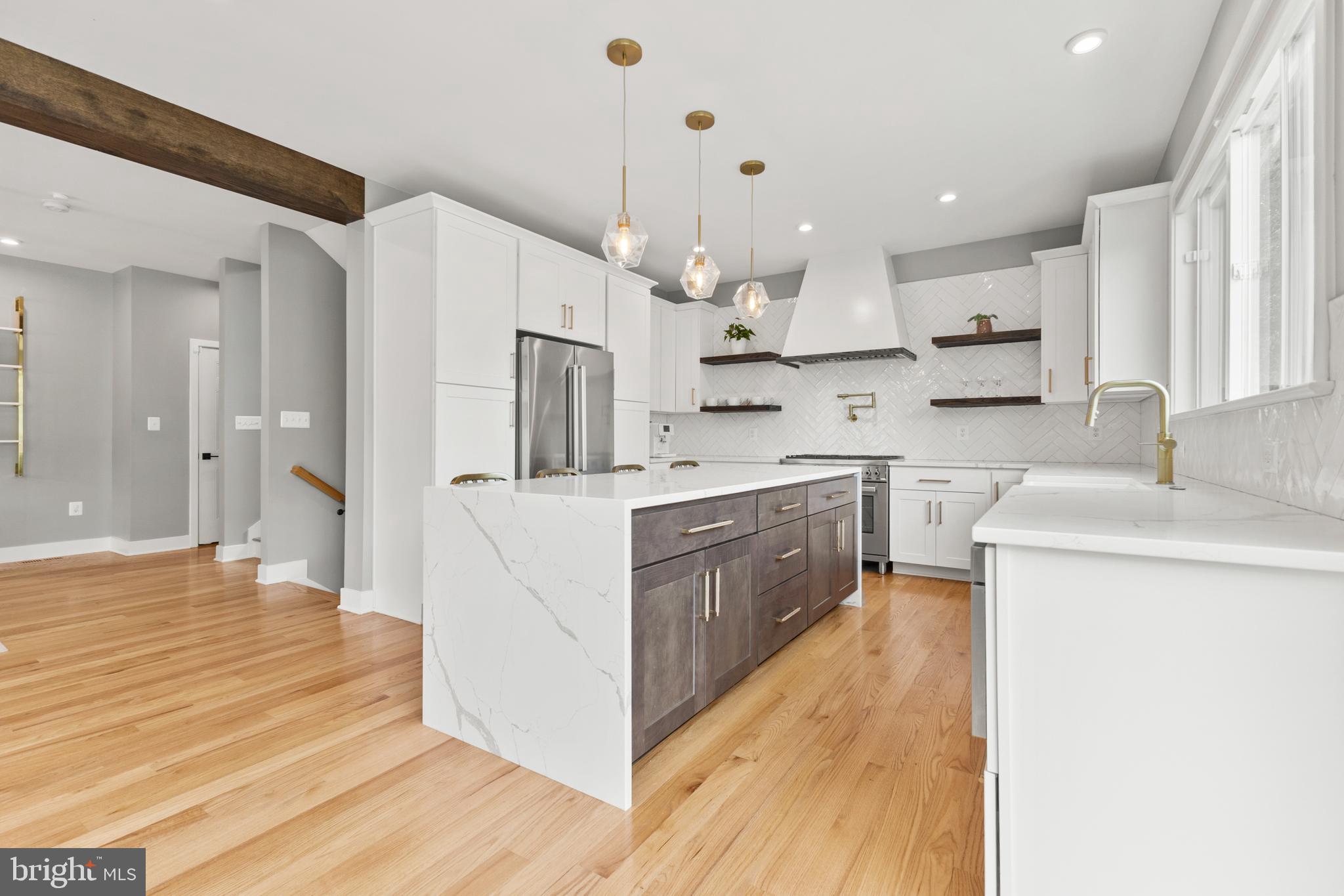 Bertazzoni 36 inch dual fuel range - 6 gas burners w/ electric oven with custom range hood, 4 open shelves, and pot filler. 30 inch white fireclay farm sink, quartz countertops with waterfall island, Wolf brand soft close cabinet, West Elm Pendant lights, oversized subway backsplash laid herringbone, Bertazzoni 4 door fridge and dishwasher.
