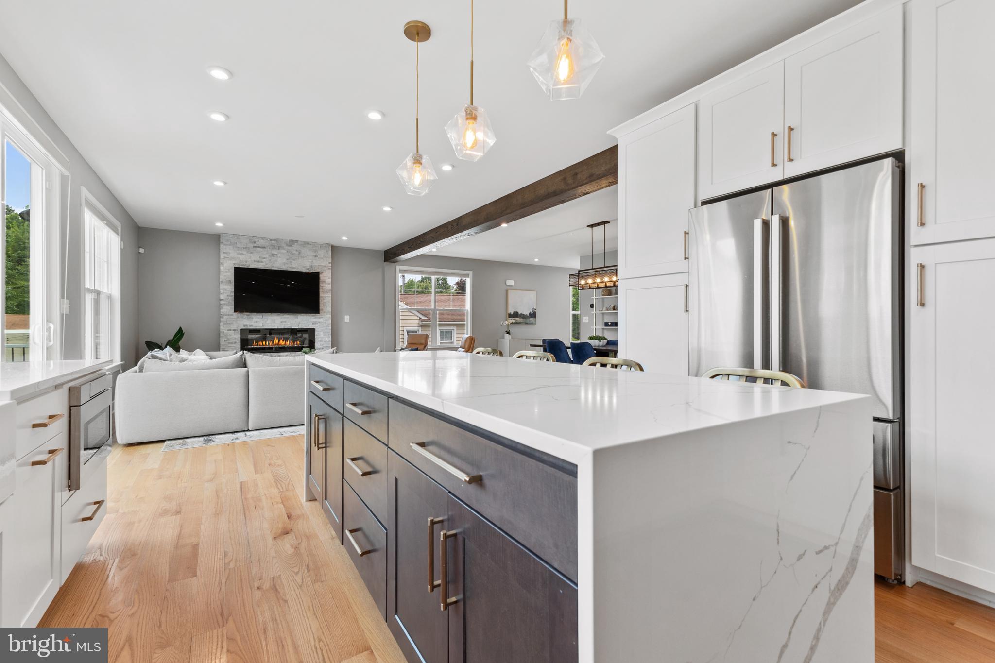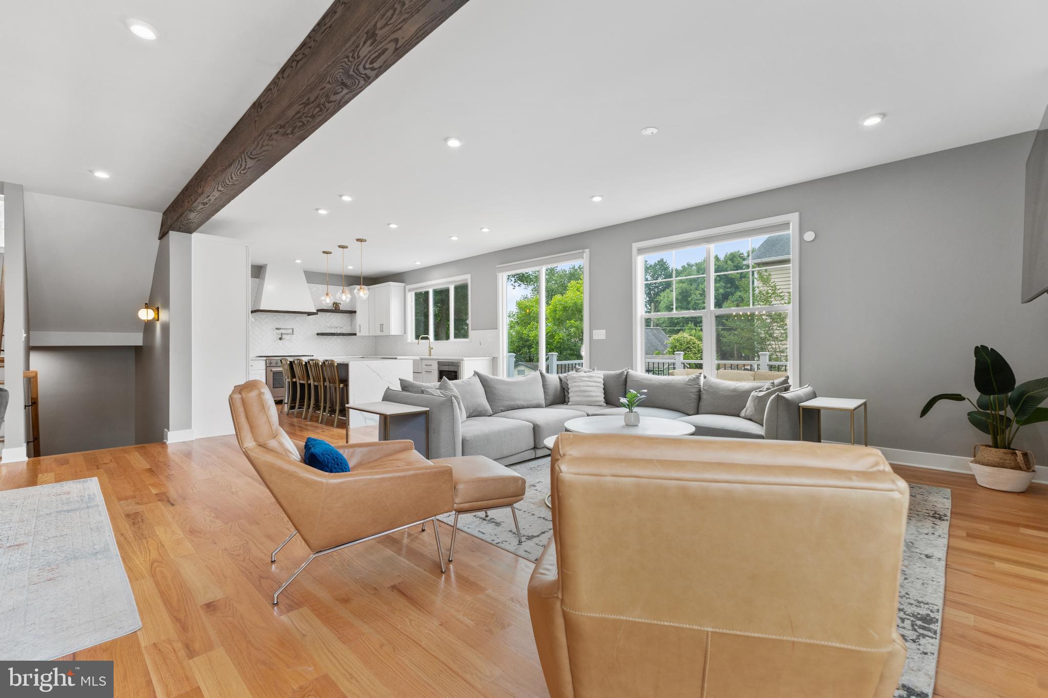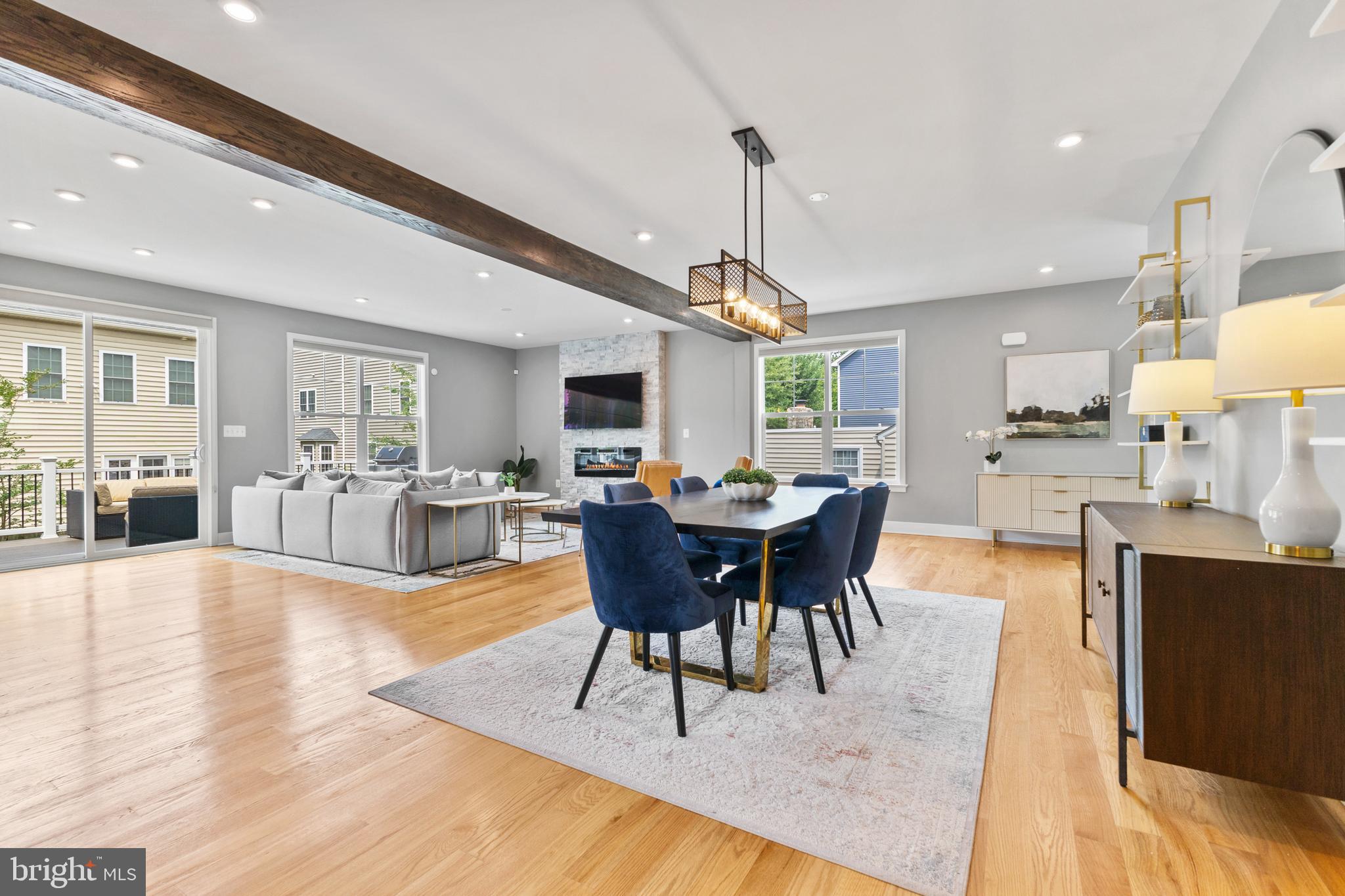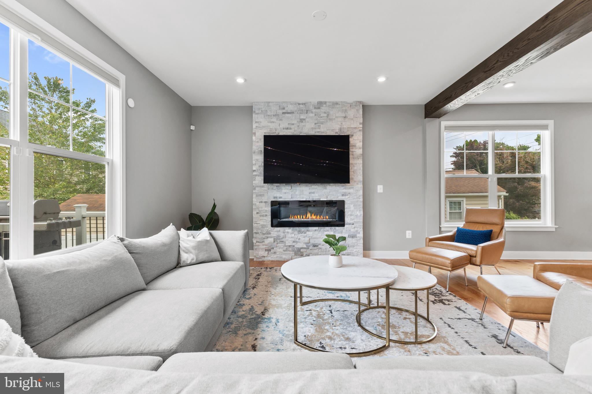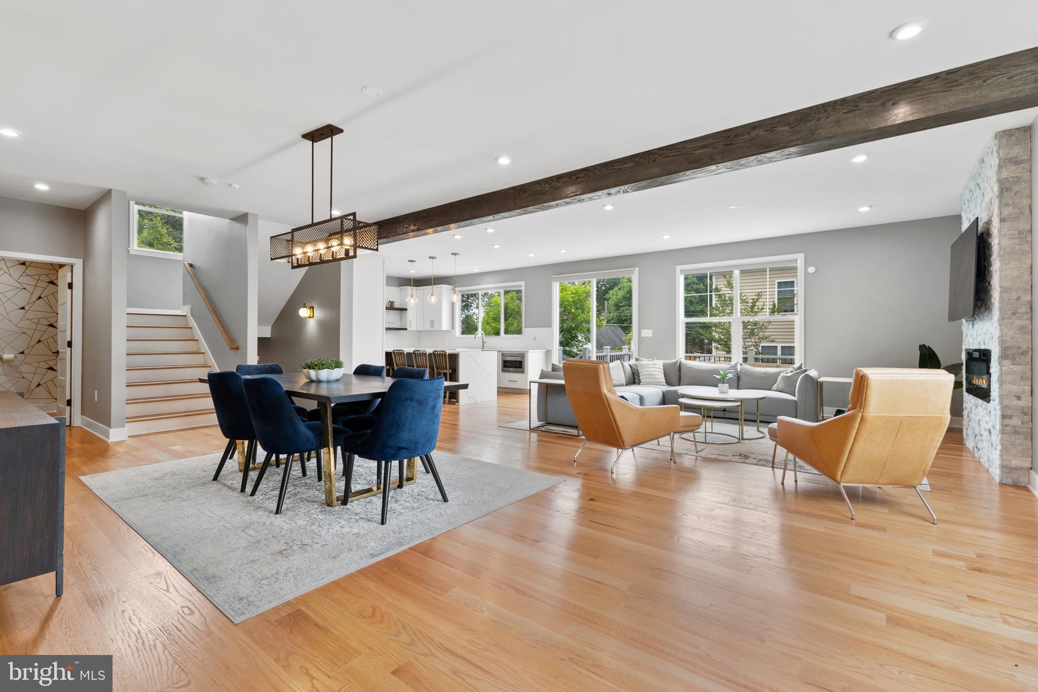 Main level also offers a stacked stone accent wall with fireplace, exposed wood beams, sunny office, charming powder room.