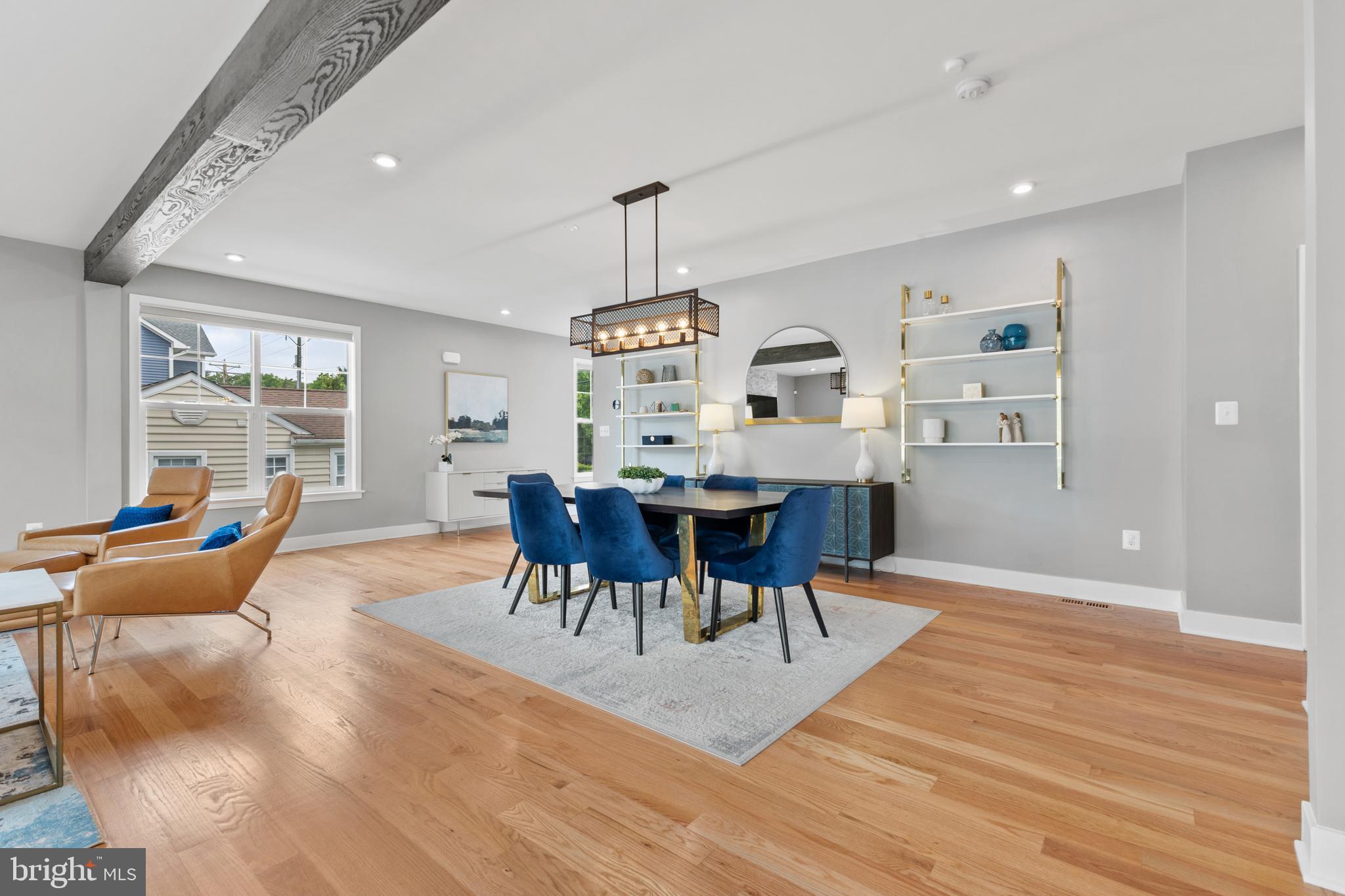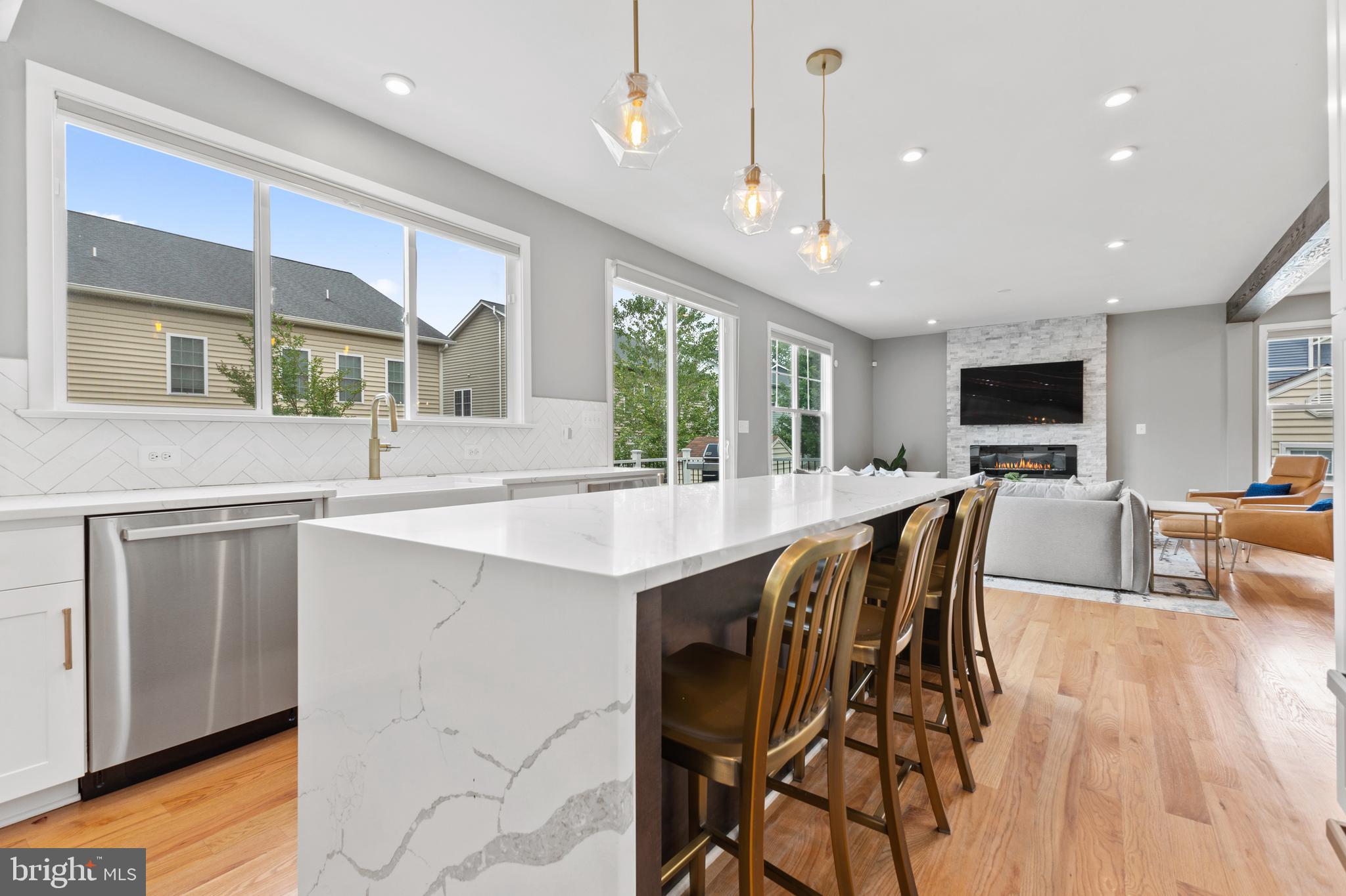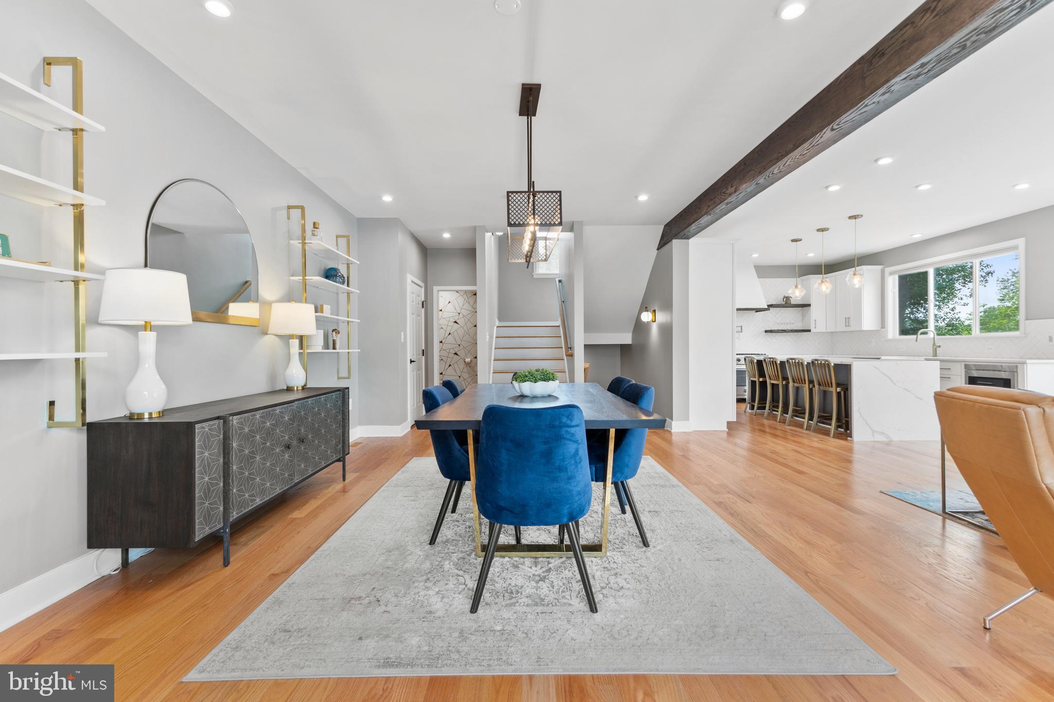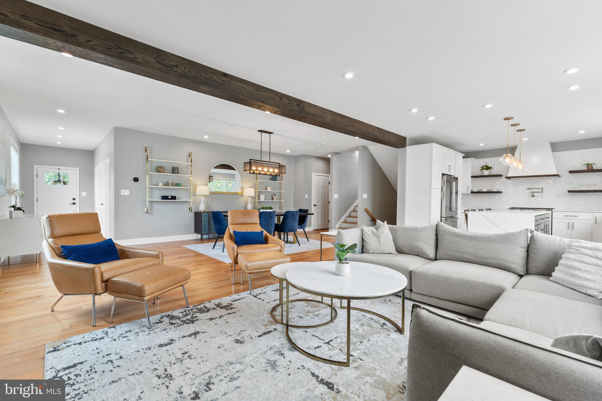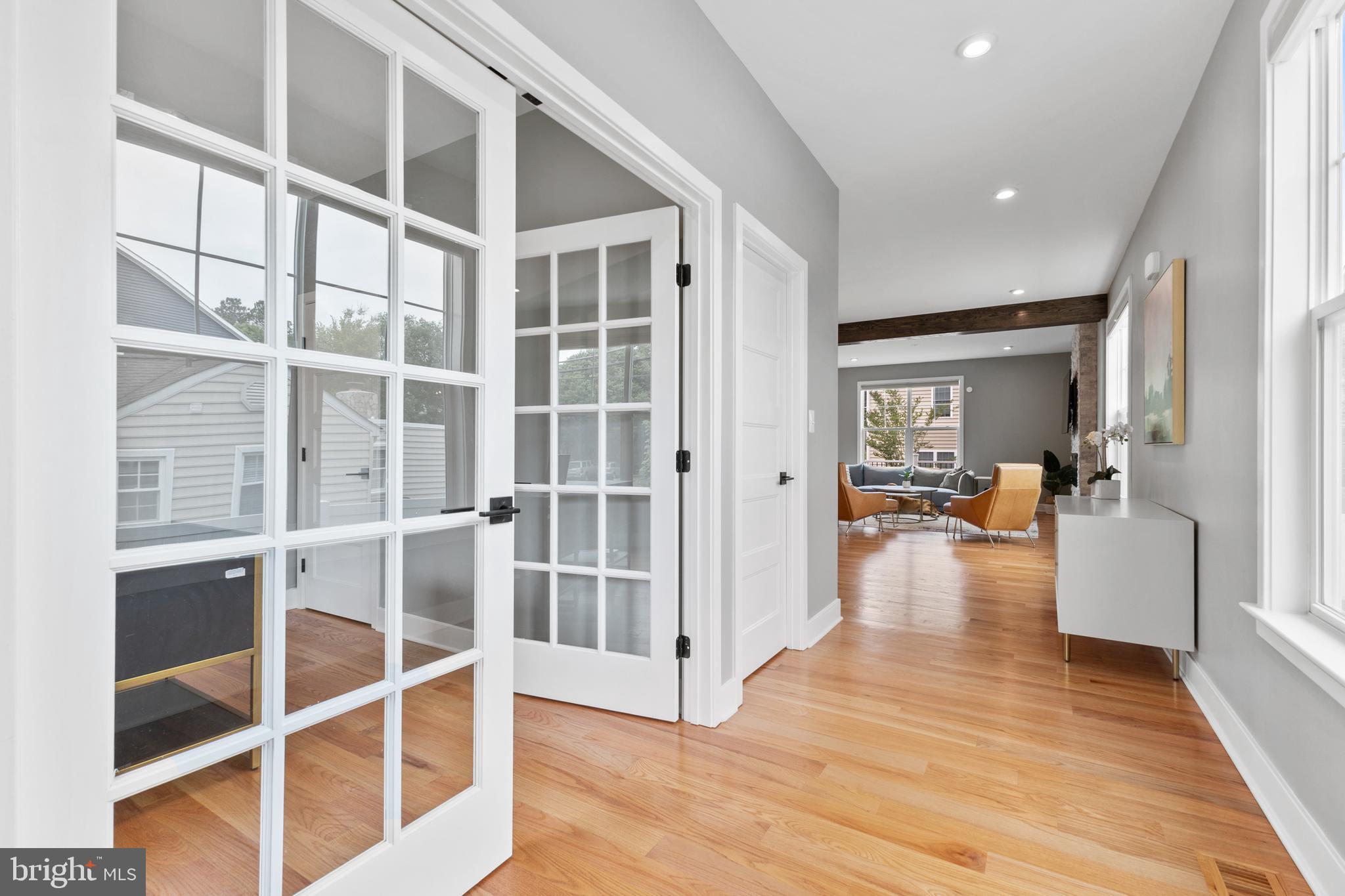 Main level also offers a stacked stone accent wall with fireplace, exposed wood beams, sunny office, charming powder room.