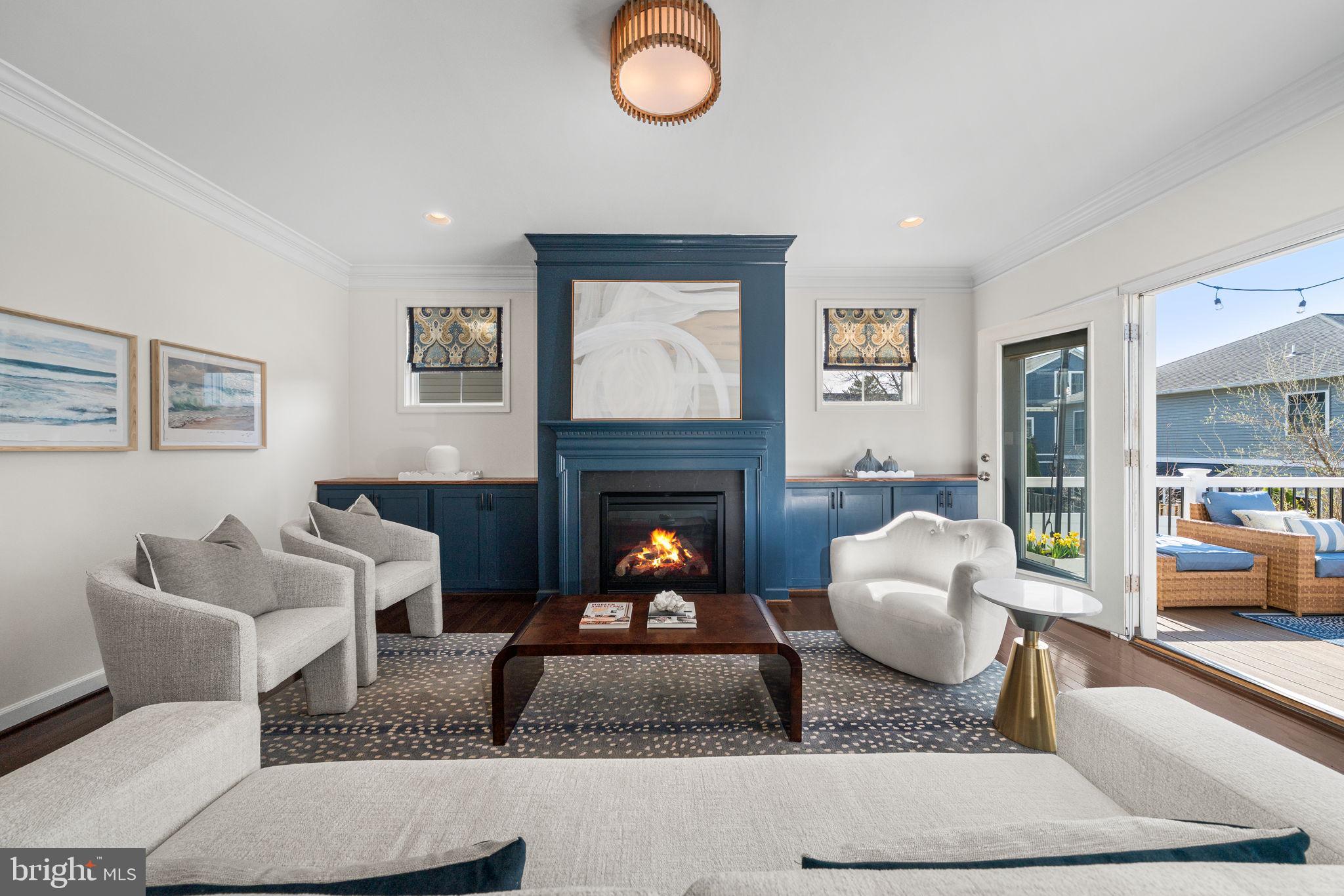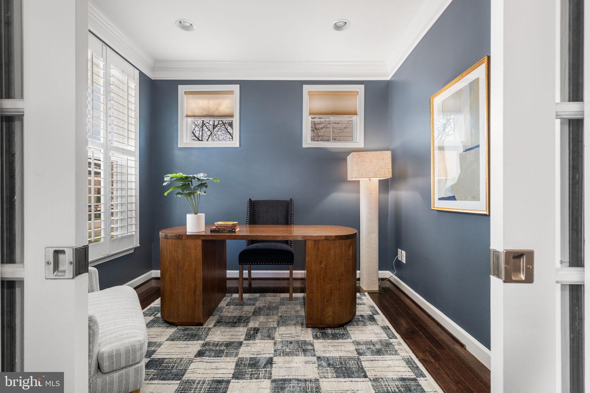 From the moment you arrive, the covered flagstone front porch with classic columns sets a welcoming tone. Inside, the main level offers both function and flow, featuring a private front office with pocket doors just off the entry, perfect for working from home, along with a formal dining room adorned with elegant wainscoting and designer wallpaper, ideal for hosting holidays and special gatherings. Plantation shutters across the front of the home add both charm and privacy. The open-concept kitchen, breakfast area, and family room create a light-filled gathering space anchored by a wall of glass and doors that seamlessly connect to the outdoors. Custom built-ins, detailed trim work, crown molding, and designer lighting throughout add layers of warmth and sophistication, while hardwood floors span the main level.