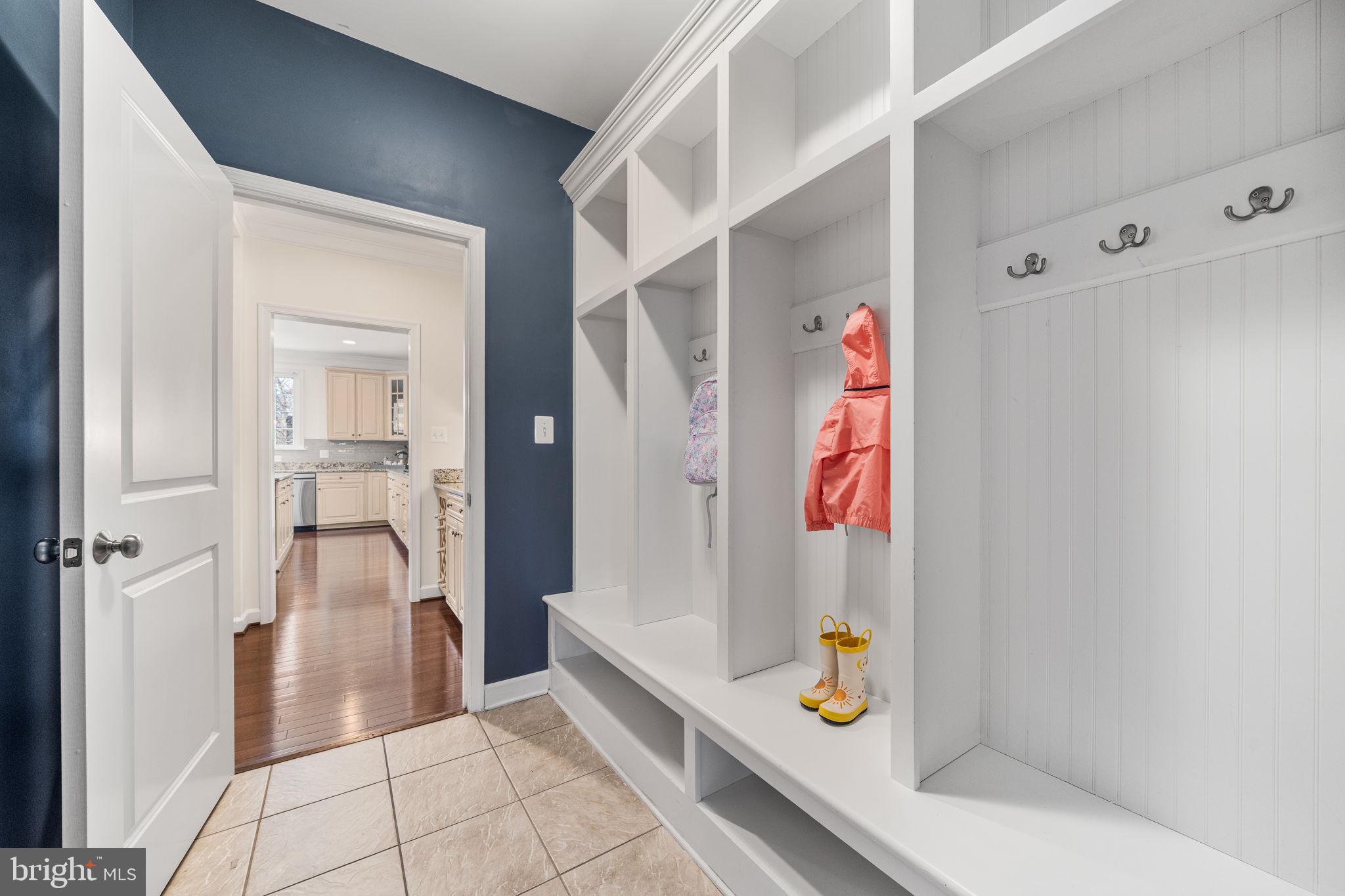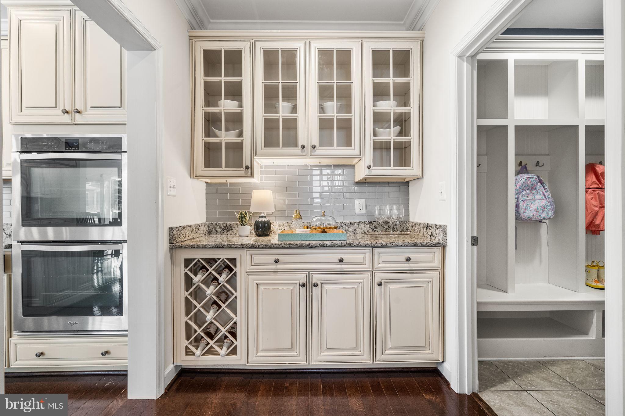 The kitchen is both stylish and functional, featuring painted maple cabinetry, granite countertops, a gray glass subway tile backsplash, and an oversized island perfect for casual meals and entertaining. Recent appliance updates, including an LG ThinQ refrigerator, dishwasher, and microwave, add modern convenience. Just off the kitchen, a thoughtfully designed mudroom with custom cubbies keeps daily life beautifully organized.