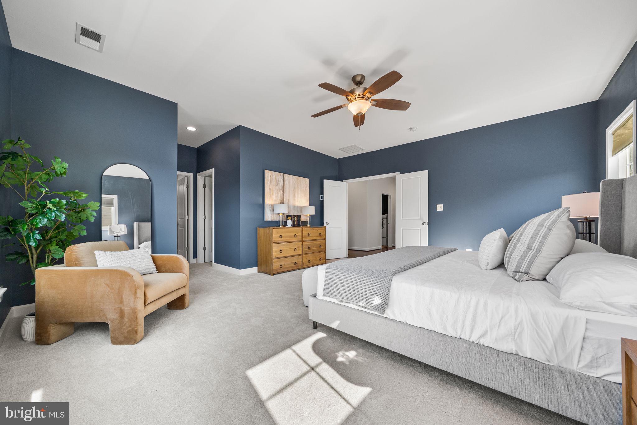 Upstairs, the primary suite is a serene escape with two walk-in closets and a refreshed bath with updated mirrors, shelving, and lighting. Three additional bedrooms offer generous space, complemented by a well-appointed upper-level laundry room with cabinetry, sink, and Samsung washer and dryer. New carpet throughout the upper level adds a fresh, move-in-ready feel.
