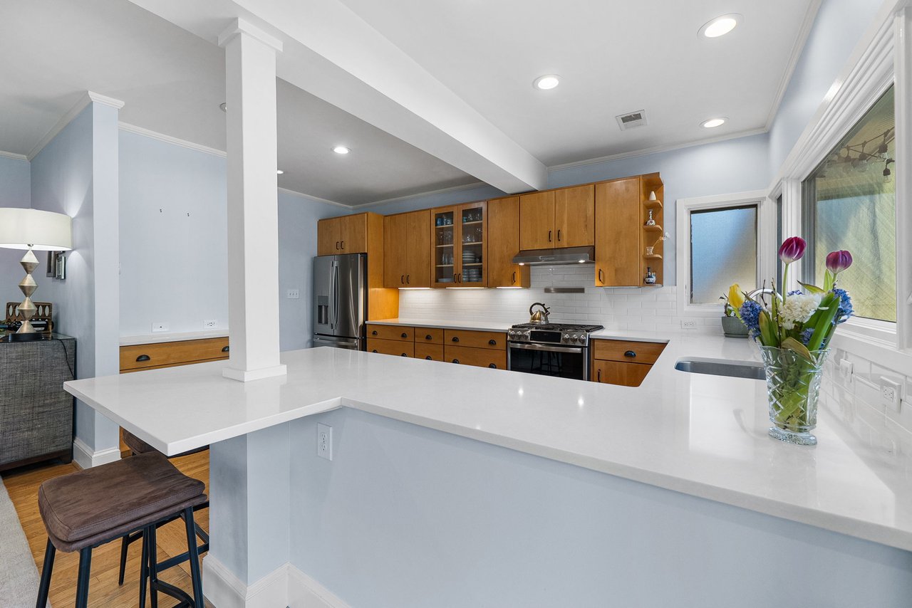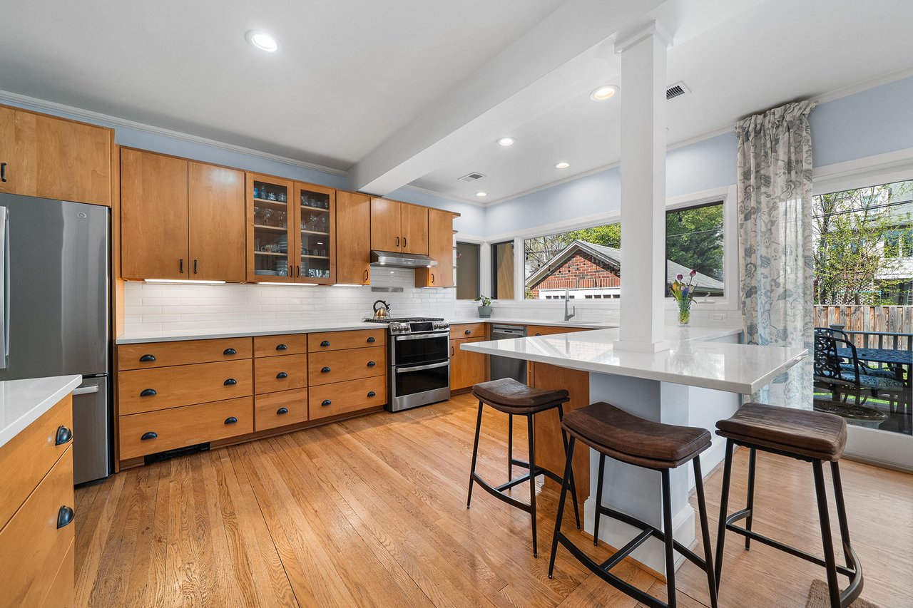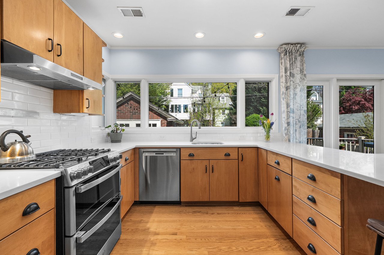 The main level unfolds with effortless flow, from the formal dining room into a comfortable sitting area where French doors open to an expansive deck perfect for seamless indoor-outdoor gatherings. The sun-drenched kitchen is both elegant and highly functional, featuring quartz countertops, a crisp white tile backsplash, stainless steel appliances, under-cabinet lighting, and generous space for casual dining and connection. Along the entire rear of the home, a wall of windows and doors spans the main level, flooding the space with natural light and creating a beautiful connection to the outdoors. A private main-level study provides the ideal work-from-home retreat.