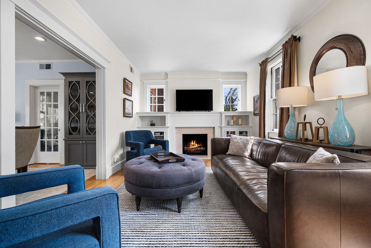 A welcoming foyer introduces a gracious living room anchored by a fireplace and custom built-ins, creating a warm and inviting setting for both everyday living and entertaining. Original crystal doorknobs throughout the home add a layer of historic charm, while recessed lighting and crown molding spanning the main and upper levels elevate the home’s overall finish and sophistication. A thoughtfully designed 2017 addition brings a highly functional mudroom for daily comings and goings, complemented by a stylishly renovated powder room.