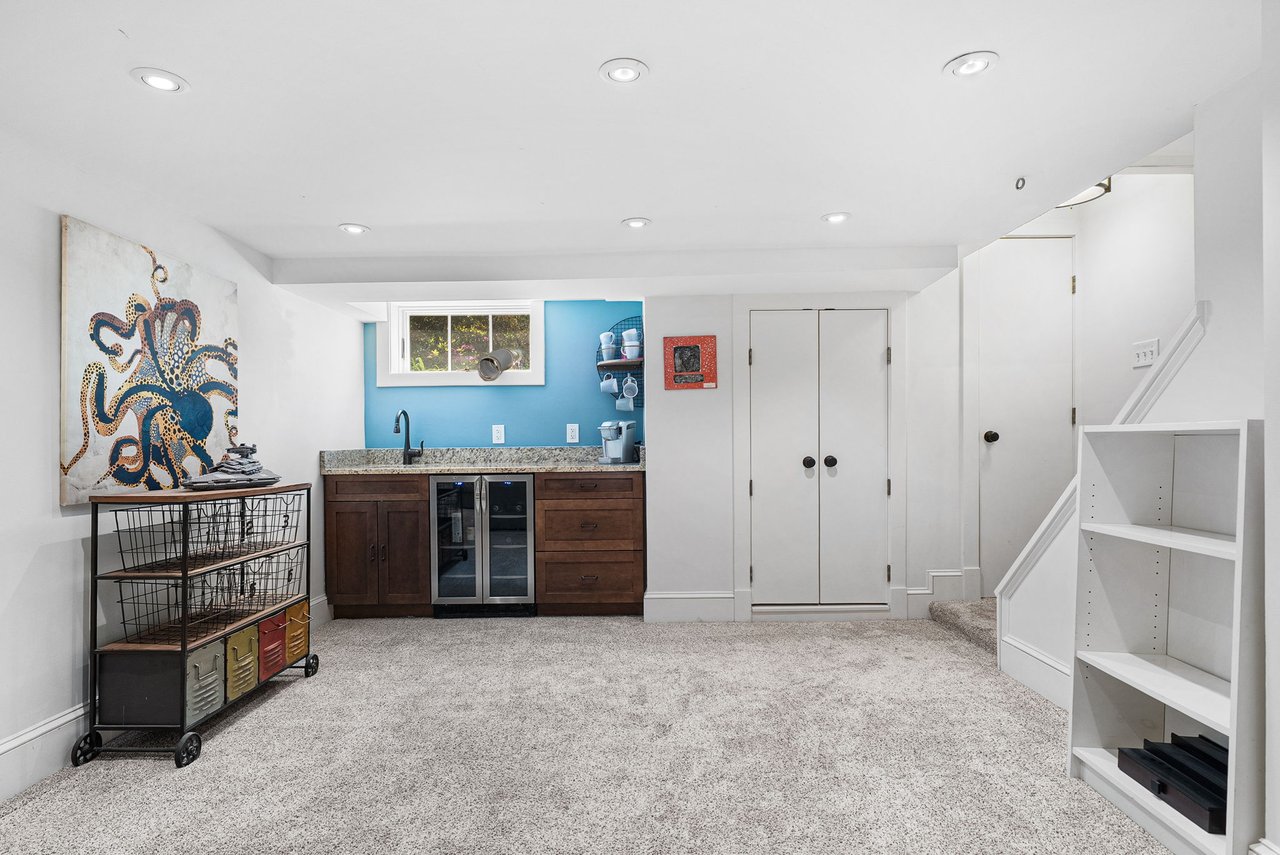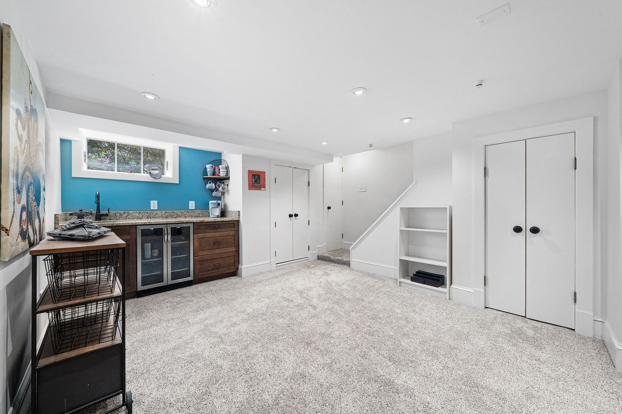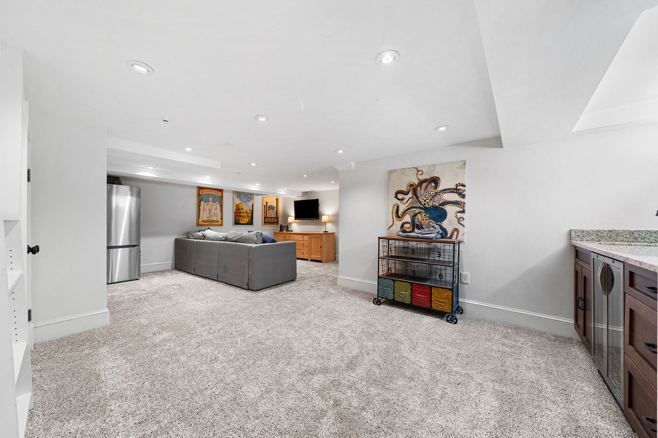 The lower level has been thoughtfully renovated to include a full bath, expansive recreation and game area, dedicated fitness room, and an upgraded laundry space. A custom built-in bar with beverage refrigerator adds a sophisticated touch, making this level ideal for entertaining.