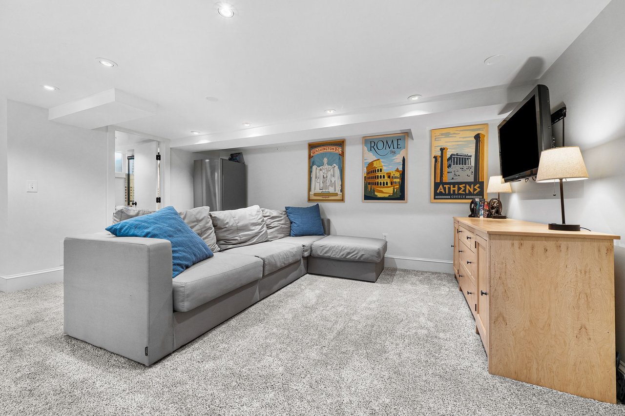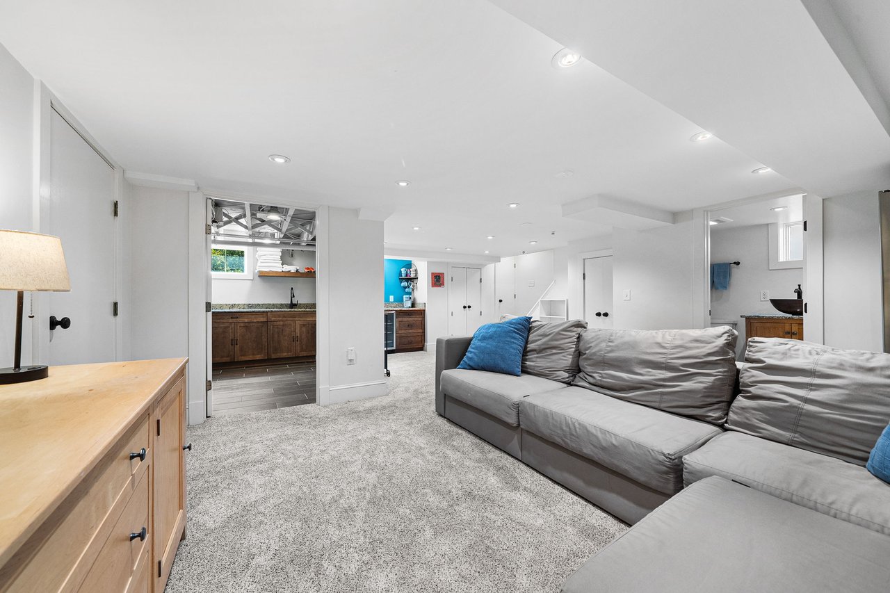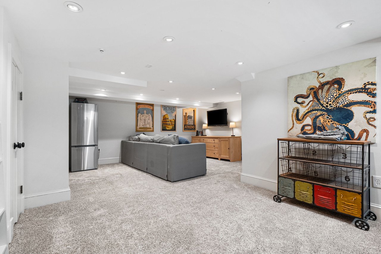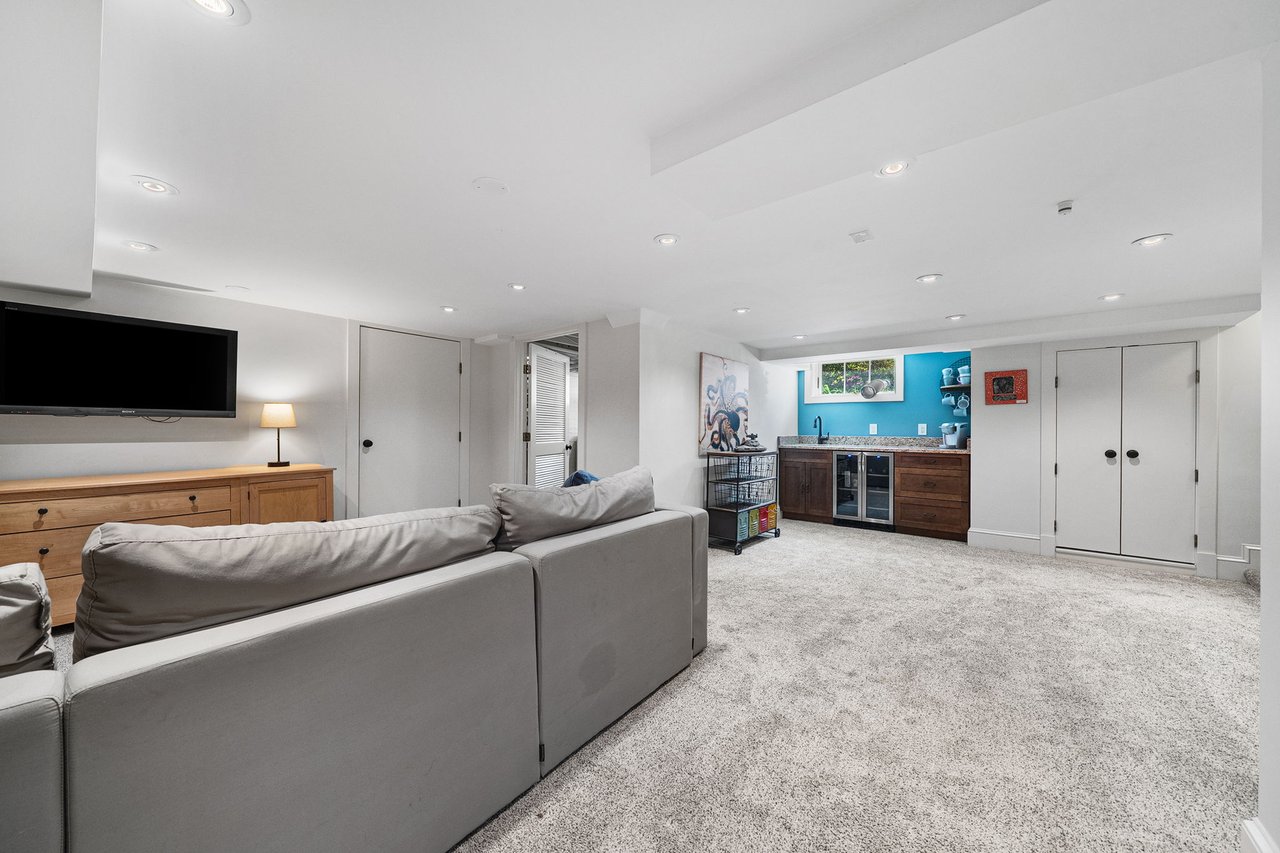 The lower level has been thoughtfully renovated to include a full bath, expansive recreation and game area, dedicated fitness room, and an upgraded laundry space. A custom built-in bar with beverage refrigerator adds a sophisticated touch, making this level ideal for entertaining.